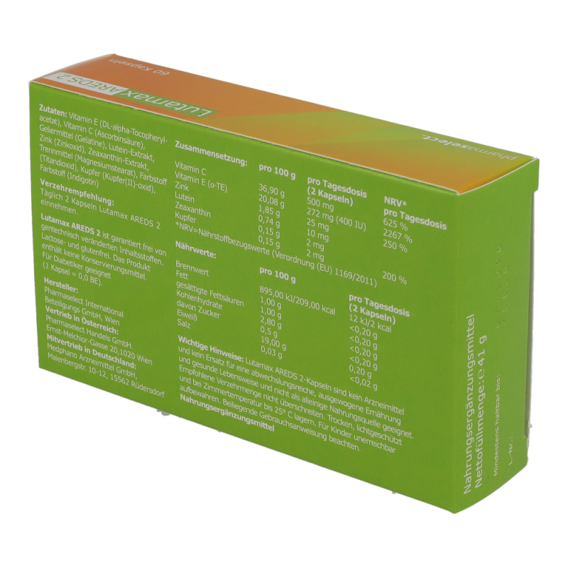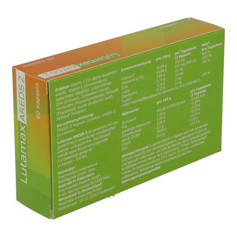 Lutamax Areds 2 Weichkapseln dienen der diätetischen Behandlung von altersbedingter Makuladegeneration (AMD). Sie enthalten eine besondere Kombination von Lutein, dem Lutein-Isomer Zeaxanthin, sowie von antioxidativ wirksamen Vitaminen und Mineralien, die die weitere Verschlechterung einer fortgeschrittenen AMD hemmen können.