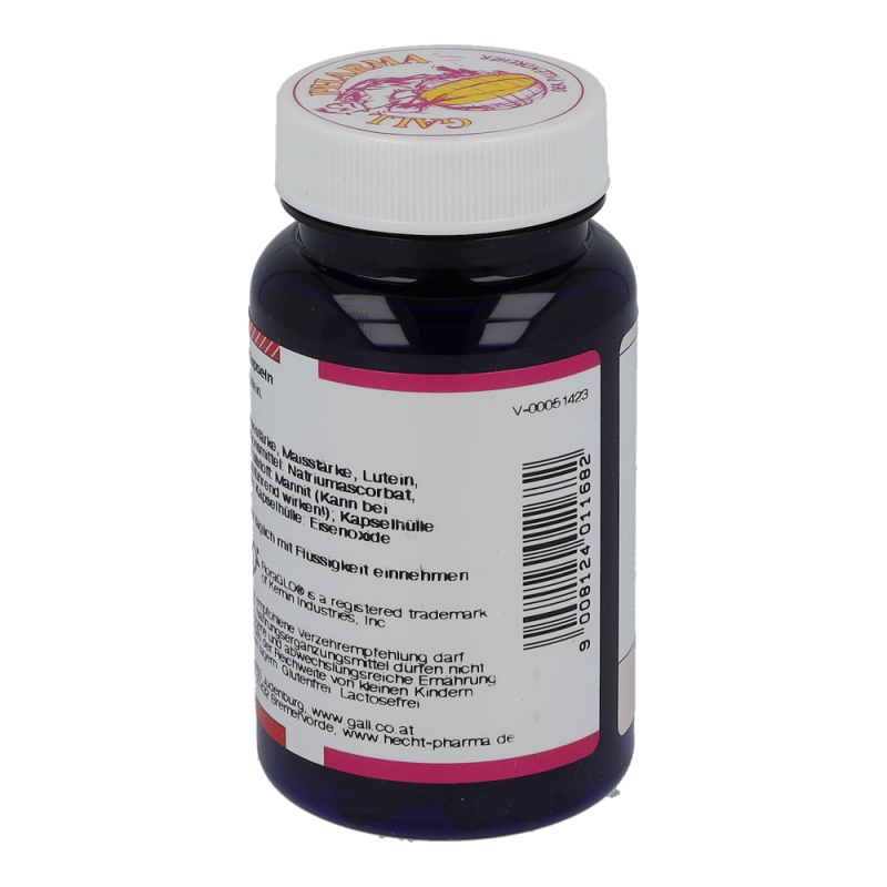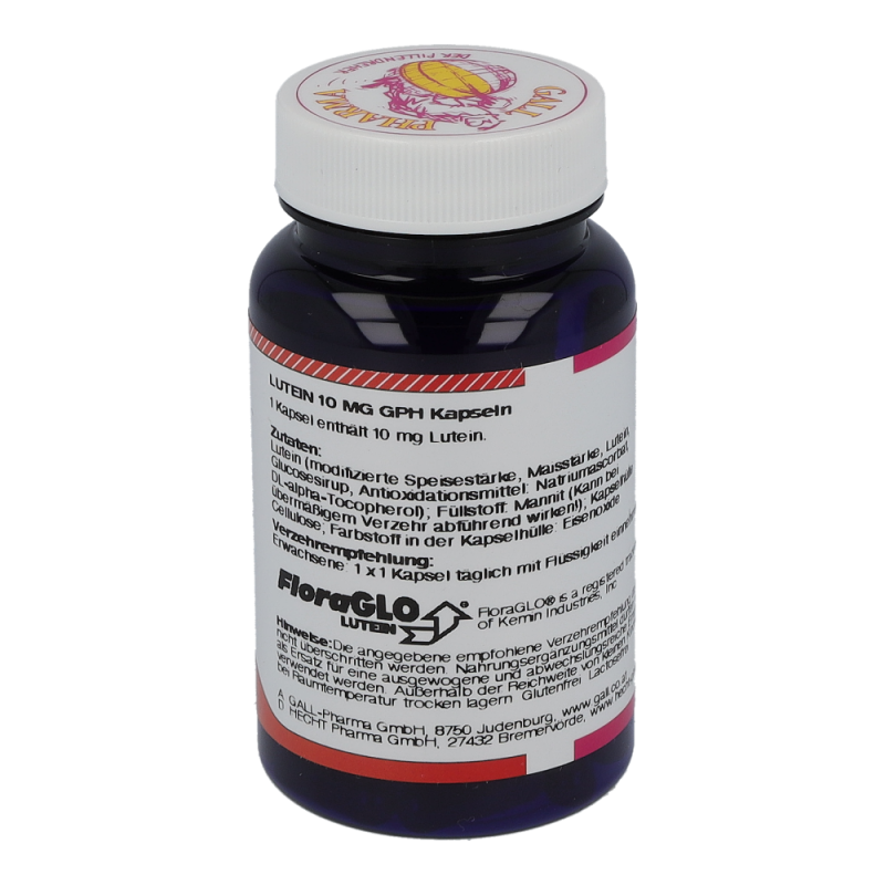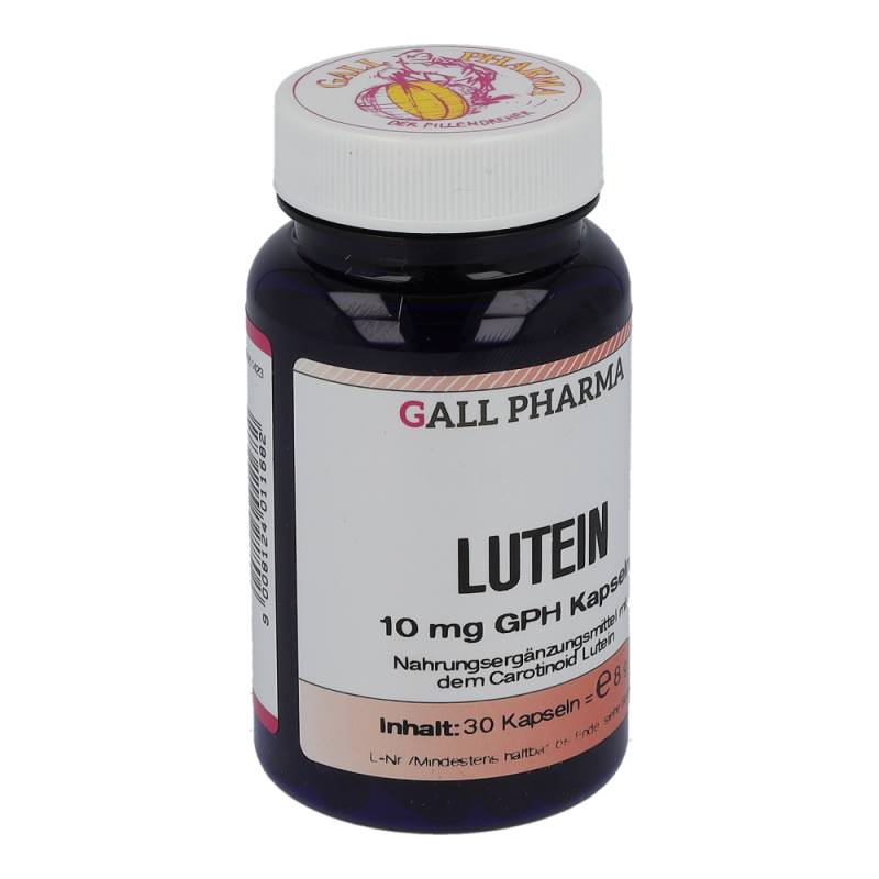 Gall Pharma Lutein 10 mg Kapseln 30 Stk. enthalten 10 mg Lutein.Die gelben Carotinoide Lutein und Zeaxanthin schützen das Auge vor Schäden durch (Sonnen-) Licht. Lutein und Zeaxanthin kommen in besonders hohen Konzentrationen im Gelben Fleck, in der Netzhaut des Auges, vor. Im Gelben Fleck werden die beiden Carotinoide selektiv angereichert. Lutein sorgt in der Makula für scharfes Sehen.