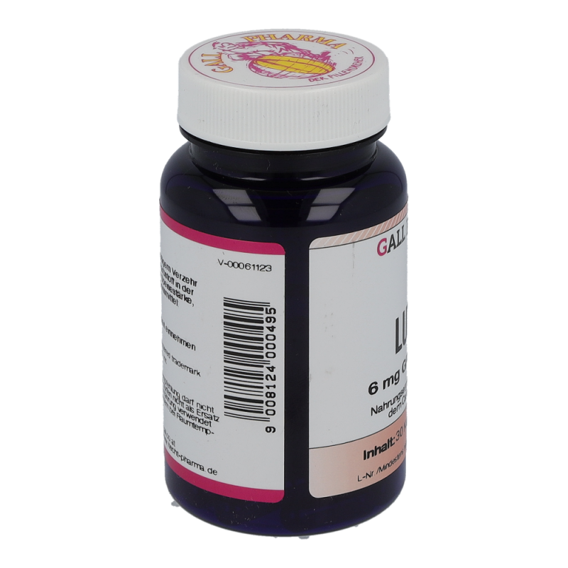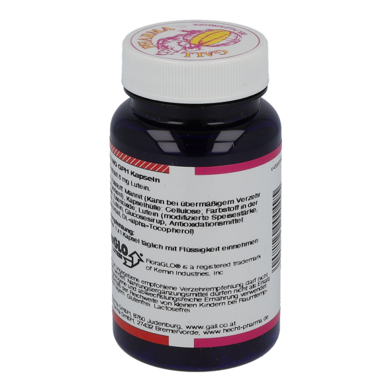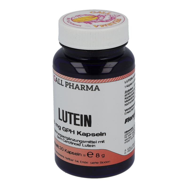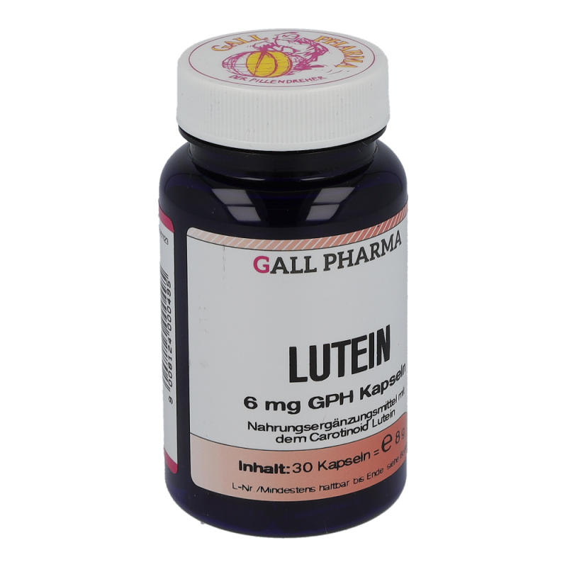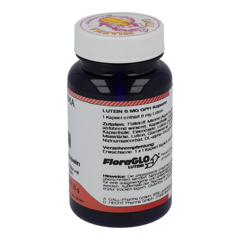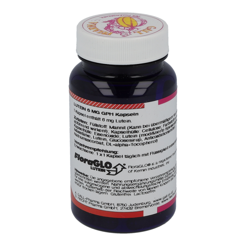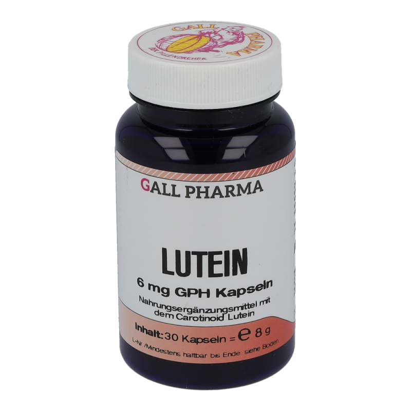 Gall Pharma Lutein 6 mg Kapseln enthalten 6 mg Lutein. Die gelben Carotinoide Lutein und Zeaxanthin schützen das Auge vor Schäden durch (Sonnen-) Licht.