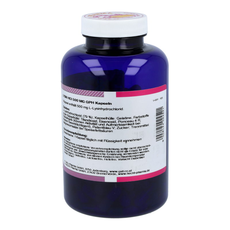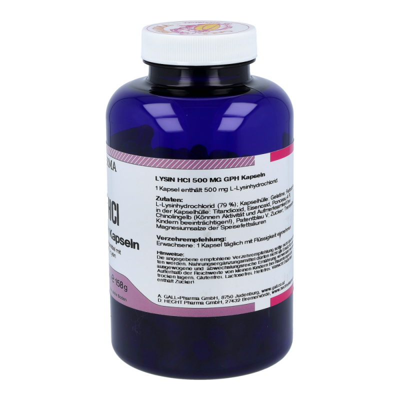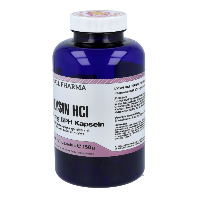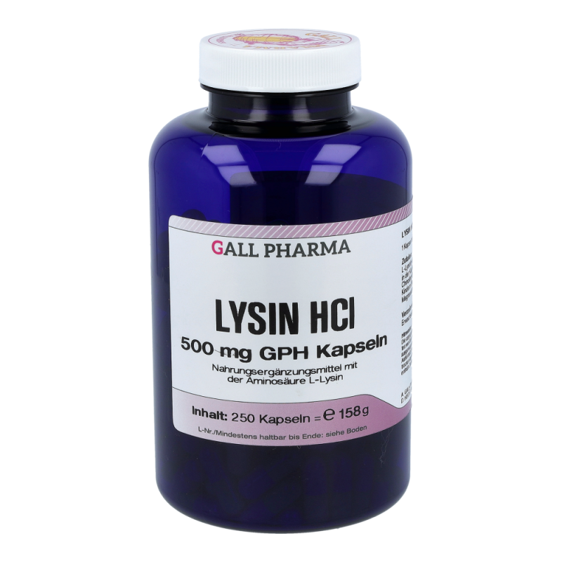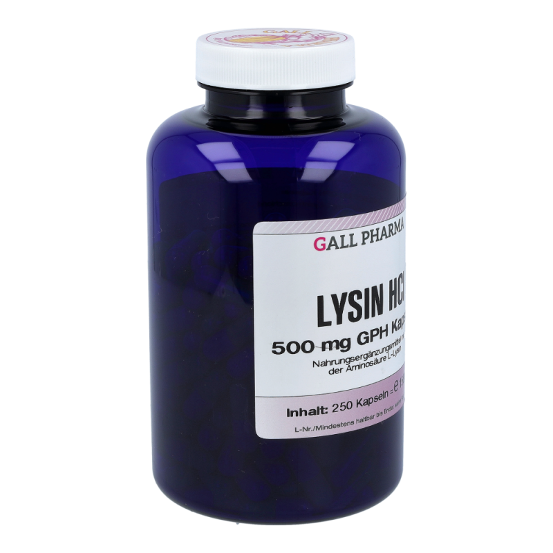 Gall Pharma Lysin HCl 500 mg Kapseln 250 Stk. unterstützen die Wundheilung, stärken die körperliche Abwehr und insbesonders fördern sie die Fieberblasenheilung (Herpes simplex) und ist bedeutend für die Energiebereitstellung. In Kombination mit Vitamin C hat L-Lysin Bedeutung in der Verhinderung von Gefäßverkalkungen – als Standortapotheke bieten wir Ihnen 100 % Sicherheit und ausschließlich Originalprodukte!