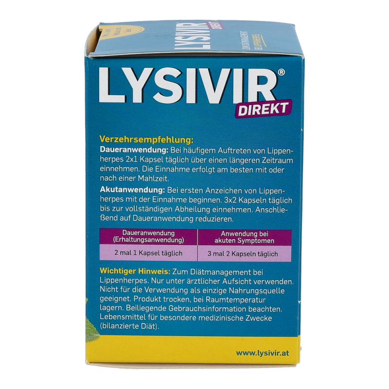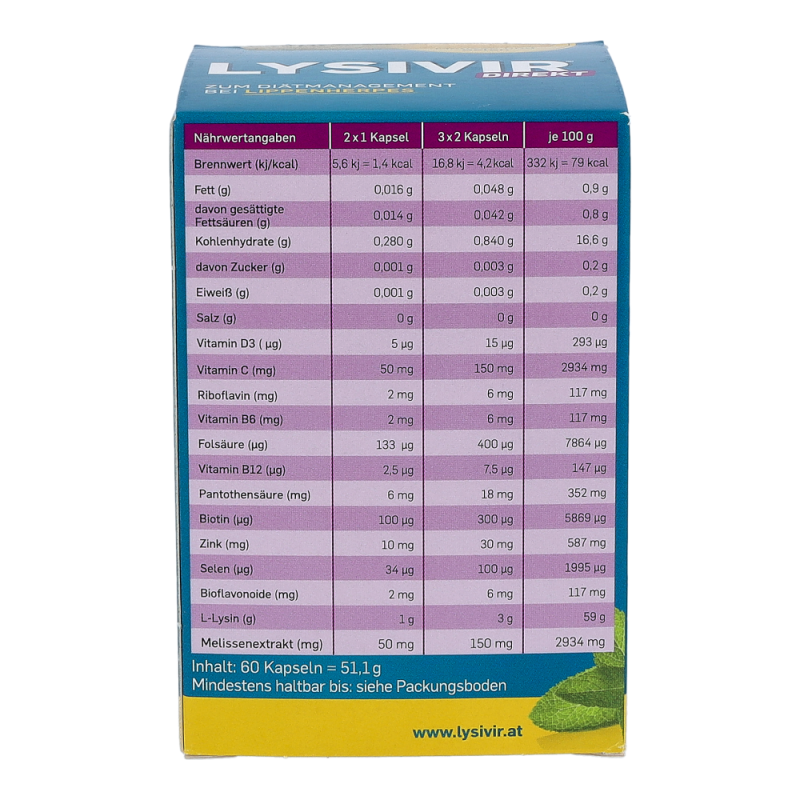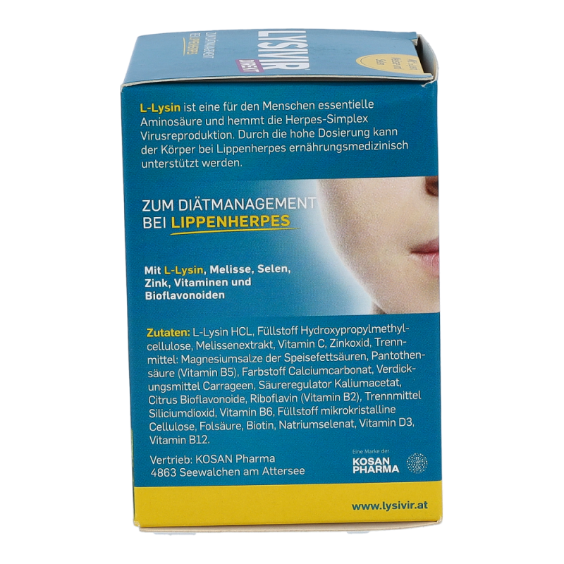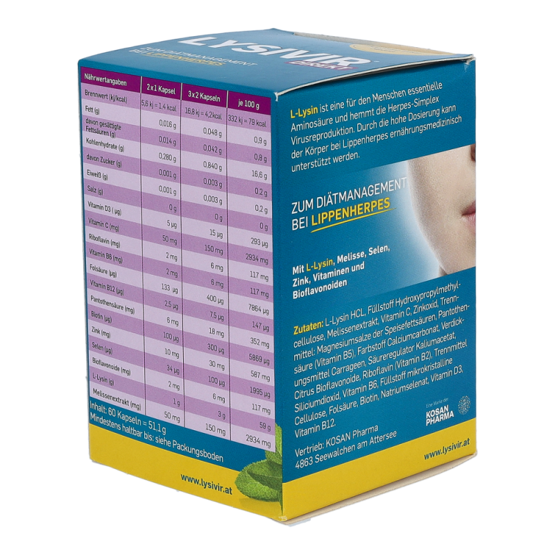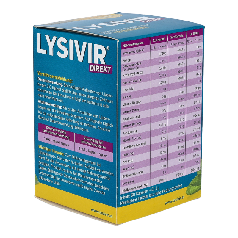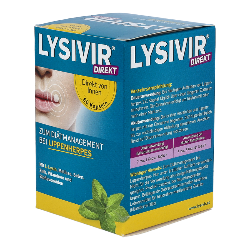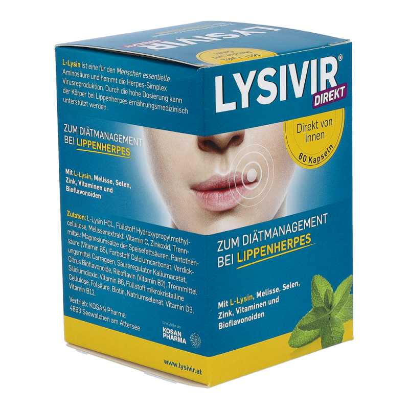 Lysivir Direkt ist eine innovative Kautablette zur Behandlung von Lippenherpes. Die Kautablette enthält eine ernährungsmedizinisch wertvolle Zusammensetzung an hoch dosiertem L-Lysin, Melissenextrakt, Selen, Zink, Vitaminen und Bioflavonoiden.L-Lysin unterstützt den Organismus die Herpes Viren zu stoppen und die Häufigkeit, die Dauer und die Symptome zu reduzieren.Melissenextrakt enthält als unterstützende Komponente wertbestimmende Phenolcarbonsäuren und ätherische Öle. Selen ist bekannt für die Förderung des Austrocknens und Abheilens von Herpesbläschen. Vitamin C, Zink, Vitamin D und Bioflavonoide sowie Folsäure, Vitamin B2, B6, B12 stärken die körpereigene Immunabwehr und unterstützen die Regeneration der Haut.