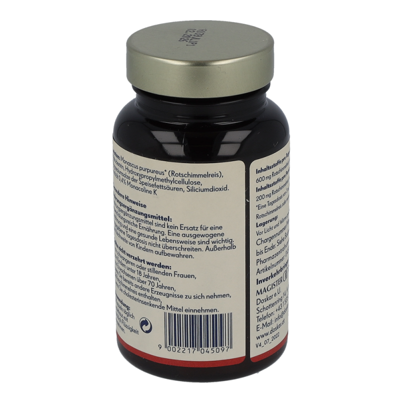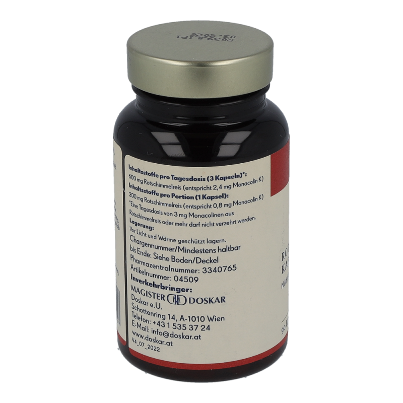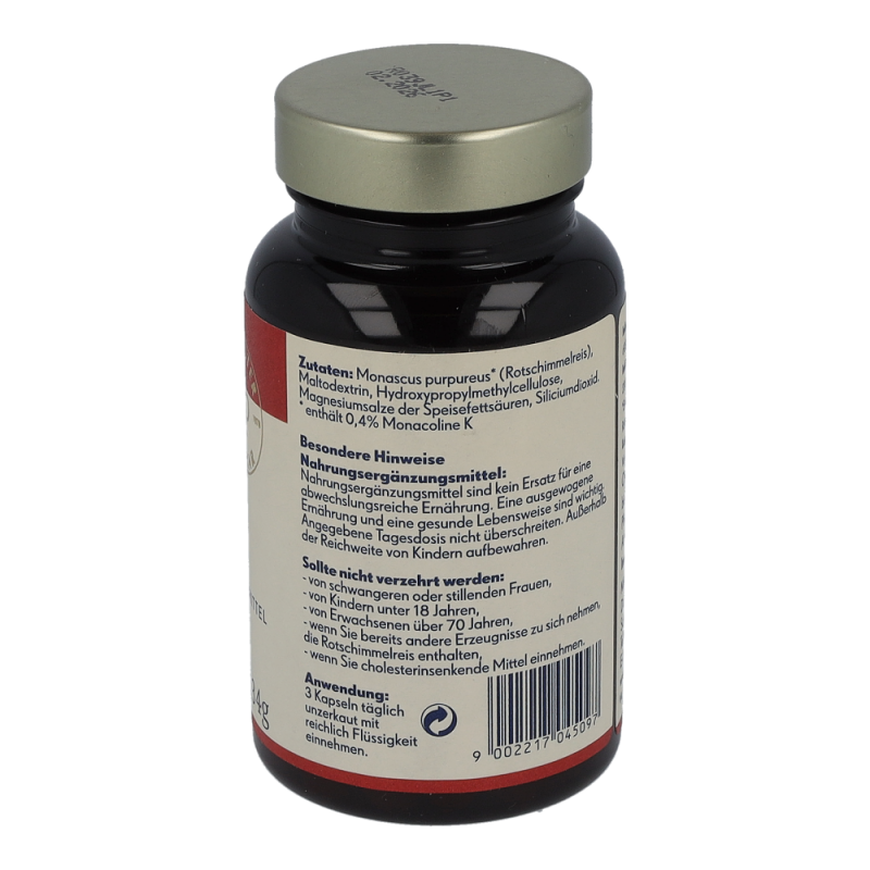 Eine Tagesdosis (3 Kapseln) enthält 600mg Rotschimmelreis (entspricht 2,4mg Monacolin K)
