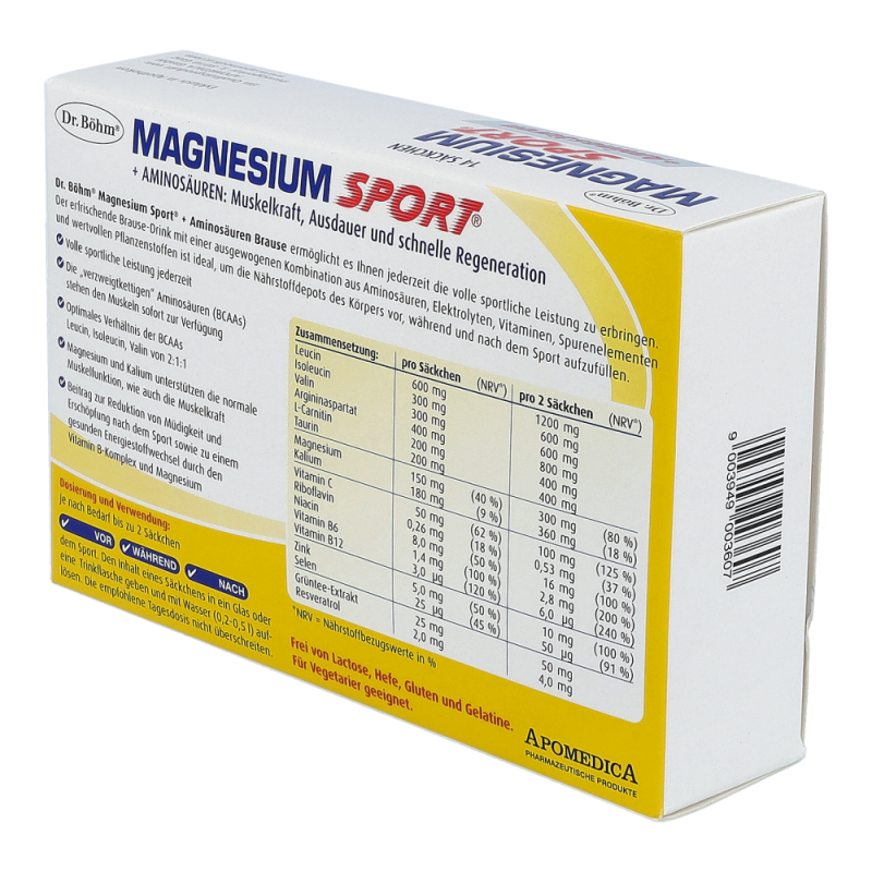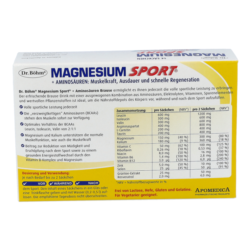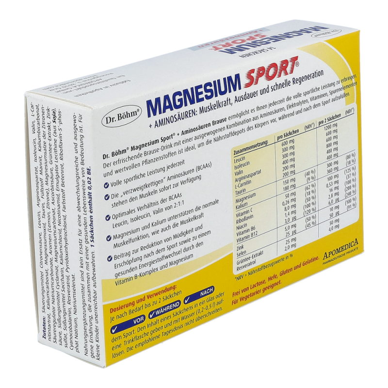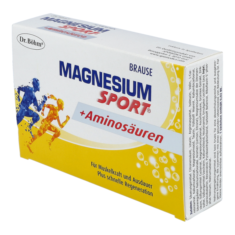 Dr. Böhm® Magnesium Sport® + Aminosäuren ist eine ausgewogene Kombination aus Aminosäuren, Magnesium, Kalium, Vitaminen, Spurenelementen und wertvollen Pflanzenstoffen.