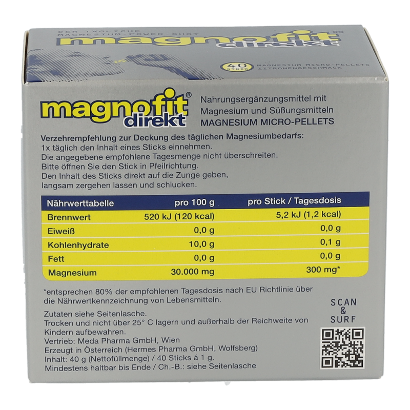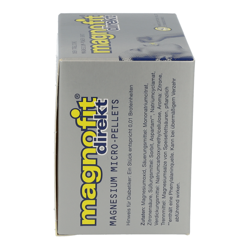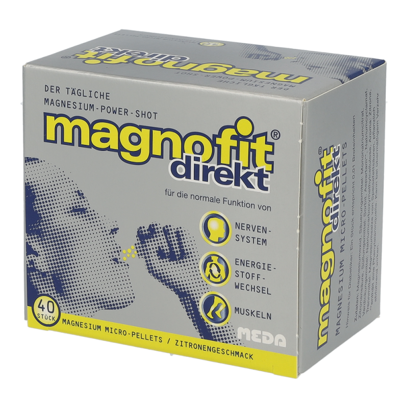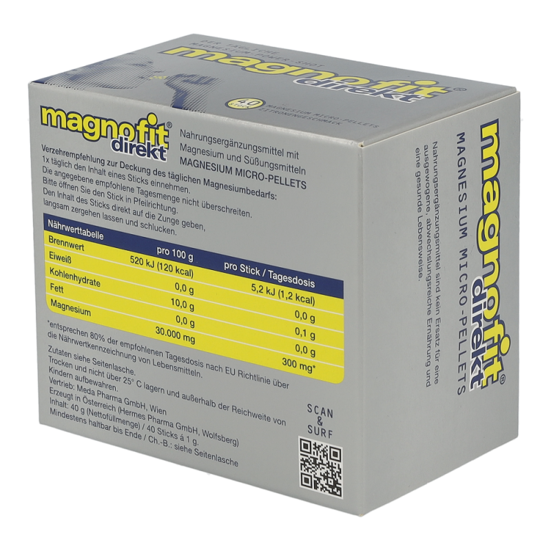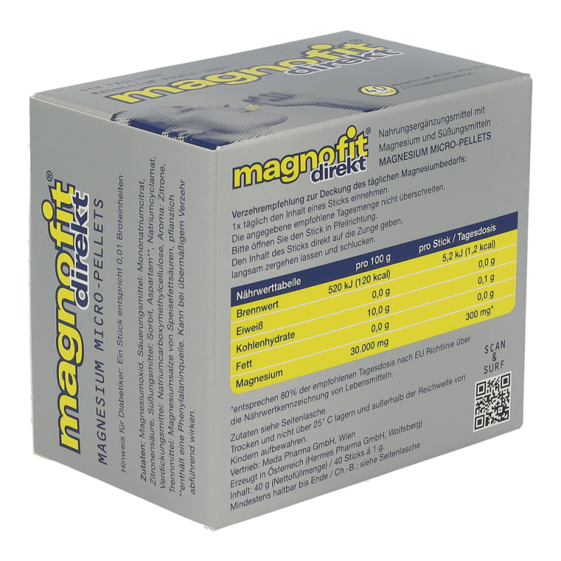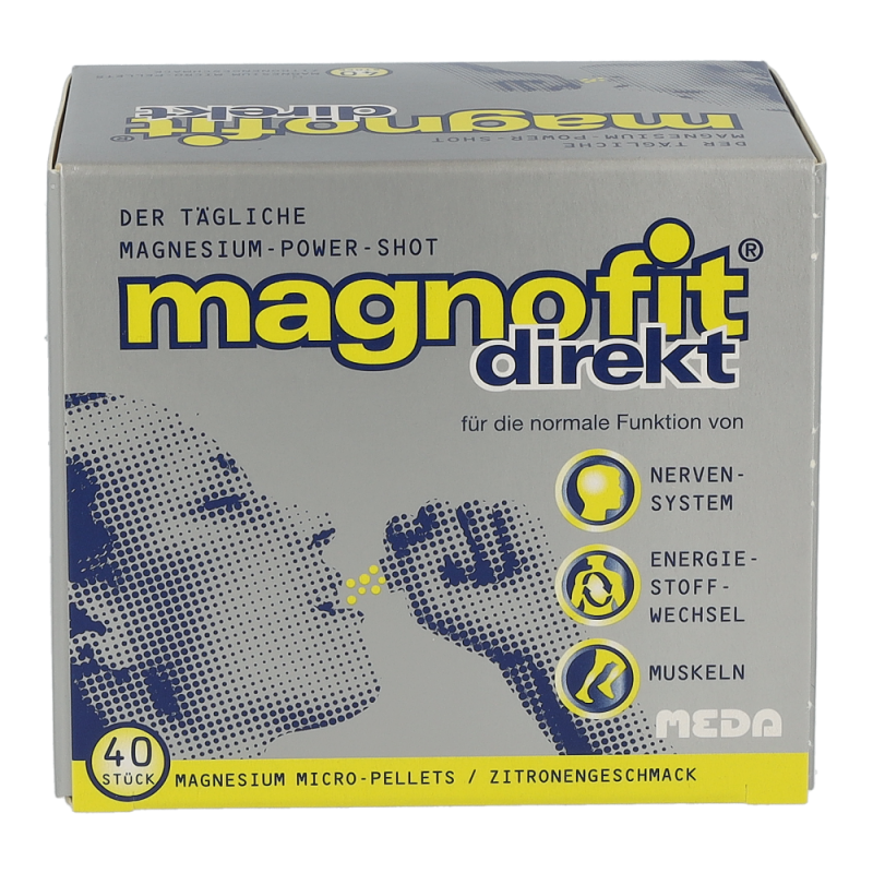 Magnofit Direkt mit 300 mg Magnesium pro Stick. Direkt-Stick, der nur 1x täglich und ohne Flüssigkeit eingenommen werden muss. Es wird empfohlen das Magnesium-Granulat direkt auf der Zunge zergehen zu lassen. Mit erfrischenden Zitronengeschmack. Zucker-, lactose- und glutenfrei. Für die normale Funktion von Nervensystem, Energiestoffwechsel und Muskeln.