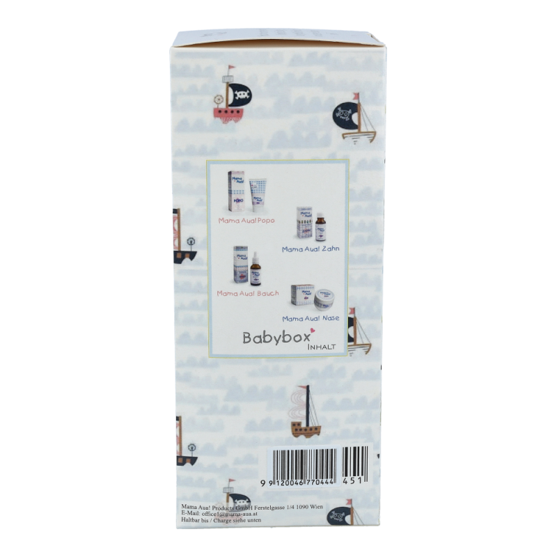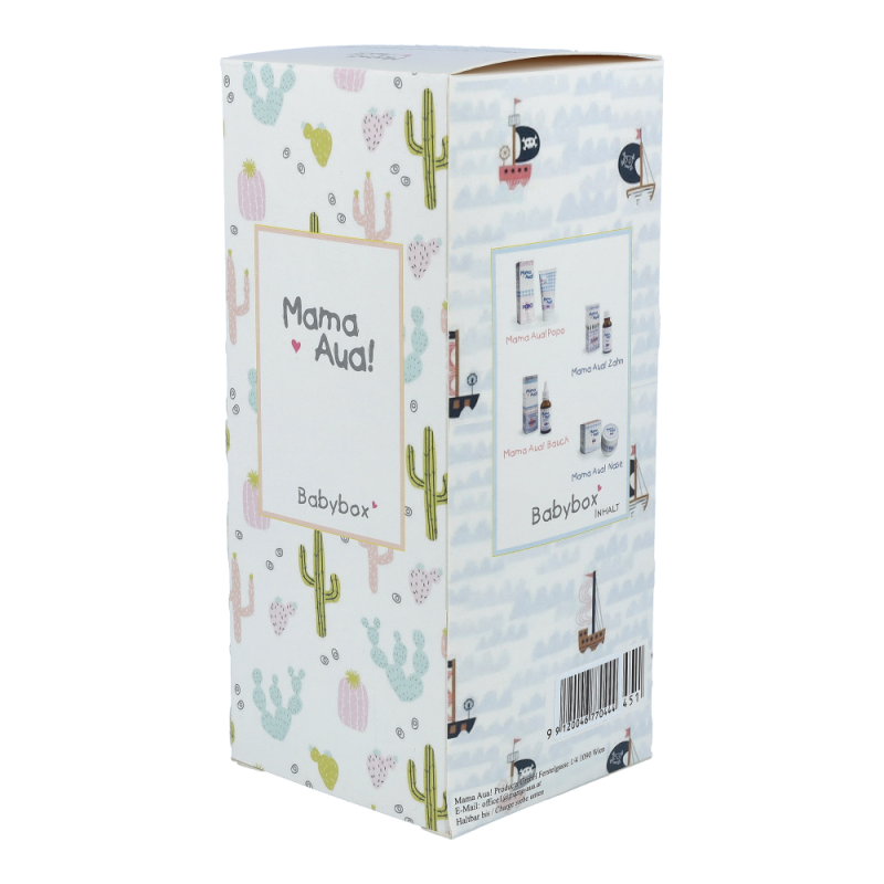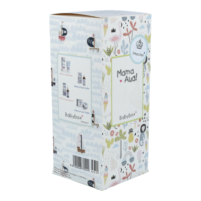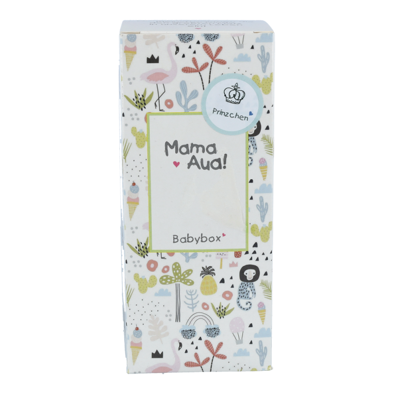 Mama Aua! Babyboxen sind im Design Prinzessin oder Prinzchen erhältlich. Sie beinhalten: Mama Aua! Nase, Mama Aua! Bauch ,Mama Aua! Popo und Mama Aua! Zahn