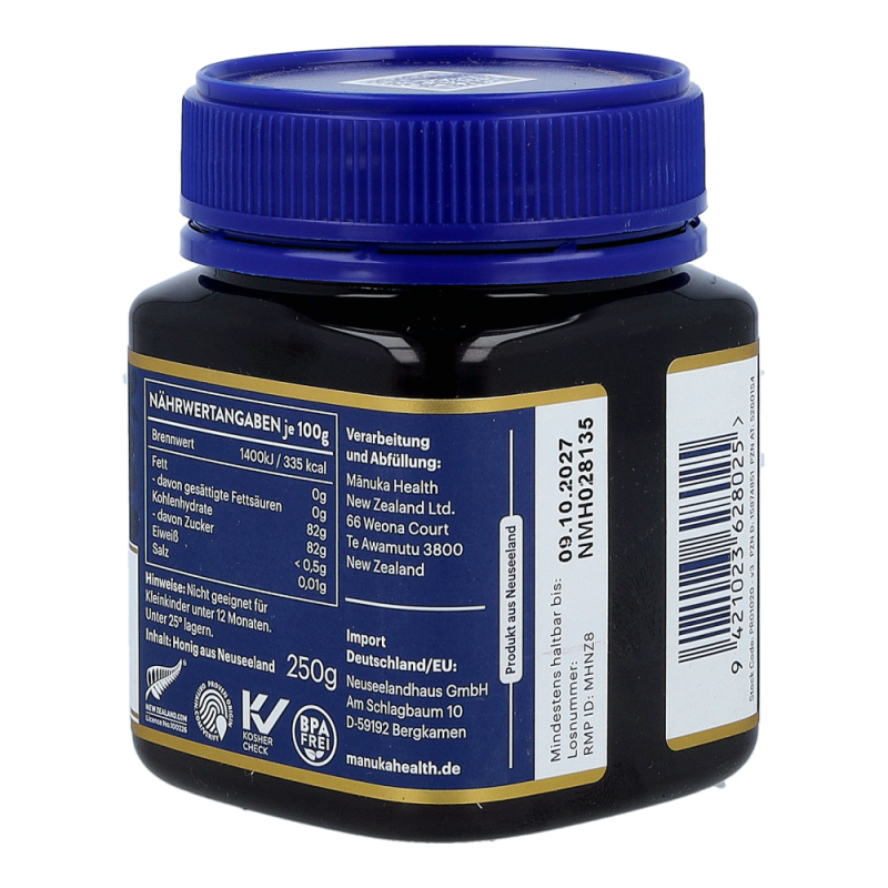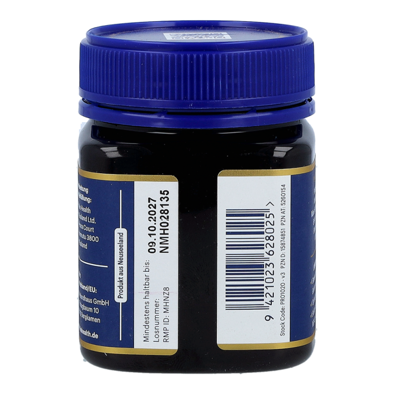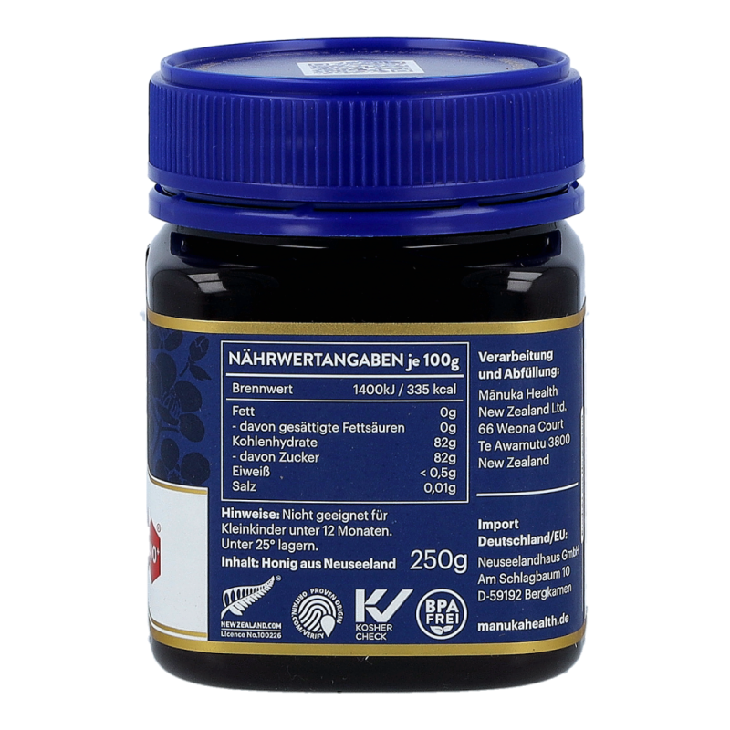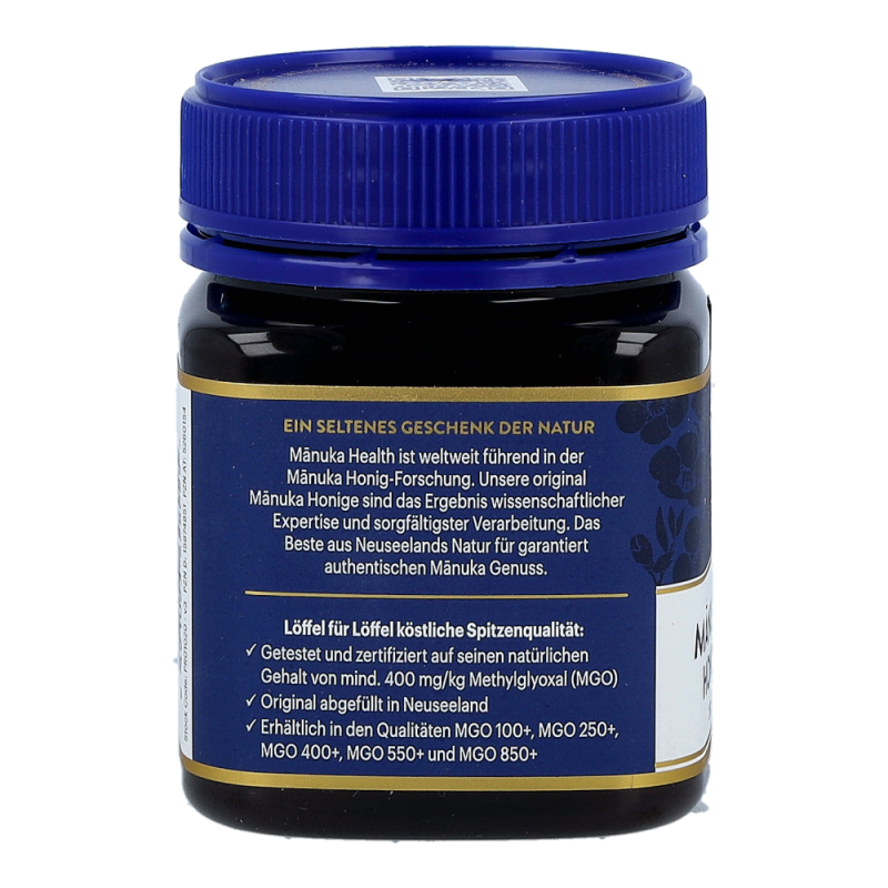 Der wertvolle Manuka Honig von Manuka Health aus Neuseeland. Dieser ist zertifiziert für eine natürliche Methylglyoxal-Qualität (MG). Dieser ist wissenschaftlich erwiesene wichtigste natürliche Bestandteil von Manuka Honig.
