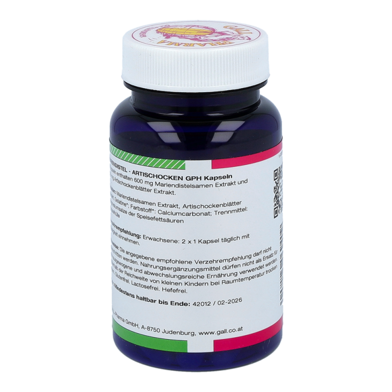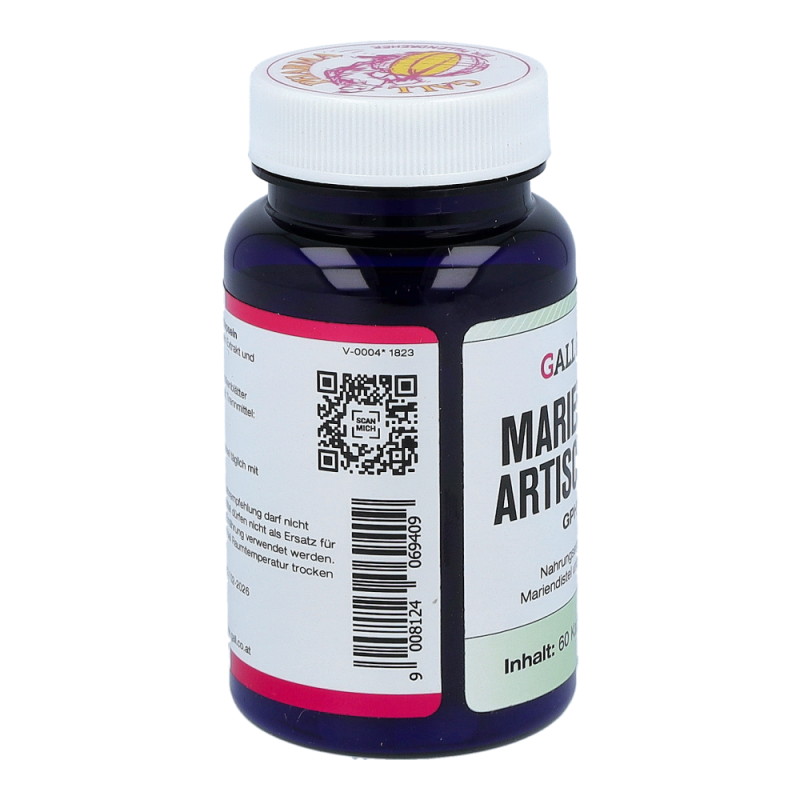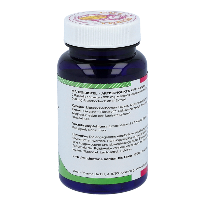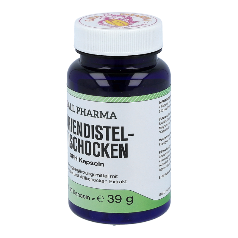 Die Mariendistel (auch Frauendistel oder Marienkörner genannt) gehört zur Familie der Korbblütler (Asteraceae) und enthält wichtige Inhaltstoffe wie Silymarin, Flavo-noide, ätherische Öle und Harze. Silymarin stimuliert die Neubildung der Leberzellen und fördert somit die Rege-nerationskräfte des zentralen Stoffwechselorgans. Sily-marin ist ausschließlich in den Früchten enthalten und schützt die Leber, stärkt und entgiftet diese. Da Silyma-rin die Regenerationsfähigkeit der Leber fördert und so die für die Verdauung wichtige Gallenflüssigkeit gebildet werden kann, regt die Mariendistel auch die Verdauung an. Silymarin schützt die Zelle außerdem vor freien Ra-dikalen. Die Kombination mit den Inhaltsstoffen der Arti-schocken sorgt zusätzlich für die Aufrechterhaltung eines normalen Cholesterinspiegels im Blut.