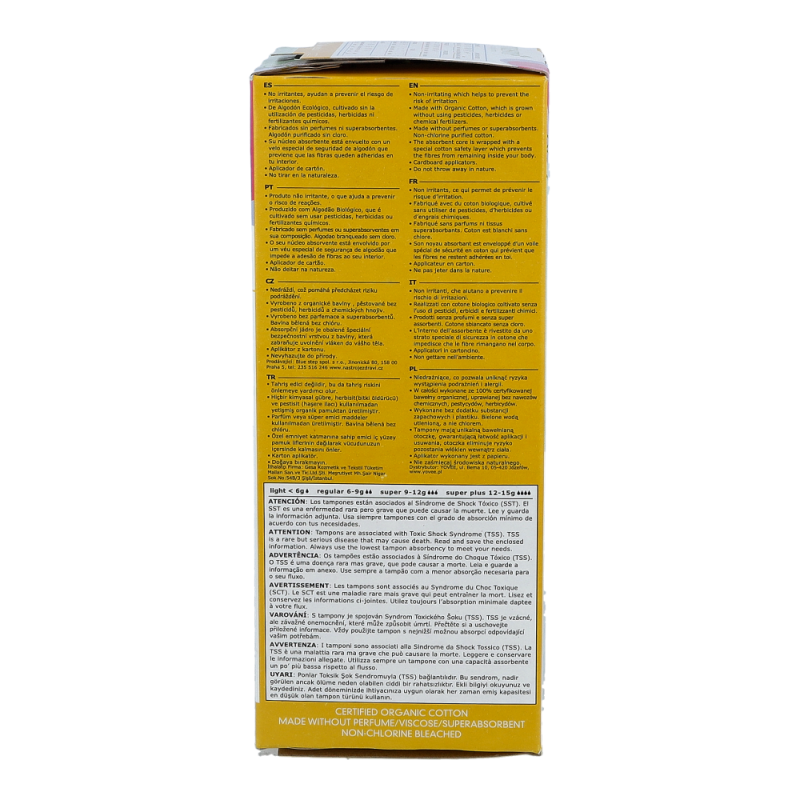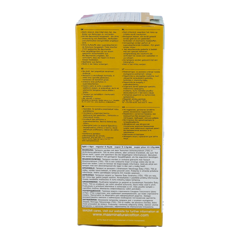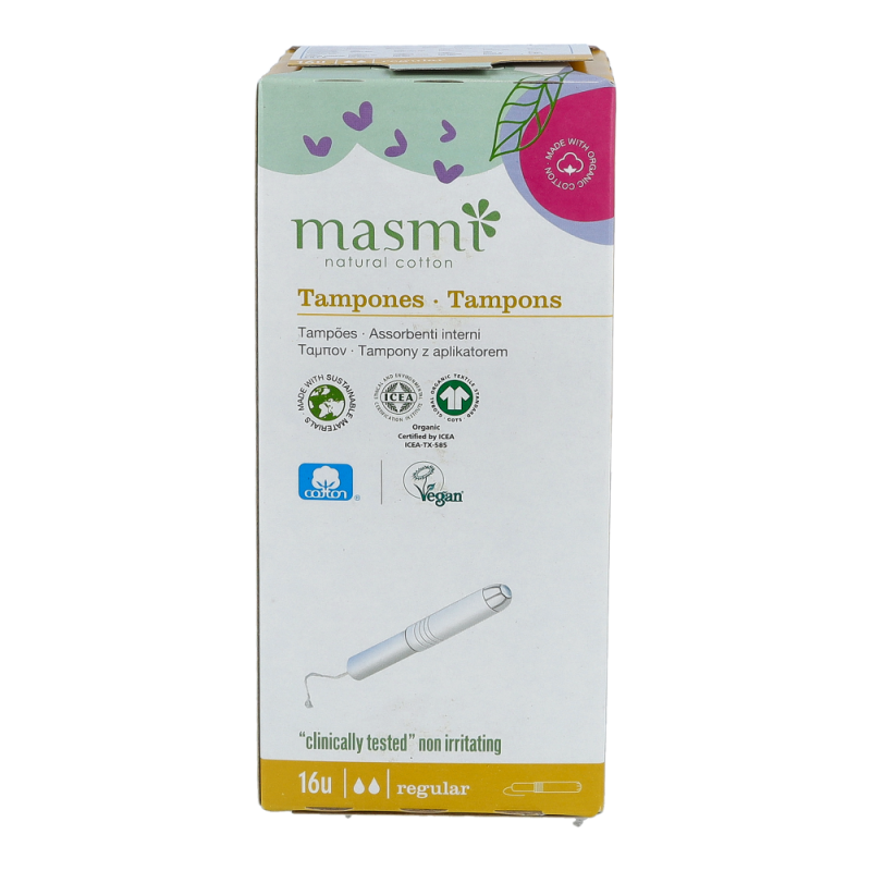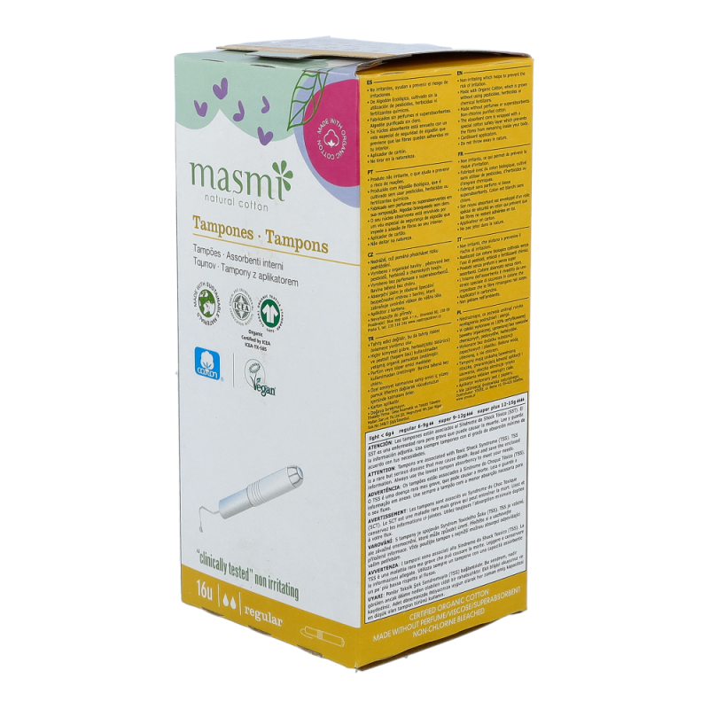 Masmi BIO Tampon Classic mit Applikator aus 100% Bio-Baumwolle verwenden–Baumwole ist atmungsaktiv und leitet die Flüssigkeit wirksam ins Innere, garantiert ein optimales Feuchtigkeitsmilieu, welches den Wasserentzug reduziert und das natürliche Säure-Gleichgewicht der Schleimhaut nicht beeinflusst