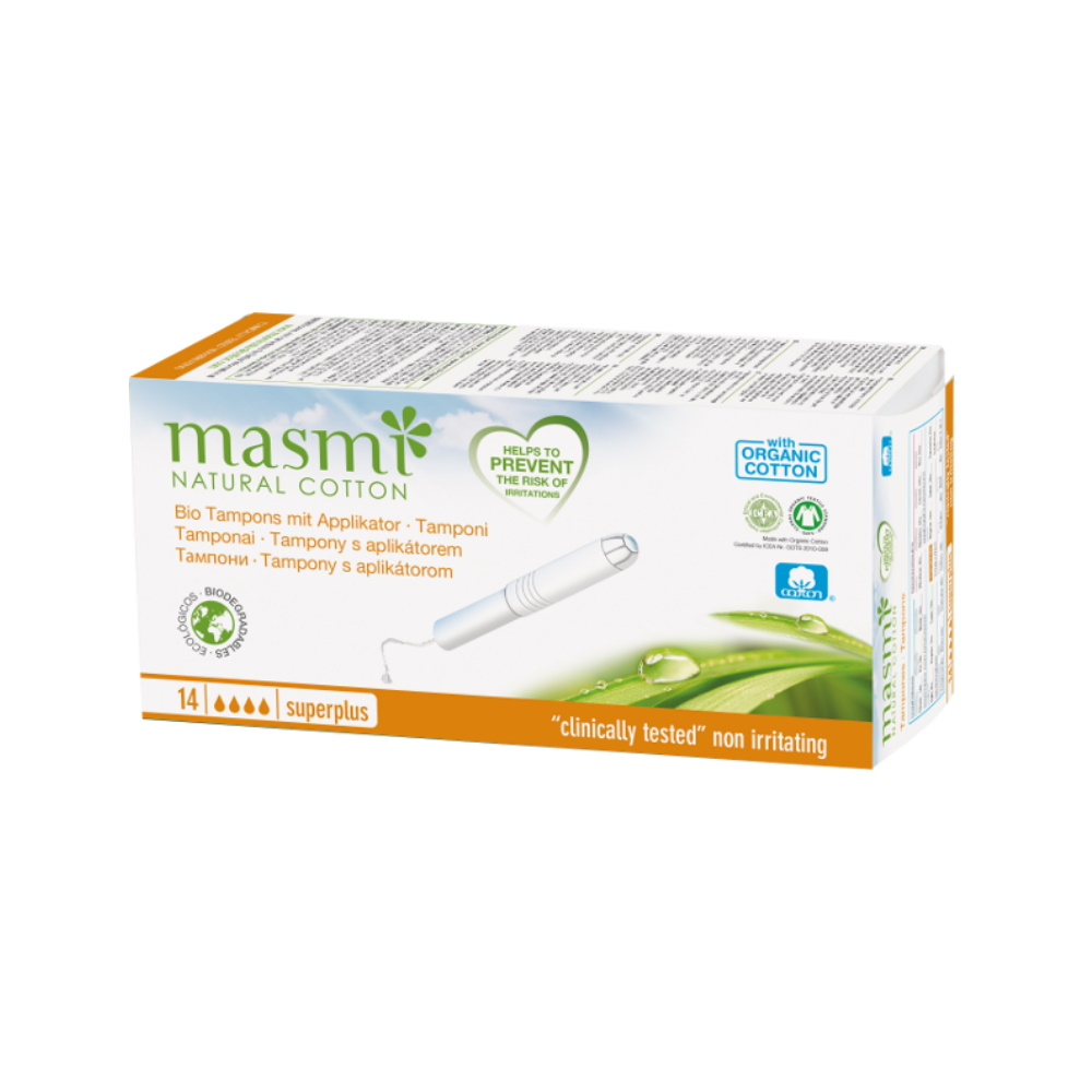 Masmi BIO Tampon Super Plus mit Applikator aus 100% Bio-Baumwolle verwenden–Baumwolle ist atmungsaktiv und leitet die Flüssigkeit wirksam ins Innere, garantiert ein optimales Feuchtigkeitsmilieu, welches den Wasserentzug reduziert und das natürliche Säure-Gleichgewicht der Schleimhaut nicht beeinflusst