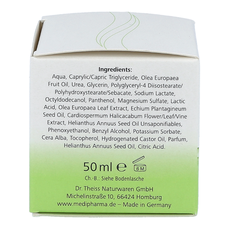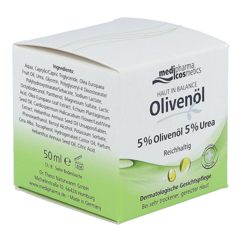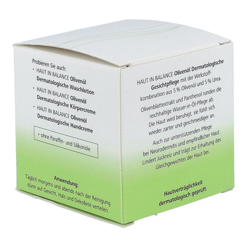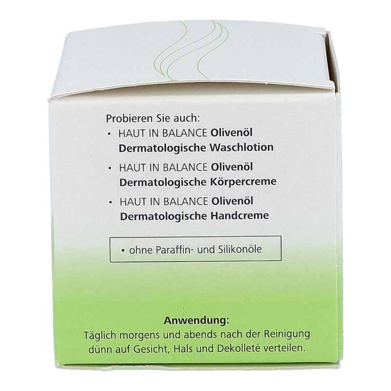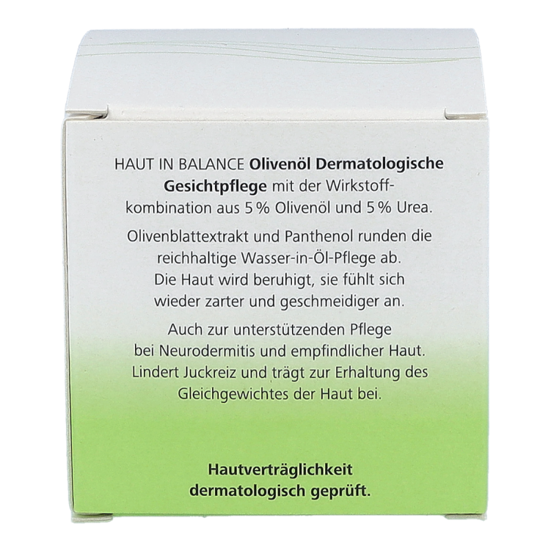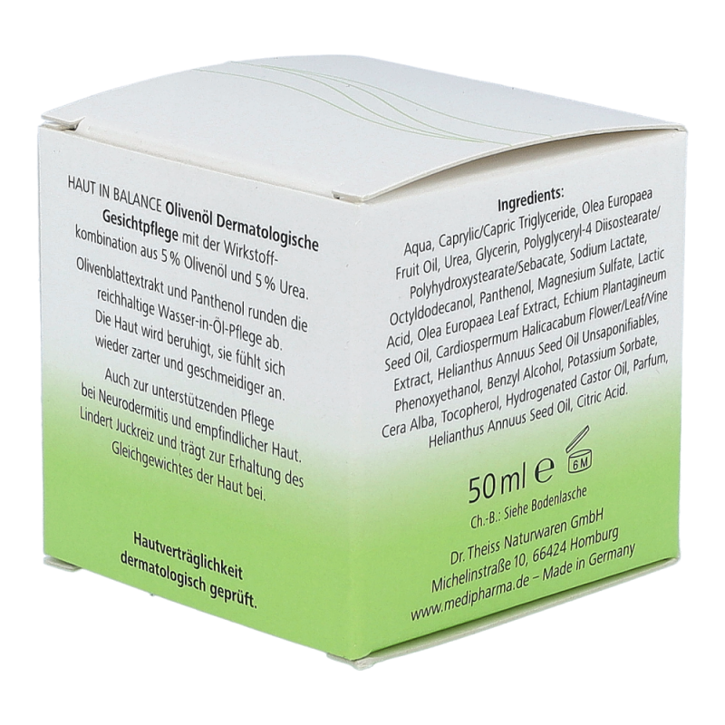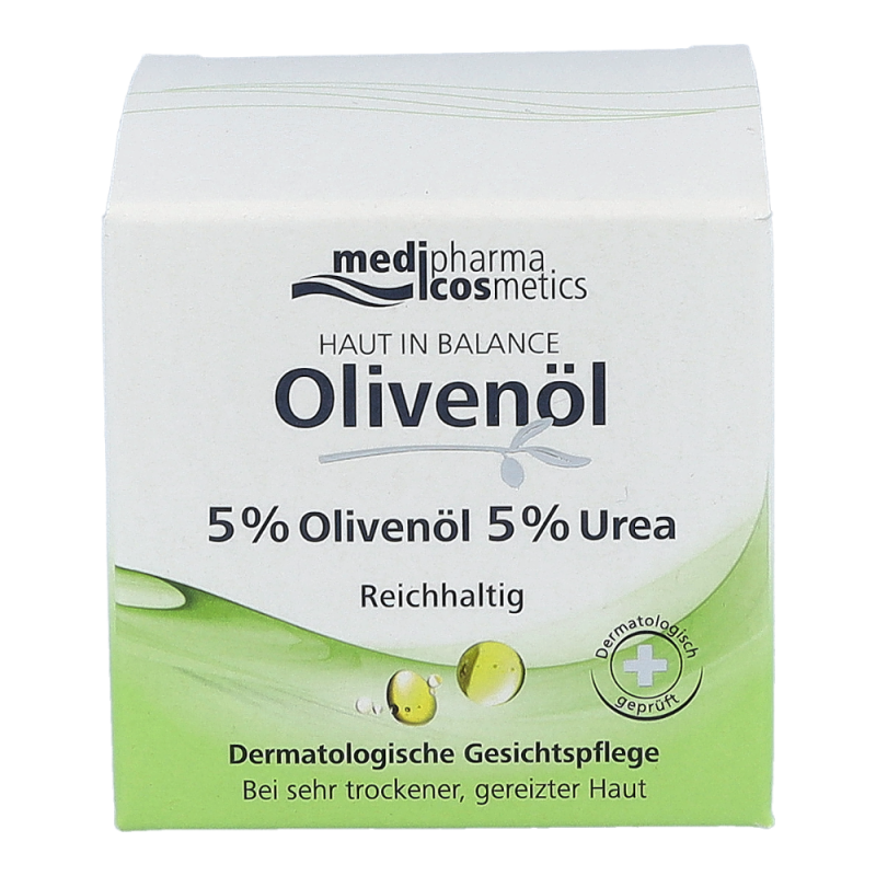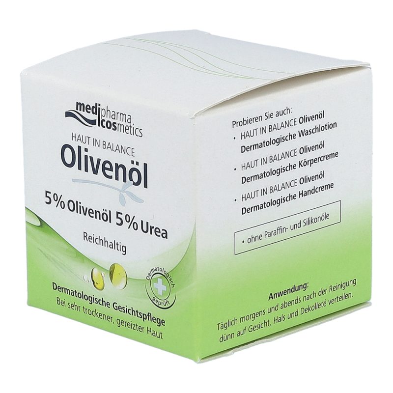 Medipharma Cosmetics Haut in Balance Olivenöl Dermatologische Gesichtspflege ist frei von Farbstoffen, Silikonölen, Paraffinölen, Wollwachsen, Parabenen und Parfüm. Die einzigartige Wirkstoffkombination aus Olivenöl, Urea und Silber versorgt sehr trockene, gereizte und schuppige Haut intensiv mit hautpflegenden Lipiden und Feuchtigkeit.