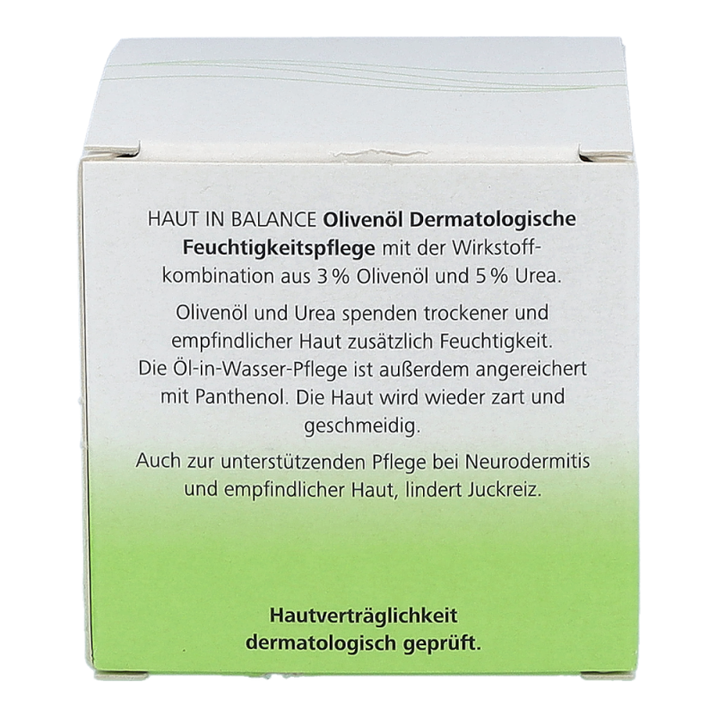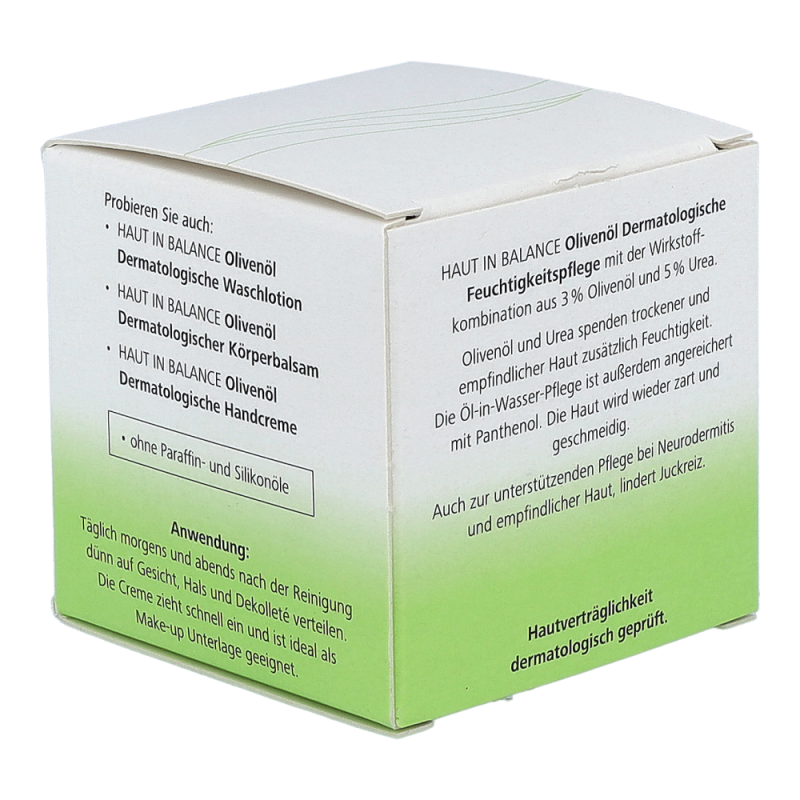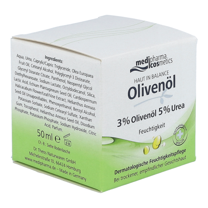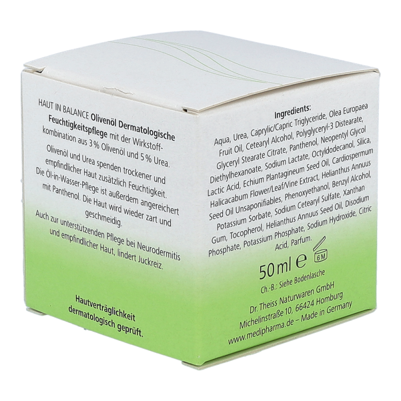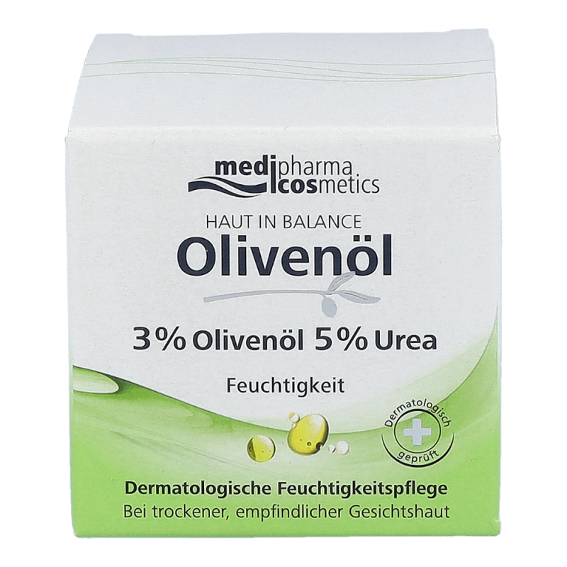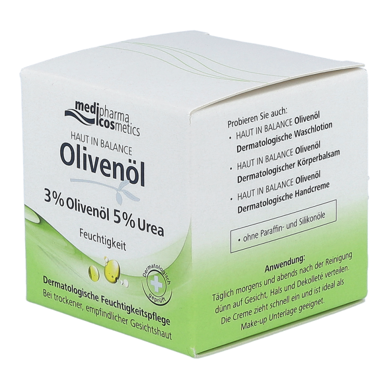 Medipharma Cosmetics Haut in Balance Olivenöl Feuchtigkeitspflege mit kaltgepresstem Olivenöl und hautpflegender Shea Butter schützt die Haut vor dem Austrocknen und pflegt sie zart und geschmeidig. Ein spezieller Vitamin-Komplex mit Urea spendet intensive Feuchtigkeit. Die Haut wird erfrischt und fühlt sich sichtbar glatter an.
