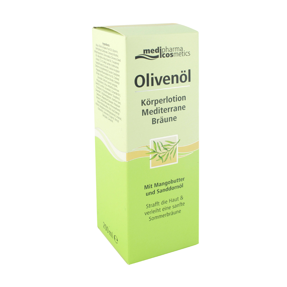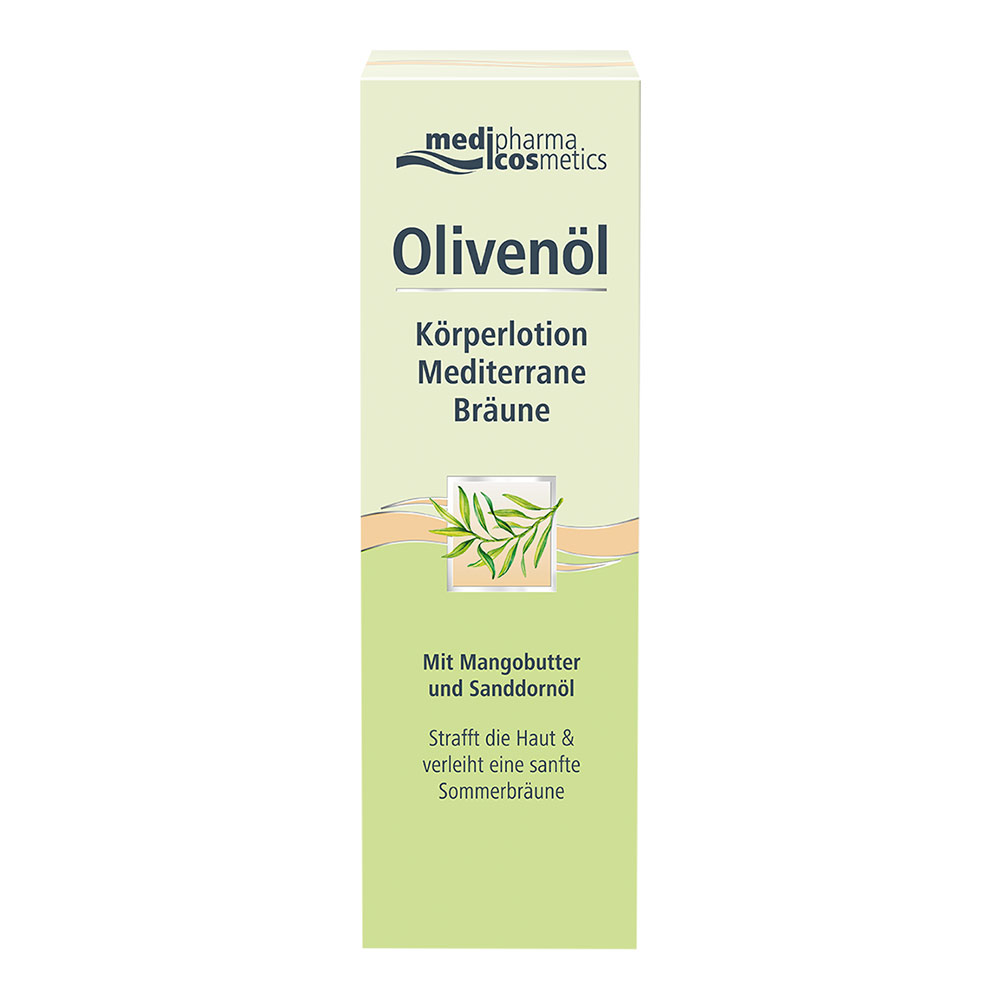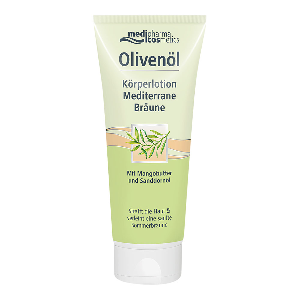 Medipharma Cosmetics Olivenöl Körper-Lotion Bräune mit kaltgepresstem Olivenöl aus der Toskana, Mangobutter, wertvollem Sanddornöl und dem Bräunungswirkstoff (DHA) verleiht der Haut eine sanfte Sommerbräune und pflegt sie nachhaltig.