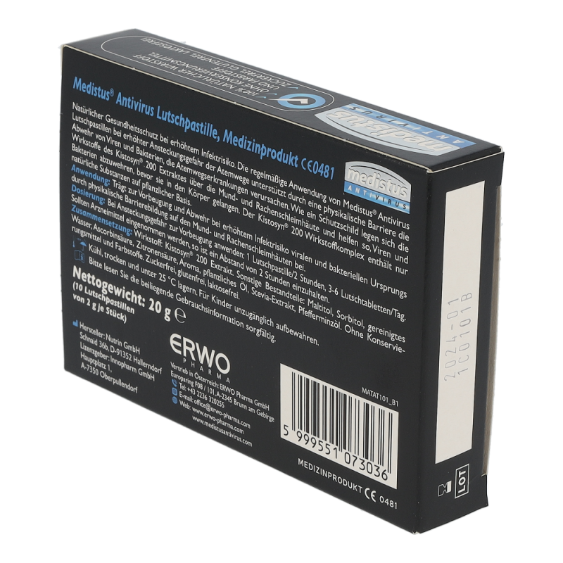 Medistus® Antivirus ist ein Medizinprodukt mit einem neuartigen Wirkstoffkomplex auf pflanzlicher Basis. Der Kistosyn® 200 Extrakt, mit den darin enthaltenen natürlichen Wirkstoffen, bildet einen Schutzfilm, der sich über die Rachenschleimhäute legt. Diese Schutzbarriere führt zu einer physikalischen (mechanischen) Abwehr der Viren (Erkältungsviren) und Bakterien und hilft somit ihr Eindringen in Körperzellen und ihre Vermehrung zu verhindern. Aufgrund dieser physikalischen Wirkungsweise gibt es keine Resistenzbildung.