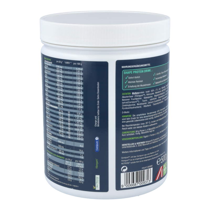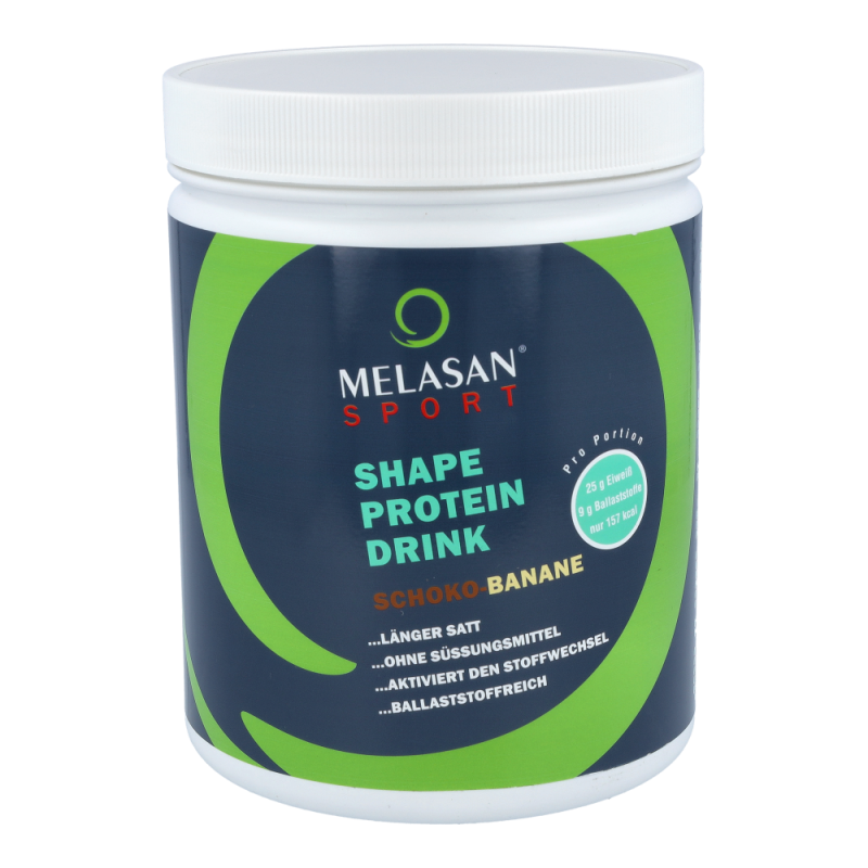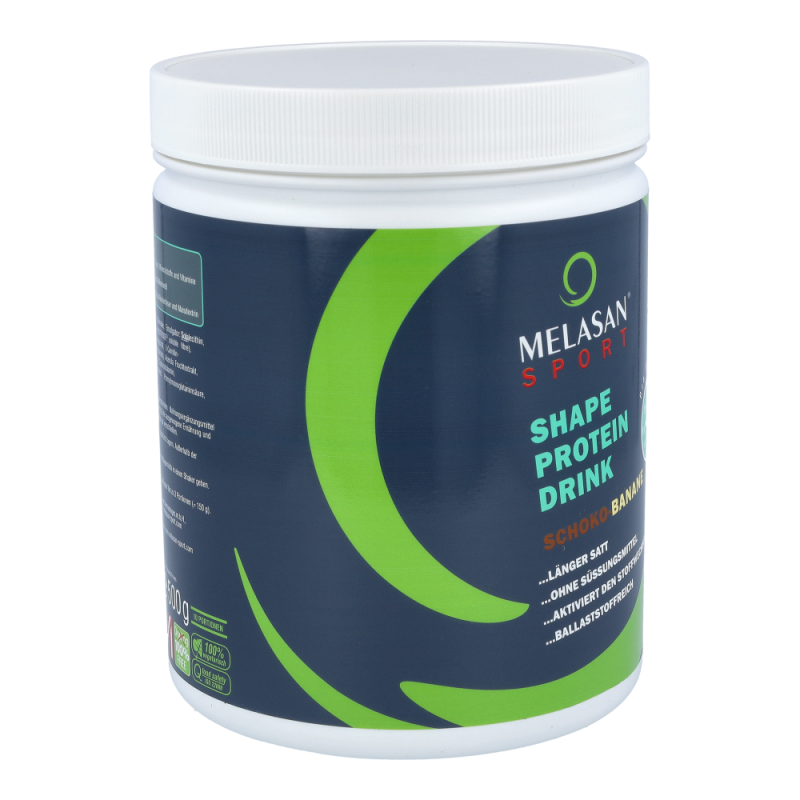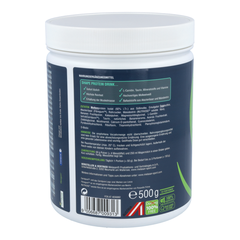 Der neue Melasan Shape Protein Drink mit feinem Schoko-Banane-Geschmack ist der ideale Begleiter um auf gesundem Weg Ihr Körpergewicht zu reduzieren und gleichzeitig Ihre Muskelmasse zu erhalten. Unser Shape Protein Drink wird ohne künstliche Zusatzstoffe gefertigt und enthält einen perfekten Ballaststoffkomplex, welcher zu einem langanhaltenden Sättigungsgefühl sowie einem konstanten Blutzuckerspiegel beiträgt. Weiters beinhaltet der Protein Drink eine Top-Eiweißquelle mit höchster Qualität und hervorragendem Aminosäureprofil mit einem hohen Anteil an den verzweigtkettigen Aminosäuren Leucin, Valin und Isoleucin. Mit unserem Melasan Shape Protein Drink sparen Sie Sich unnötige Kalorien und haben dabei ein tolles Geschmackserlebnis.