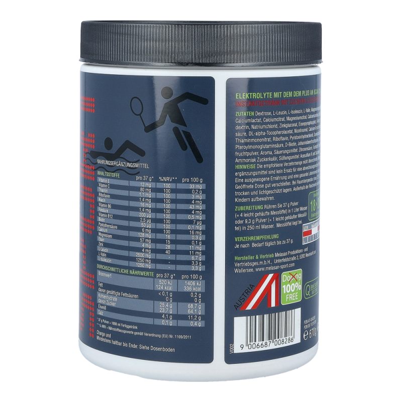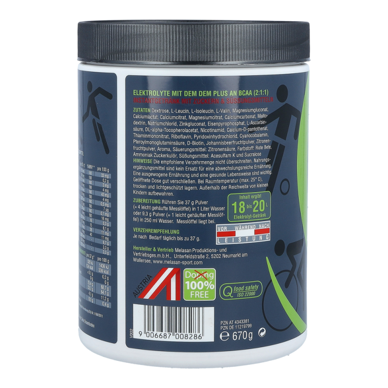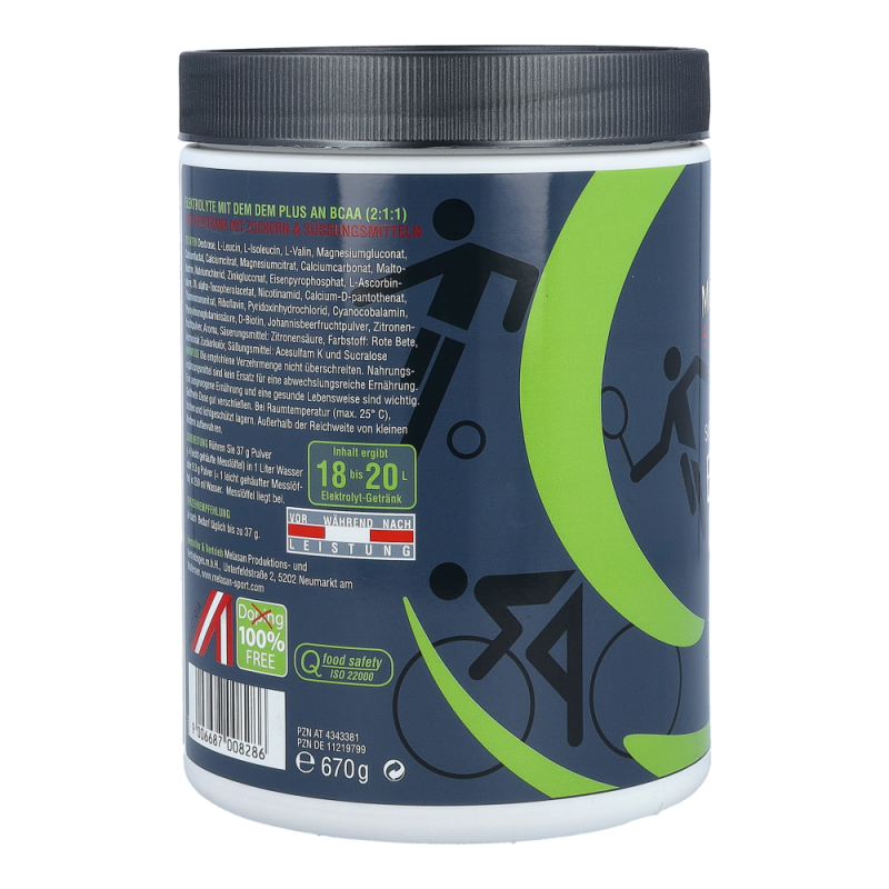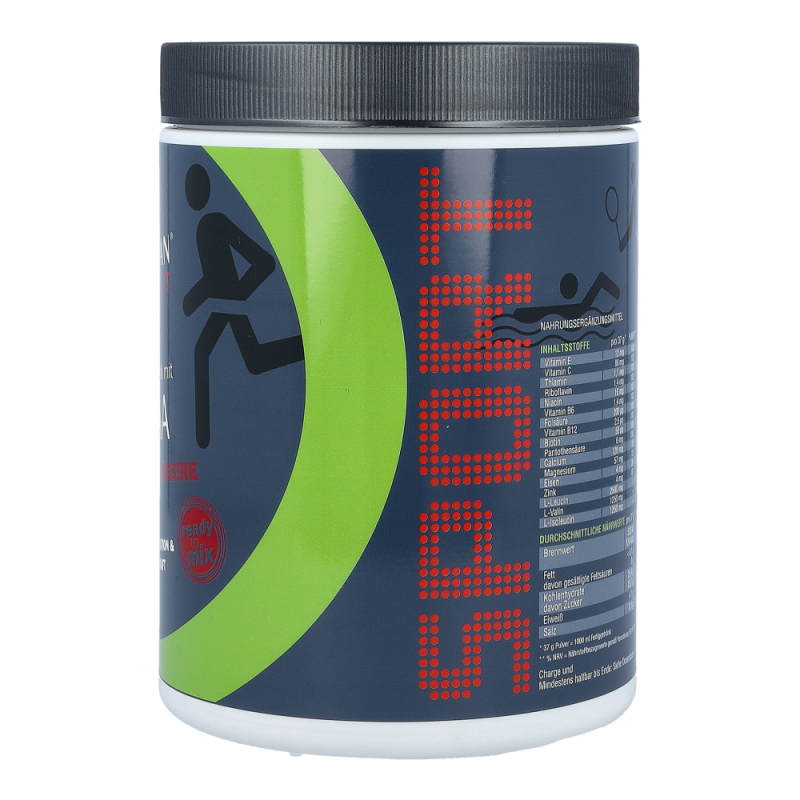 Sportgetränk BCAA Johannisbeere 670 g enthält Vitamine, Mineralstoffe, Spurenelemente und BCAA (Branched Chain Amino Acids, verzweigtkettige Aminosäuren). Erstmals sind BCAA mit diesem Produkt in gut wasserlöslicher und geschmacksneutraler Form verfügbar. Das Sportgetränk mit BCAA hat den belebenden Geschmack von schwarzen Johannisbeeren und sollte nach körperlicher Beanspruchung getrunken werden jetzt