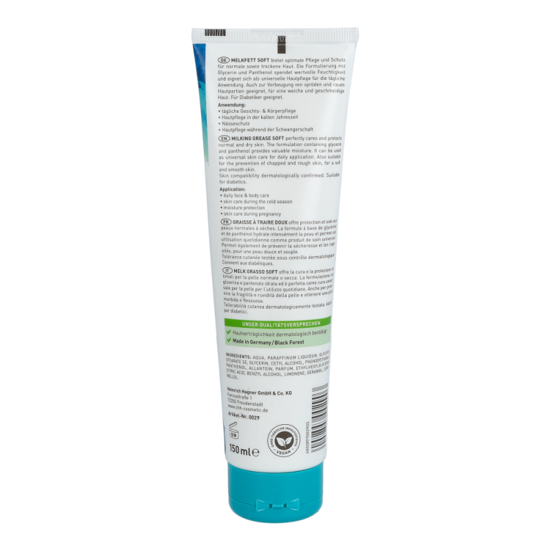 Melkfett Soft Emulsion pflegt und schützt die trockene und normale Haut. Die Creme beseitigt wirkungsvoll raue Körperstellen und spröde Lippen werden wieder geschmeidig.