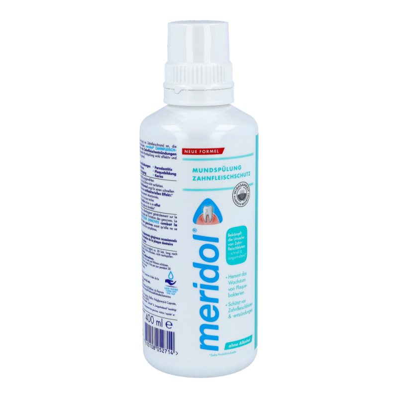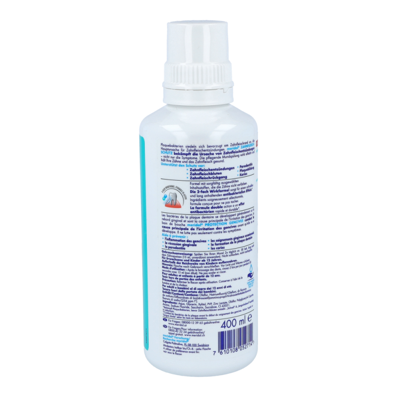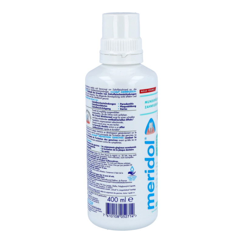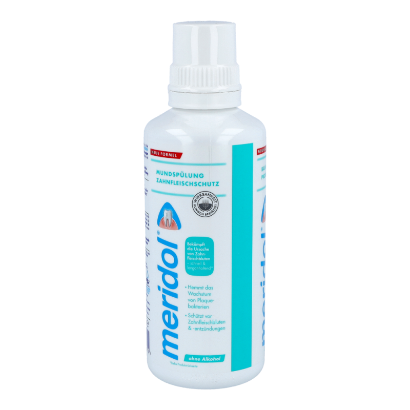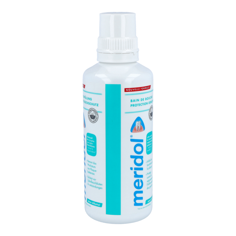 Meridol Mundspülung dient der Anwendung bei Zahnfleischproblemen. Ergänzend zum täglichen Zähneputzen bekämpft sie sowohl Plaque-Bakterien, als auch deren Aktivität in den Restbelägen