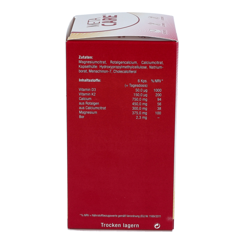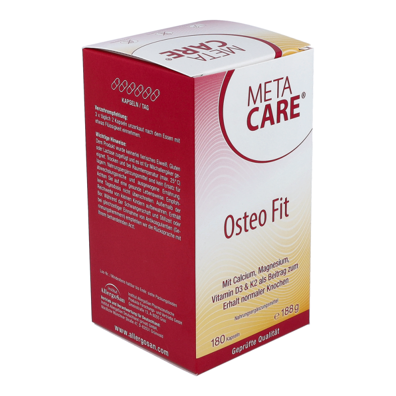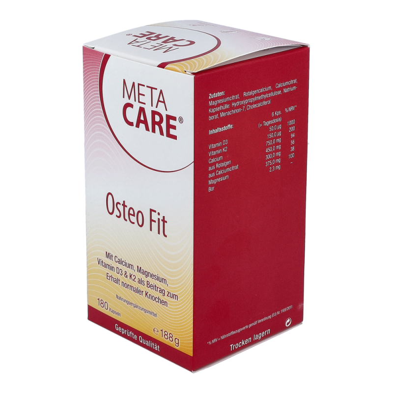 META-CARE® Osteo Fit bietet eine umfassende Kombination aus den wichtigen Knochen-Nährstoffen Calcium, Magnesium, Vitamin D3 & K2, ergänzt durch Bor. Die Mineralstoffe Calcium und Magnesium tragen wesentlich zum Erhalt normaler Knochen und Zähne bei. Ein erhöhter Bedarf kann im Wachstum, durch die Einnahme bestimmter Arzneimittel oder bei intensiver körperlicher Belastung entstehen.META-CARE® Osteo Fit enthält pflanzliches Calcium aus der Rotalge (Lithothamnium Calcareum) und Magnesium in der gut aufnehmbaren Citrat-Verbindung. Vitamin D ist entscheidend an der Aufnahme und Verwertung von Calcium beteiligt. Zusätzlich spielt das Vitamin D, zusammen mit Vitamin K, eine wichtige Rolle zum Erhalt der Knochen. Vitamin D wird zwar mit Hilfe des Sonnenlichts in der Haut gebildet, allerdings kann der Bedarf in unseren Breitengraden durch Eigensynthese oder die Ernährung meist nicht ausreichend gedeckt werden.