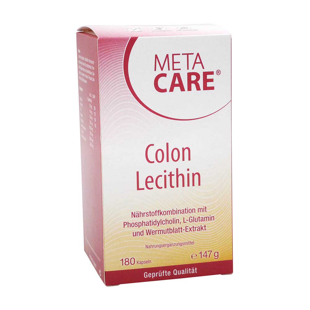 Metacare Colon Lecithin Kapseln kombinieren hochwertiges Lecithin mit den für die Darmschleimhaut wichtigsten Vitalstoffen sowie den Vitaminen B6 und B12, dem Spurenelement Zink und dem Phytotherapeutikum Wermuth. Zur Regeneration der Darmschleimhaut benötigt unser Organismus Vitamine, Mineralstoffe sowie Spurenelemente. Am Besten alles in einer Kapsel.