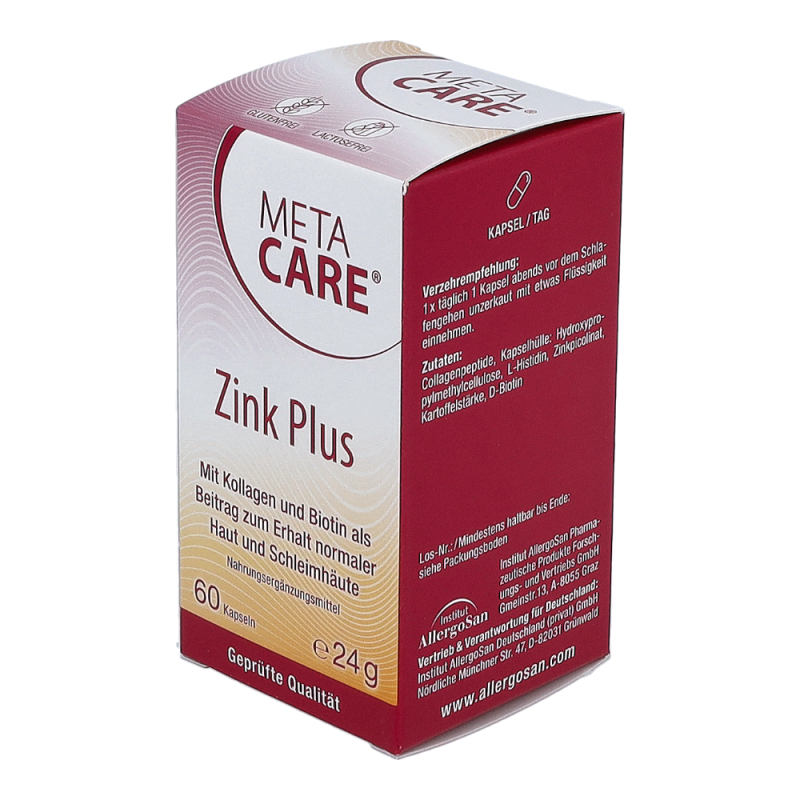 Metacare Zink + Kapseln tragen zur Zellerneuerung, zur Aufrechterhaltung normaler Haut, eines normalen Hormonhaushalts sowie der Ausbildung normaler Nägel bei. Zink zählt zu den essentiellen Spurenelementen, ein ausgewogener Zinkhaushalt ist somit für einen gesunden Körper unverzichtbar – profitieren Sie von hohen Rabatten und dem großen Sortiment einer Standortapotheke!