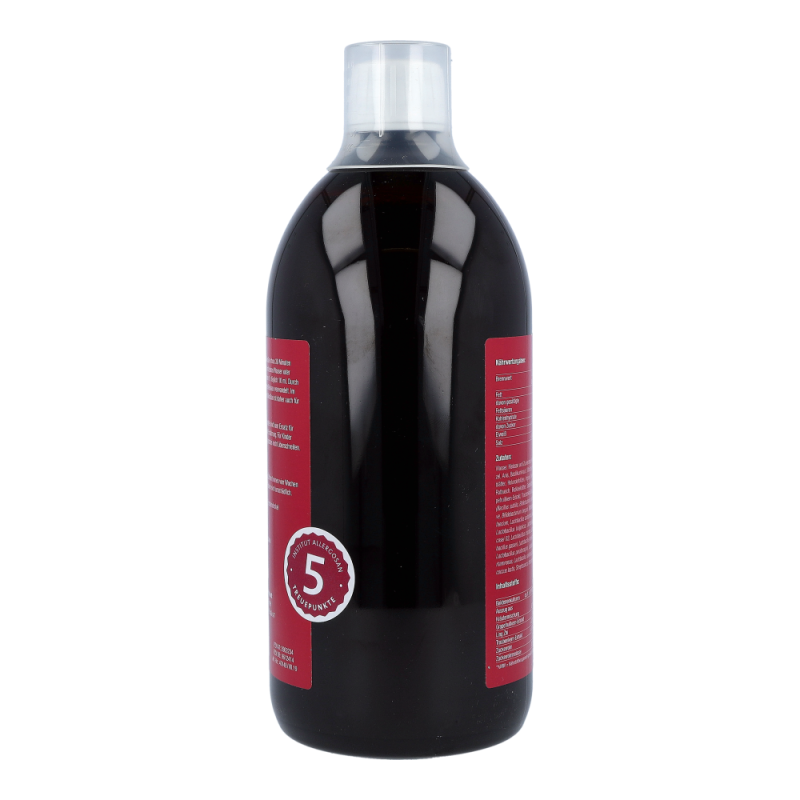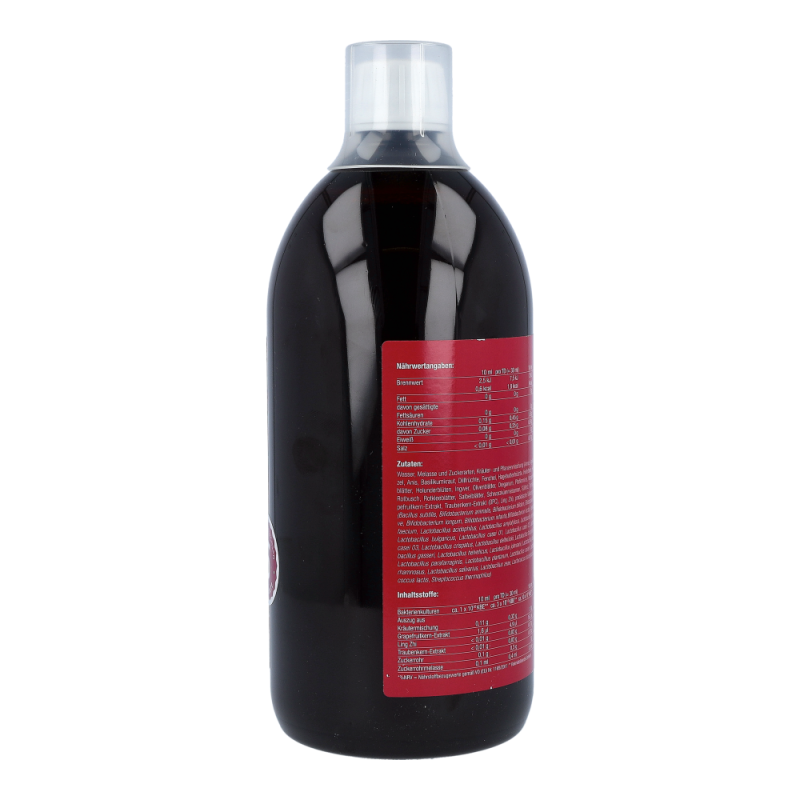 Wasser, Zuckerrohrmelasse, Rohrzucker, Kräuter- und Pflanzenmischung (Ananas, Angelikawurzel, Anis, Basilikumkraut, Dillfrüchte, Fenchel, Hagebuttenfrüchte, Heidelbeere, Himbeerblätter, Holunderblüten, Ingwer, Olivenblätter, Oreganum, Pfefferminze, Rosmarinblätter, Rotbusch, Rotkleeblätter, Salbeiblätter, Schwarzkümmelsamen, Süßholz, Thymian, Grapefruitkern-Extrakt, Traubenkern-Extrakt (OPC), Ling Zhi)