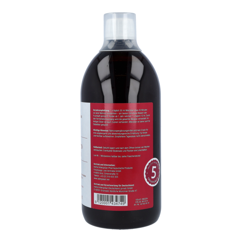 1 x täglich 30 ml MikroSan etwa 30 Minuten vor einer Mahlzeit einnehmen – am besten mit etwas Wasser oder Fruchtsaft gemischt.