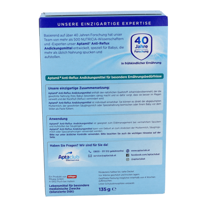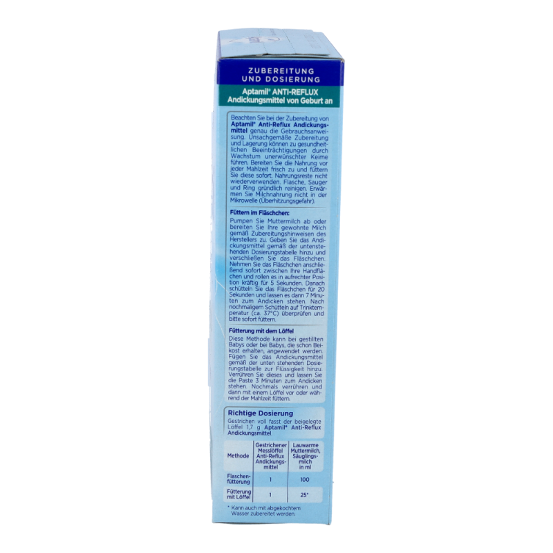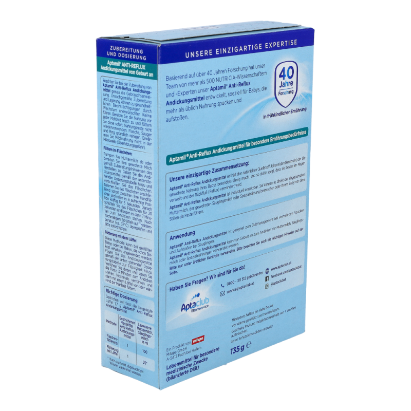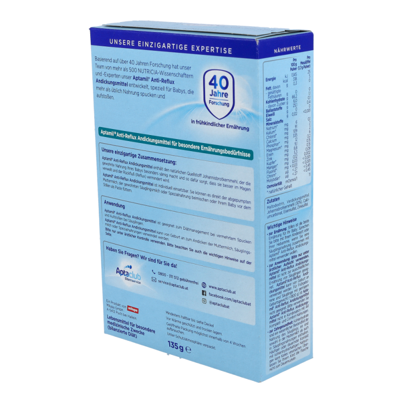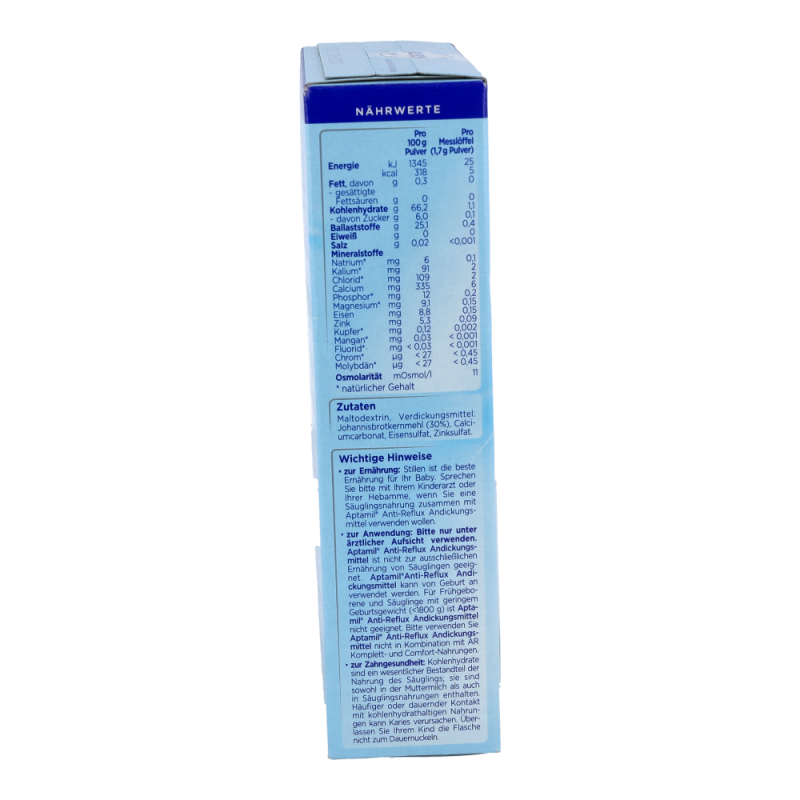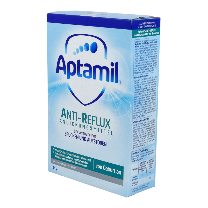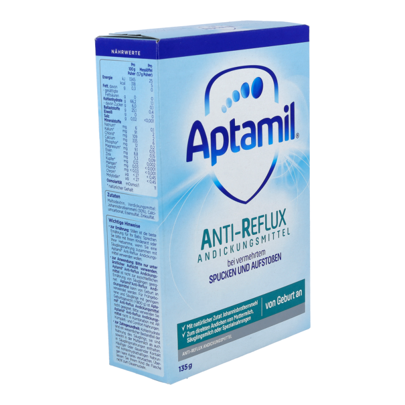 Aptamil Anti-Reflux Andickungsmittel enthält den natürlichen Quellstoff Johannisbrotkernmehl, der die gewohnte Nahrung deines Babys besonders sämig macht und so dafür sorgt, dass sie besser im Magen verweilt und der Rückfluß (Reflux) vermindert wird – dieses und weitere Produkte von Aptamil dauerhaft preisgesenkt bestellen!