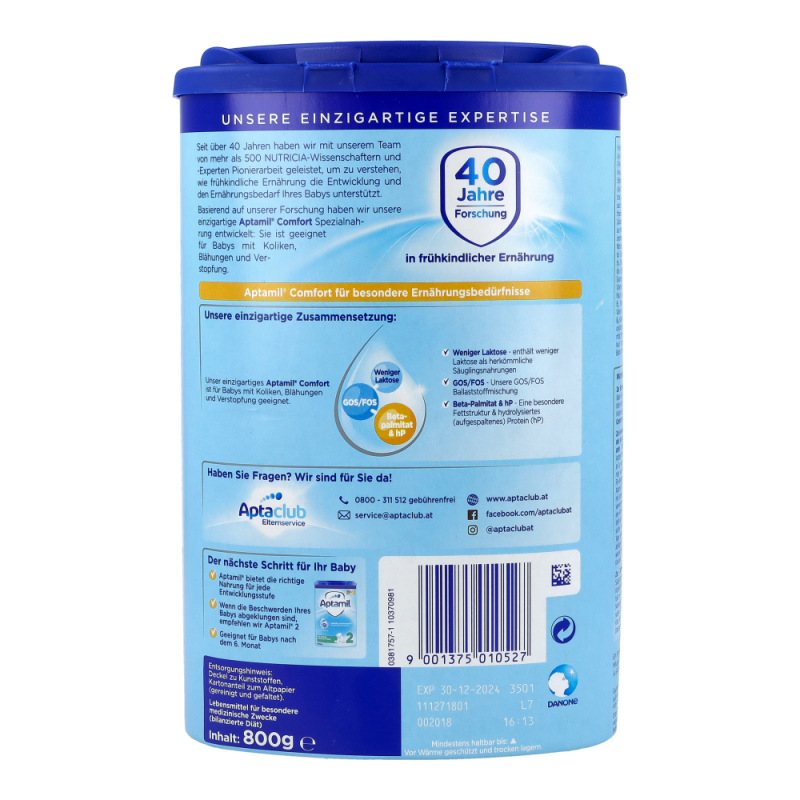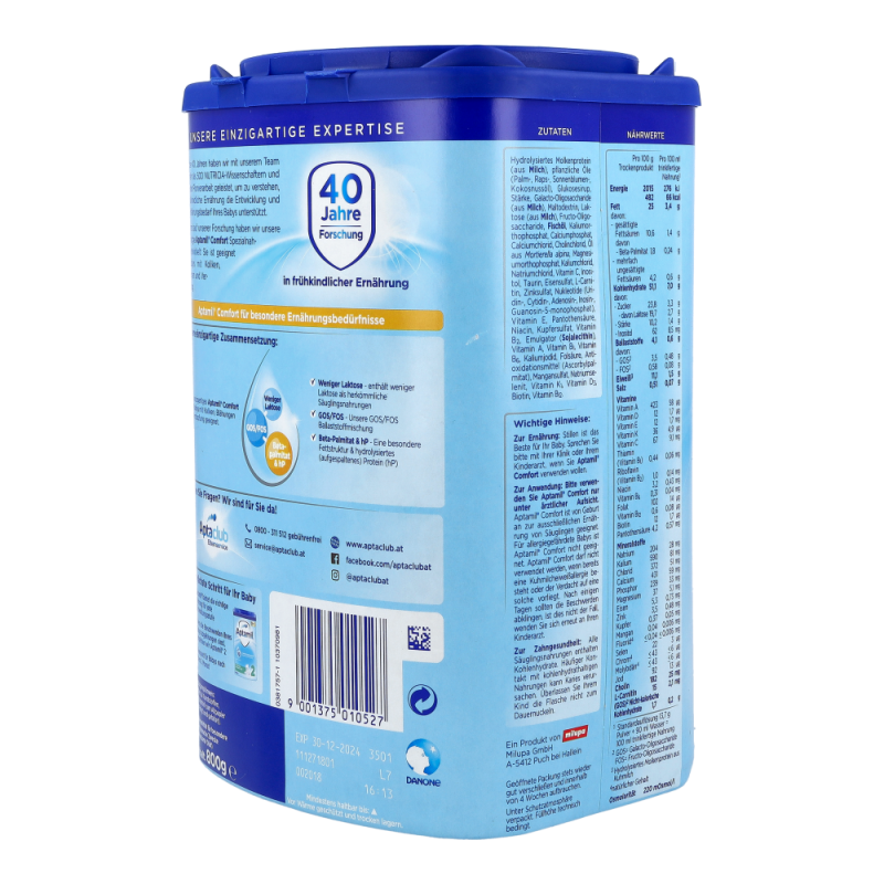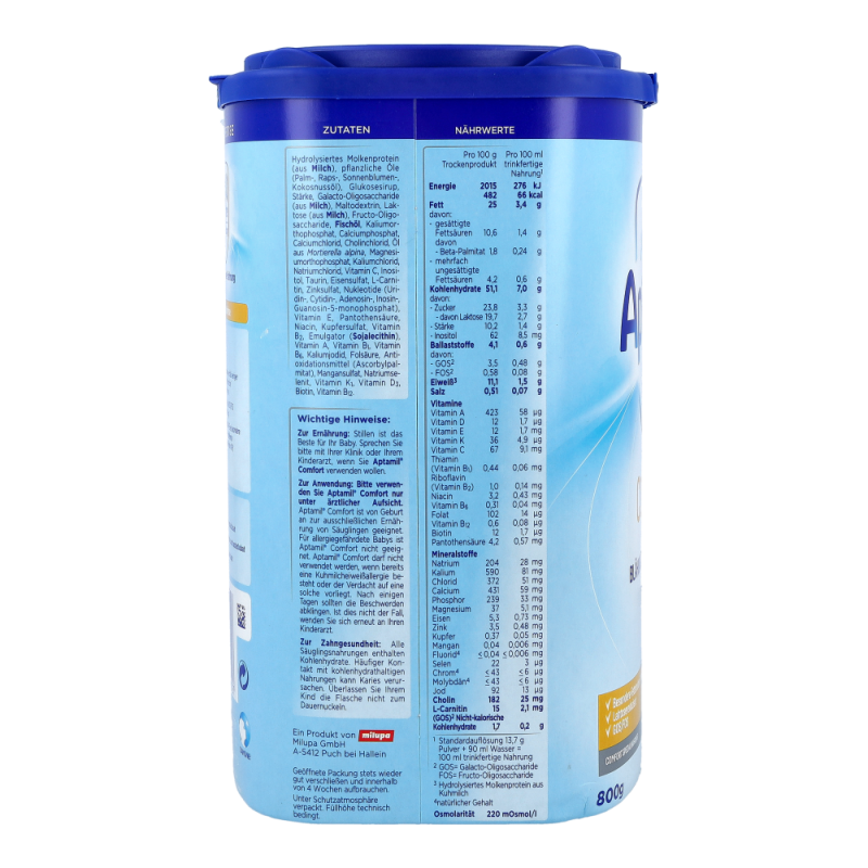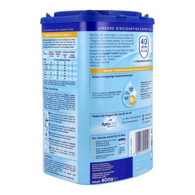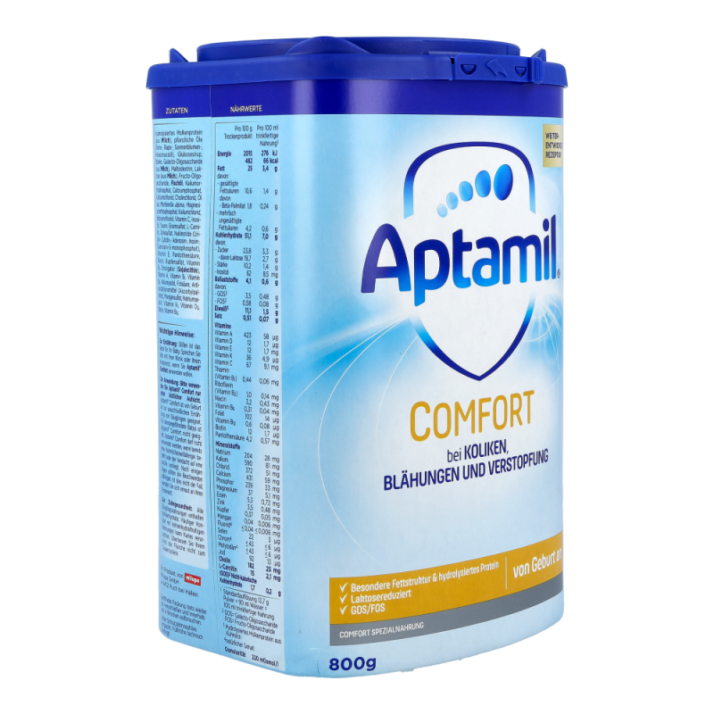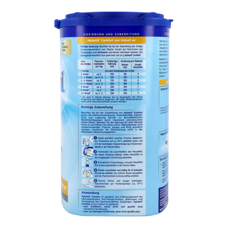 Milupa Aptamil Comfort 800 g ist geeignet für Babys mit ernährungsbedingten Verdauungsbeschwerden wie Drei-Monats-Koliken, Blähungen und Verstopfung. Sollte Ihr Kinderarzt Ihnen für Ihr flaschenernährtes Baby eine Spezialnahrung empfehlen, können Sie Aptamil Comfort von Geburt an zur ausschließlichen Ernährung Ihres Babys und nach dem 6. Monat im Rahmen einer gemischten Beikost verwenden.