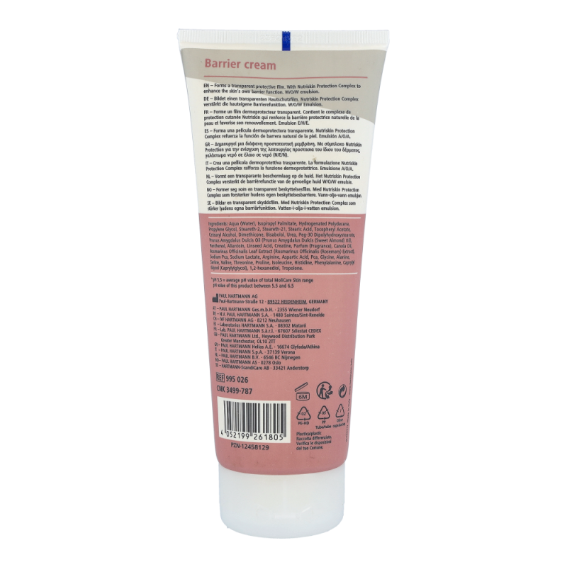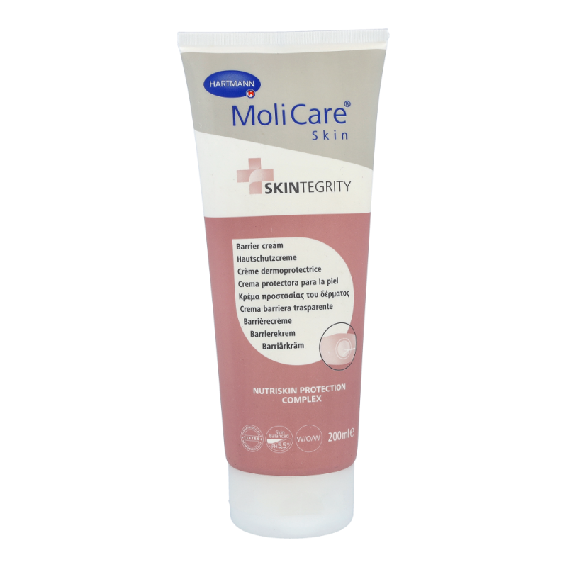 MoliCare Skin Hautschutzcreme 200 ml ohne Zinkoxid bildet einen durchsichtigen Schutzfilm auf der Haut. Die innovative Formel, angereichert mit Kreatin, Bisabolol, essentiellen Fettsäuren, Aminosäuren und Mandelöl. regeneriert und pflegt gereizte Haut.