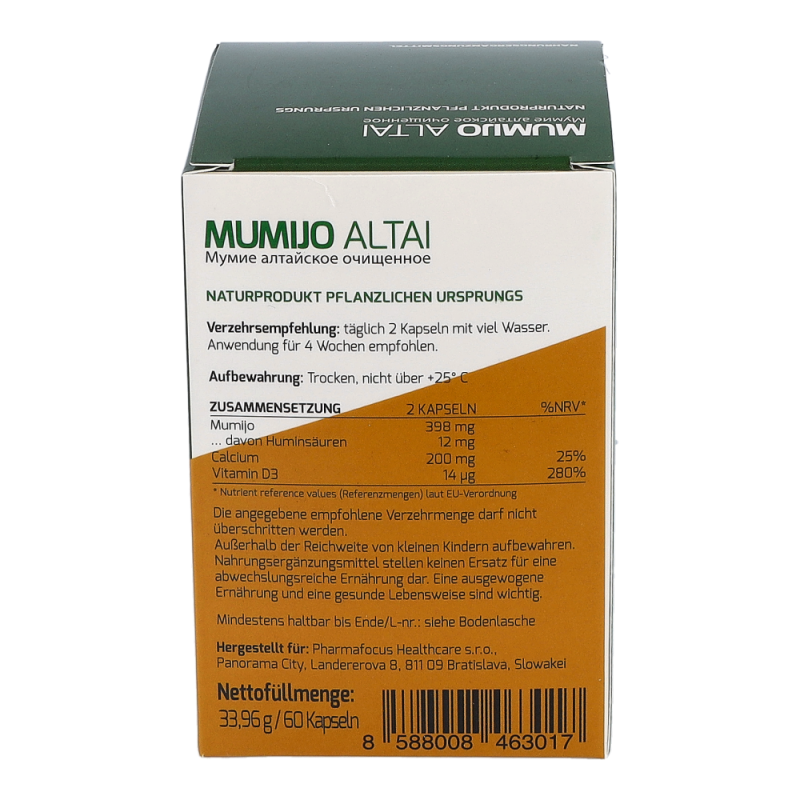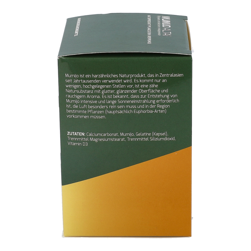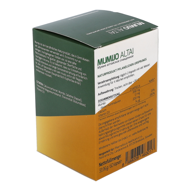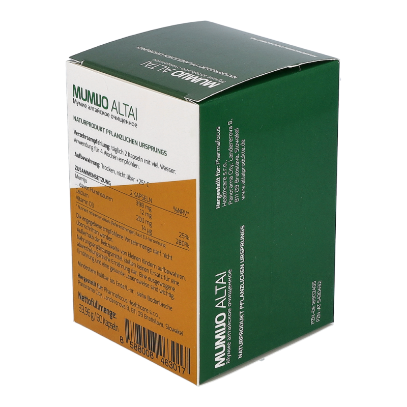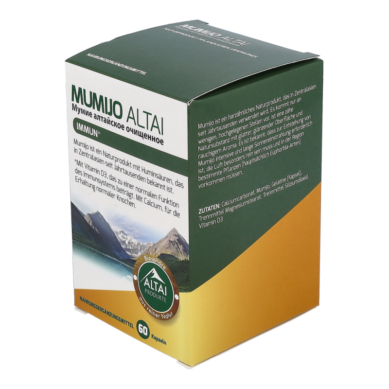 MUMIJO Altai Kapseln 60 Stk. ist ein harzähnliches Naturprodukt, das in Zentralasien seit Jahrtausenden verwendet wird. Gewonnen in den Höhen des sibirischen Altai- Gebirges ist Mumijo Altai ein komplexes Naturprodukt pflanzlichen Ursprungs mit Huminsäuren.