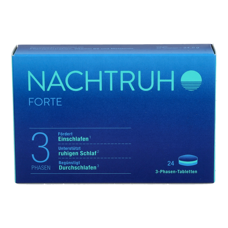 Nachtruh forte® ist die innovative 3-Phasen-Tablette bei Schlafproblemen aus ausgewählten Pflanzenextrakten, kombiniert mit dem körpereigenen Stoff Melatonin. Durch die zeitlich versetzte Freisetzung in 3 Phasen können die enthaltenen Inhaltsstoffe