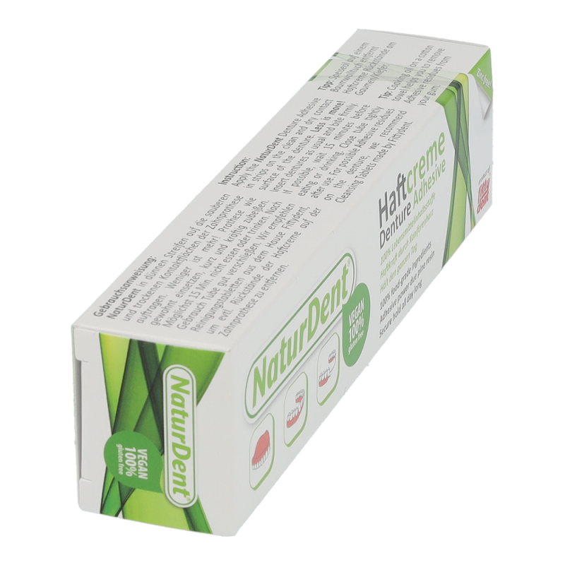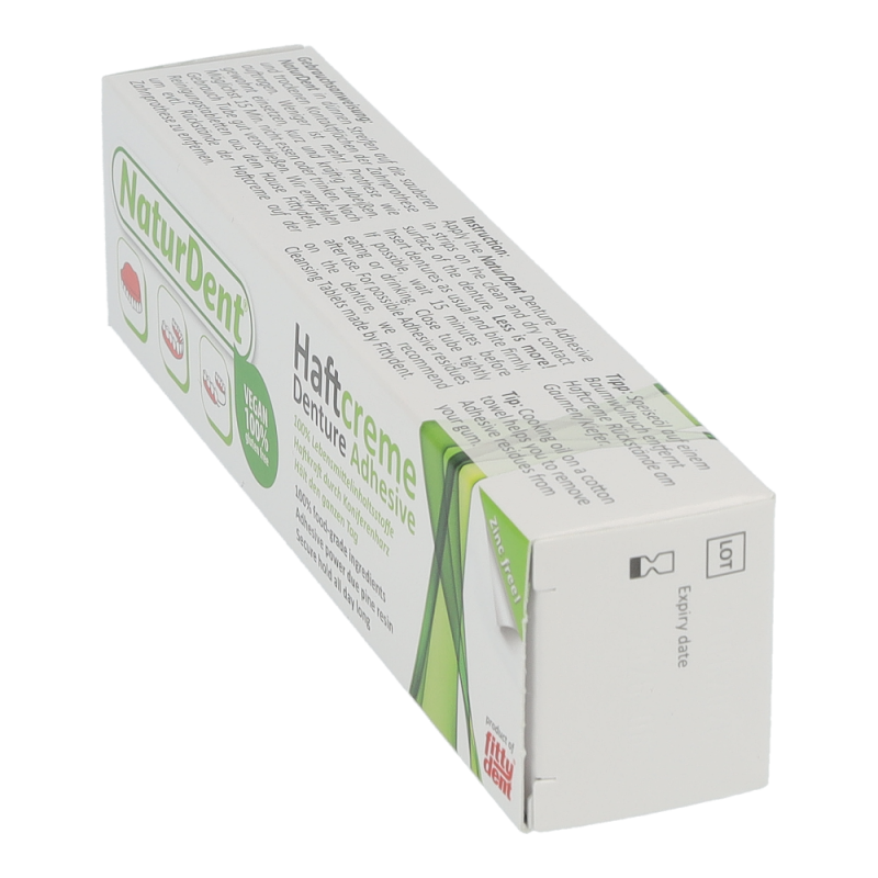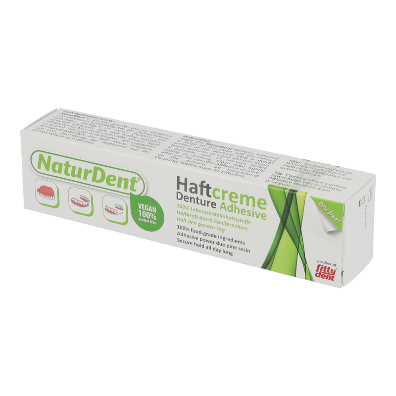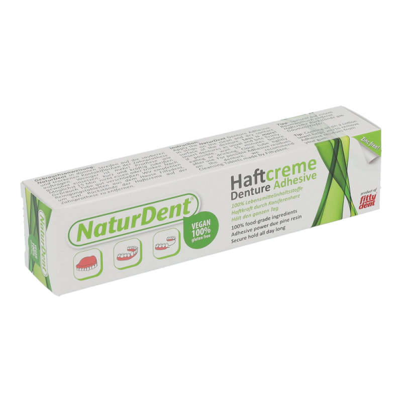 Naturdent Haftcreme Lebensmittel garantiert extra starken und extra langen Halt für Ober- und besonders auch für Unterkieferprothesen. Das natürliche Koniferenharz wirkt als perfekter Stabilisator für die Zahnprothese. Kein Verschieben, kein Verrutschen mehr und das sichere Gefühl den ganzen Tag lang.