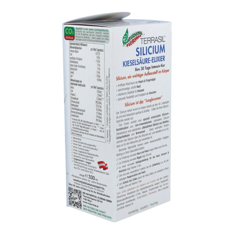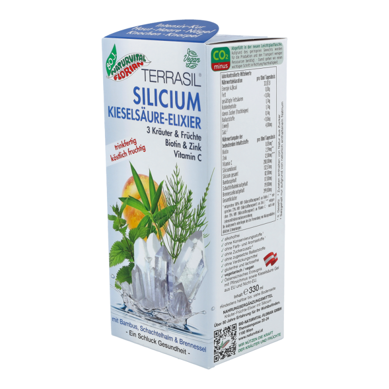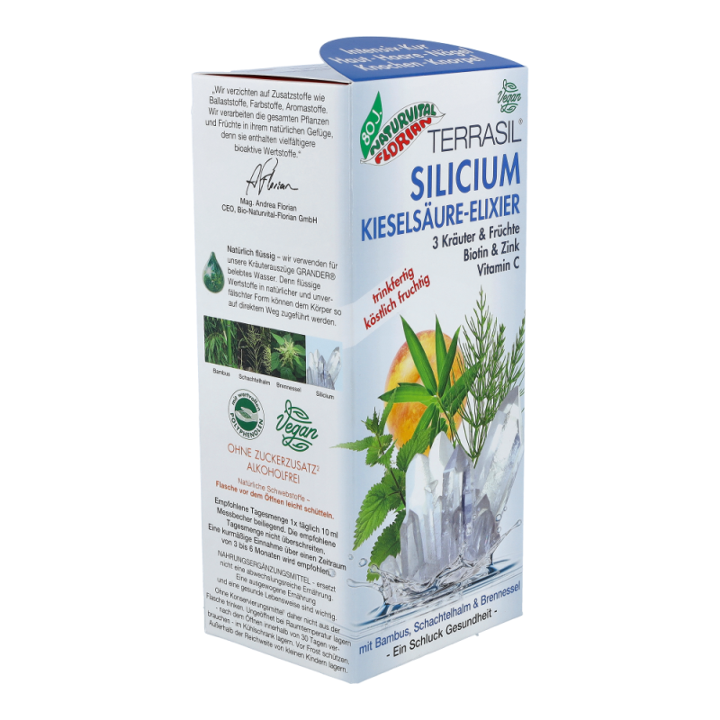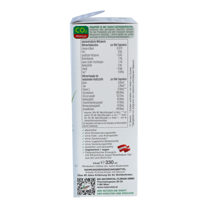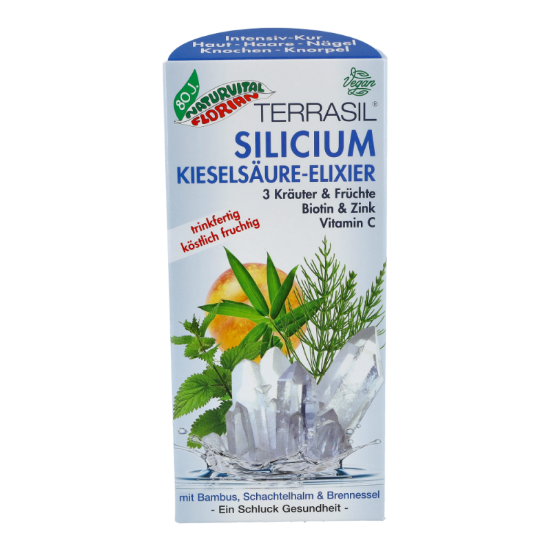 Naturvital Silicium Kieselsäure Elixier 330 ml ist ein gehaltreiches Nahrungsergänzungsmittel mit Kräutern und Früchten das Sie dabei unterstützt, Ihren Silicium-Speicher wieder aufzufüllen. Eine speziell entwickelte Silicium-Kombination aus reinmineralischem, kolloidalem Silicium (Kieselsäure) und natürlichem, pflanzlichem Silicium aus Bambus, Schachtelhalm und Brennessel garantiert die optimale Bioverfügbarkeit und kann einen wesentlichen Beitrag zu Ihrer Gesundheit leisten.