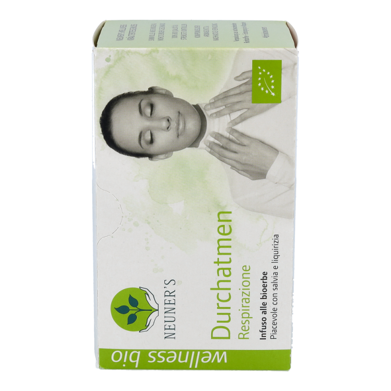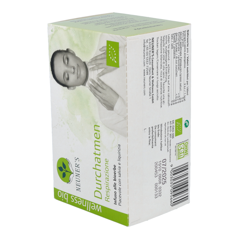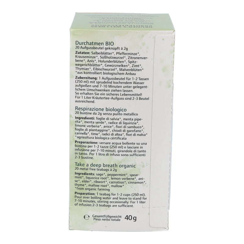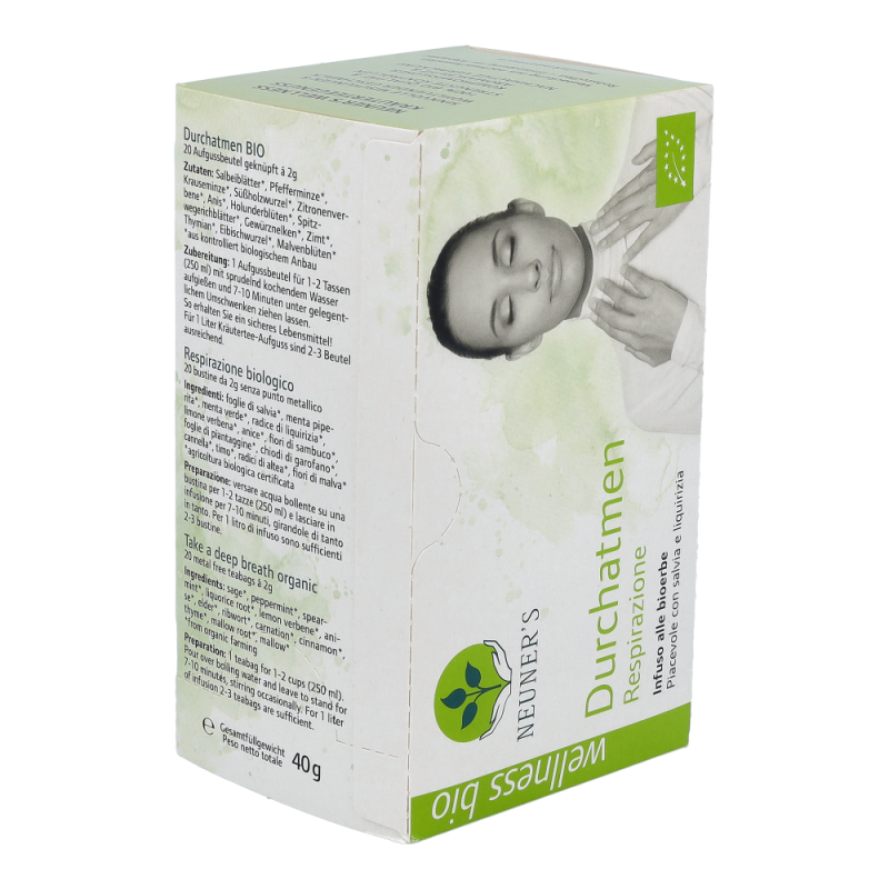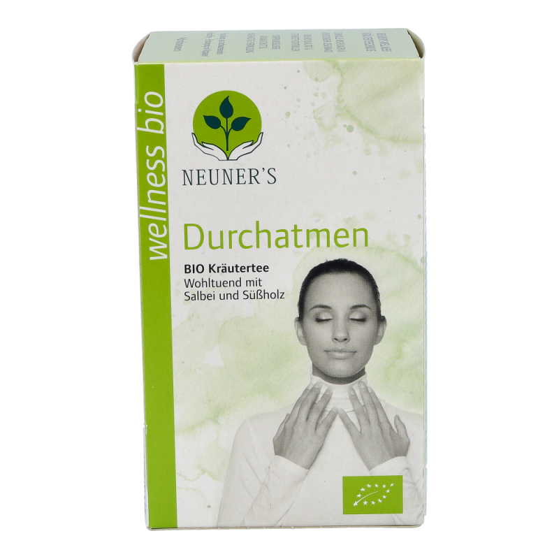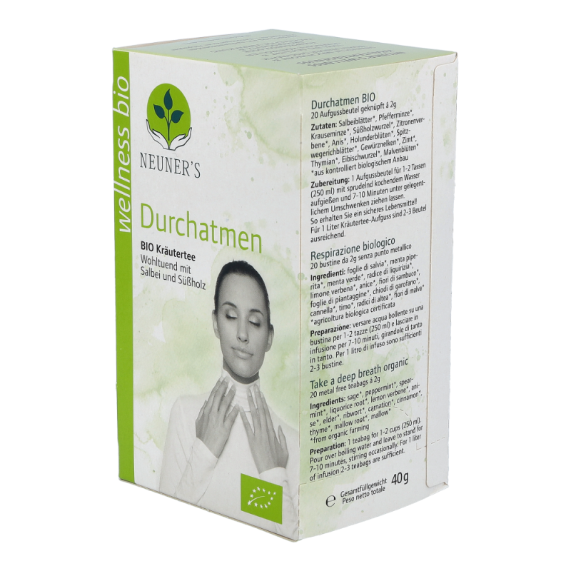Einzigartig im Geschmack, ist diese Kräuterteemischung vor allem durch die Verbindung von süßer Süßholzwurzel und herbem Salbei. Die Frische von Pfefferminze und Krauseminze unterstützen dieses Spiel harmonisch. Alle großen Namen der Hals- und Atemwegskräuter sind dabei – Anis, Eibisch, Malve, Spitzwegerich, Thymian und die schon genannten Süßholz und Salbei! Dabei wird der tolle Geschmack in jedem Beutel zu Beiwerk, für den Grund, der ihm seinen Namen gibt – Durchatmen. Tief einatmen und Gelassenheit spüren. Im Sommer wie im Winter haben Sie jetzt das ideale Getränk um frei, tief durchzuatmen!