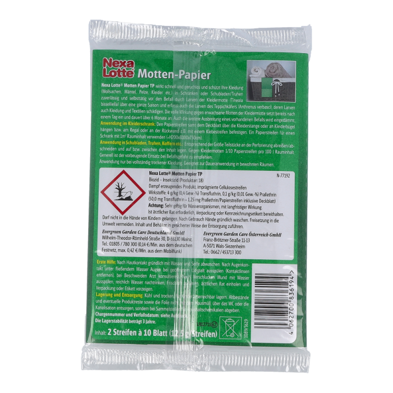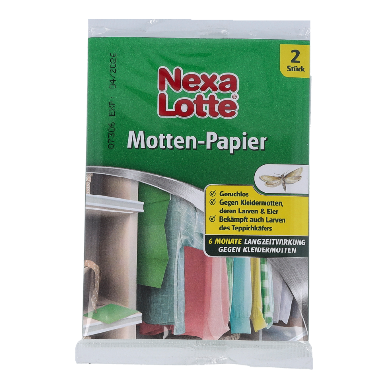 Nexa Lotte Mottenschutz sind Papierstreifen für Schränke und Behälter. Der Mottenschutz wirkt vorbeugend gegen Mottenlarven und Pelzkäferlarven. Außerdem schützt der geruchlose Schutz 6 Monate gegen diese Lästlinge..