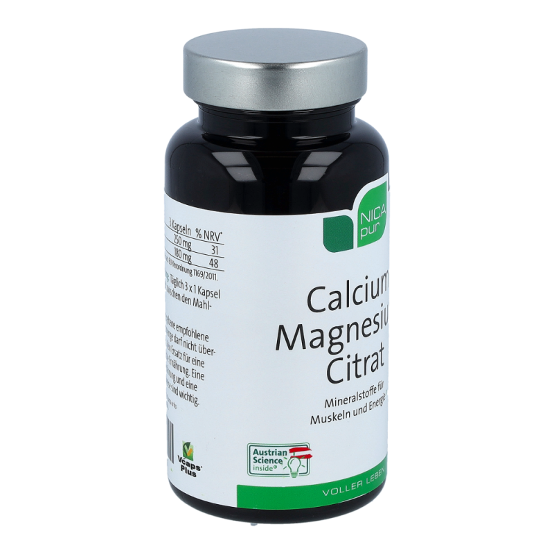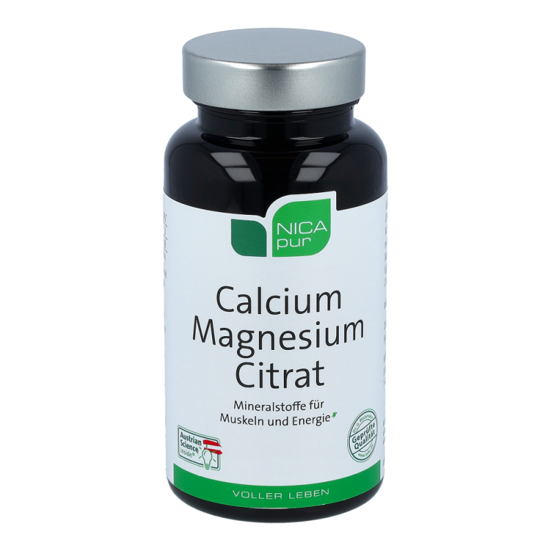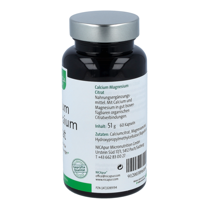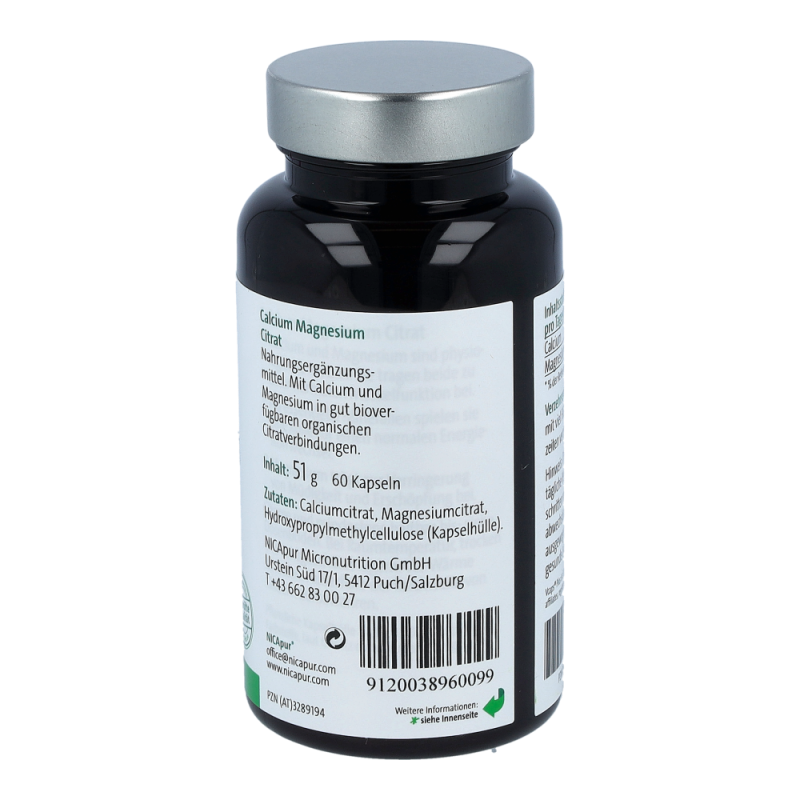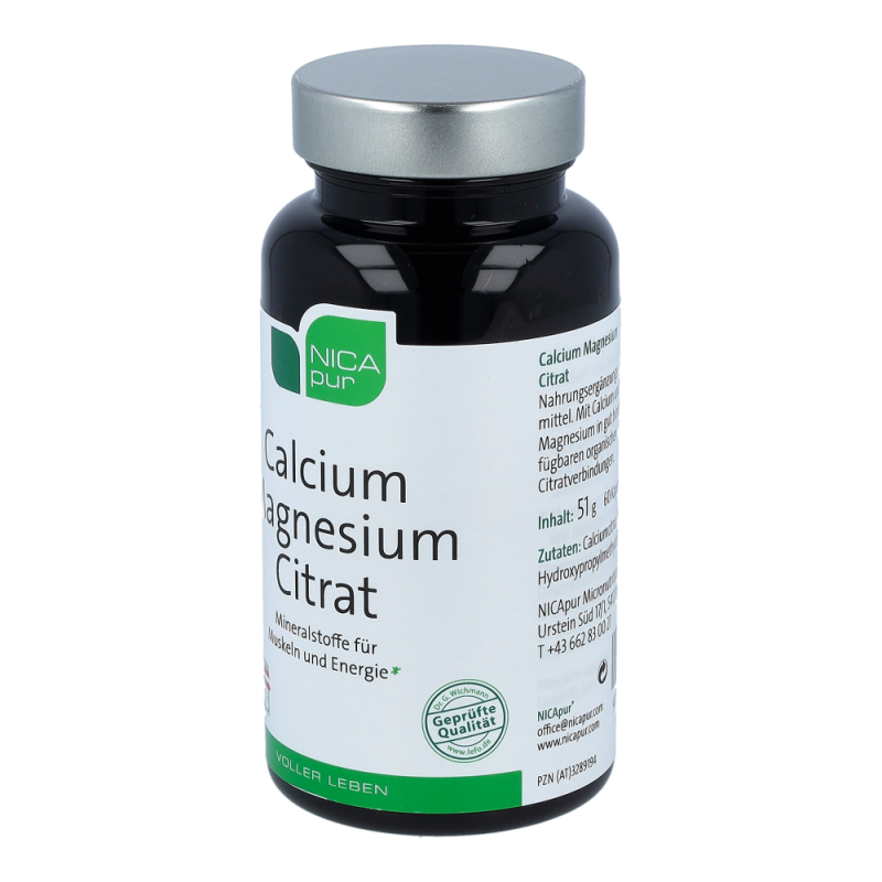NICApur Calcium Magnesium Citrat Kapseln ist ein Nahrungsergänzungsmittel mit Calcium und Magnesium in gut bioverfügbaren organischen Citratverbindungen. Calcium und Magnesium sind wichtige Strukturbildner für Knochen und Zähne und tragen zu einem ausgeglichenen Elektrolythaushalt bei. Als biologische Partner werden sie für Muskel- und Nervenfunktionen benötigt. Während Calcium für Knochen, Zähne, Muskeln und Nerven große Bedeutung hat, ist Magnesium für eine optimale Energieversorgung verantwortlich. Magnesium trägt zum Erhalt gesunder Knochen bei und unterstützt das Herz in seiner Funktion. Vor allem Menschen, die ihren Energiestatus ins Gleichgewicht bringen wollen, benötigen Magnesium. Zusammen sind die Mineralstoffe Calcium und Magnesium ein wahrhaftiges Powerduo..