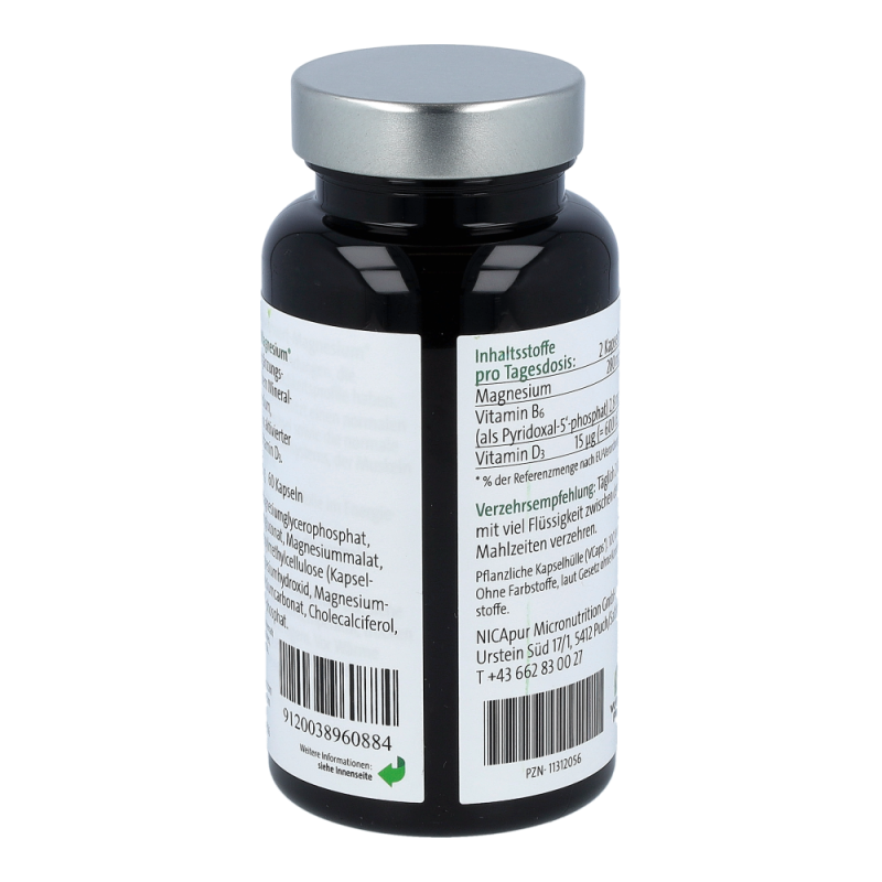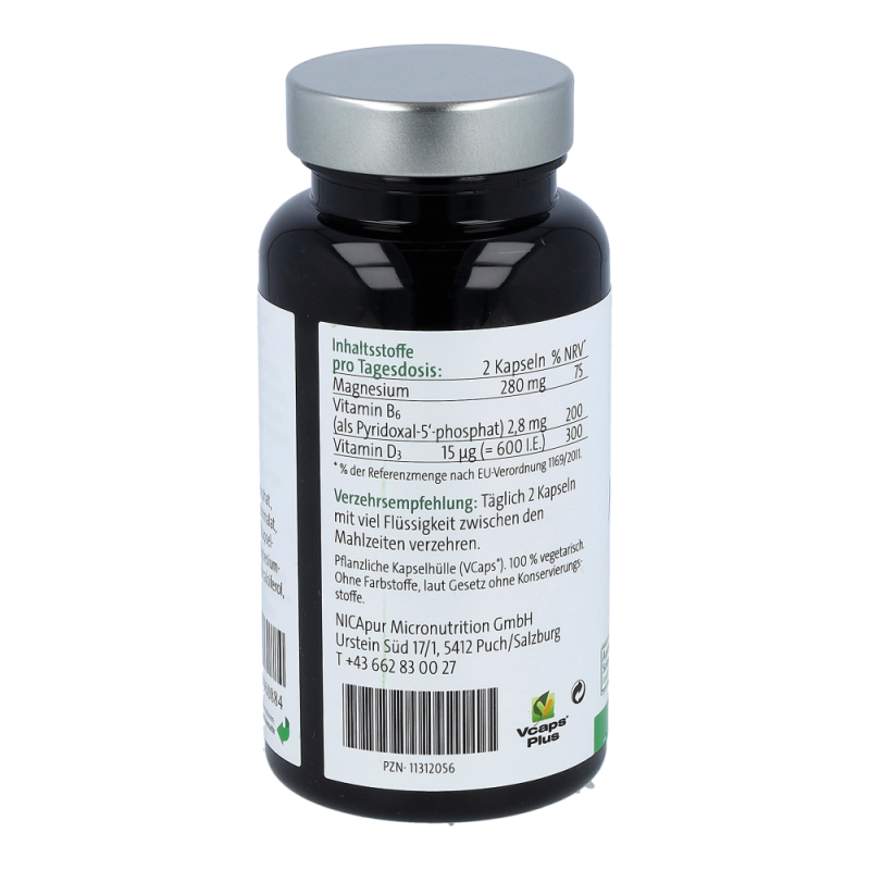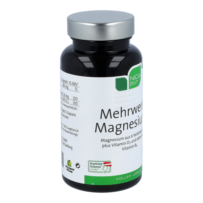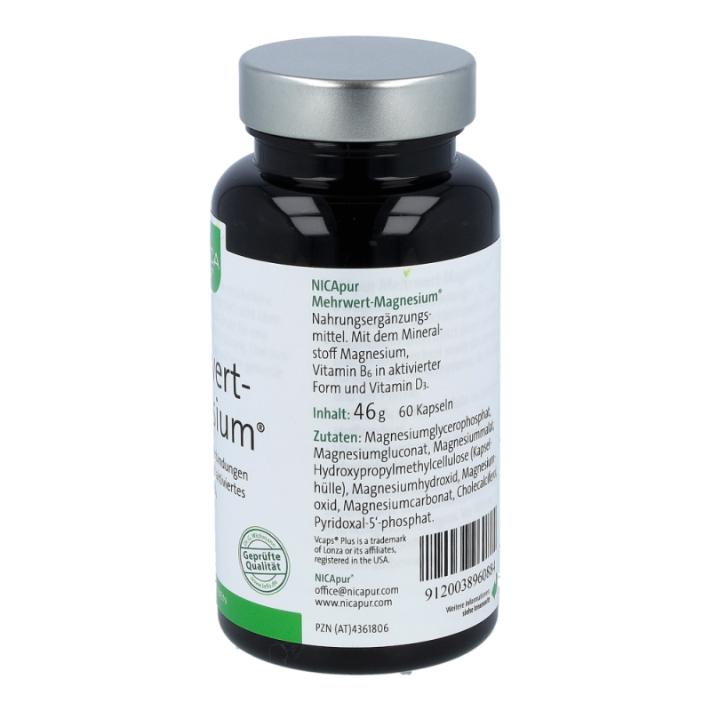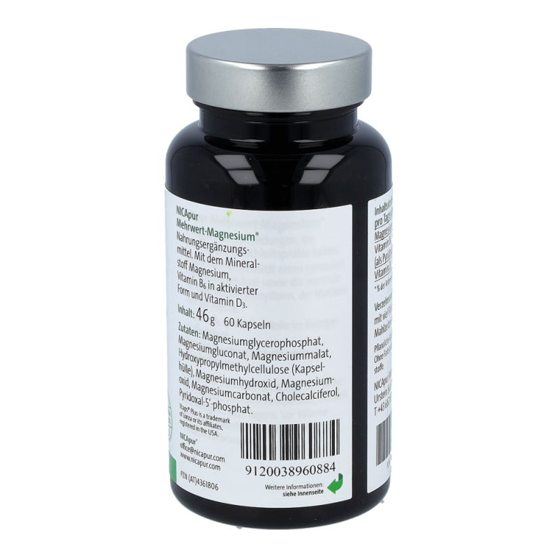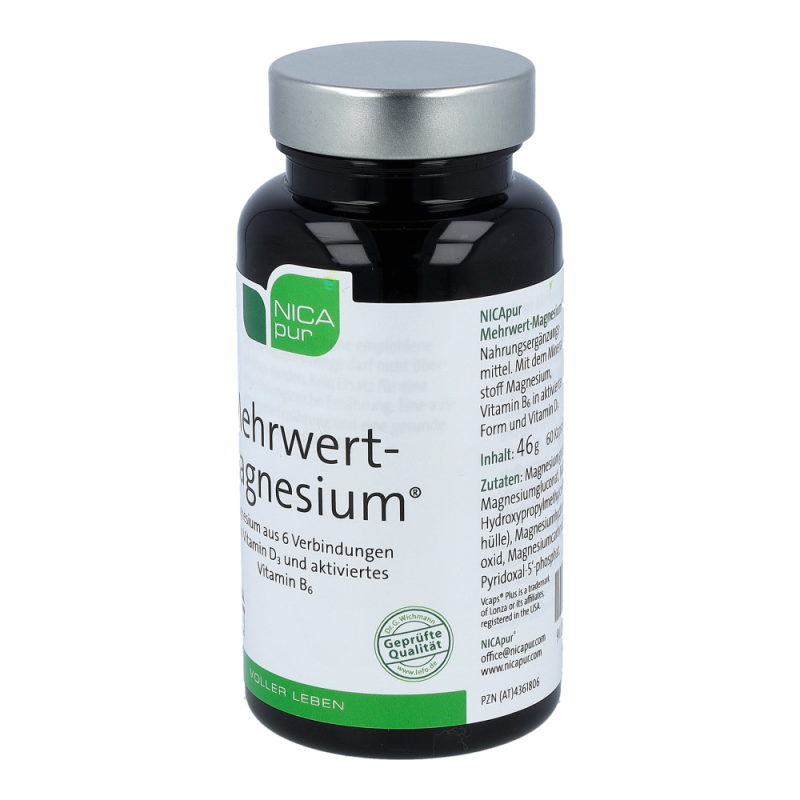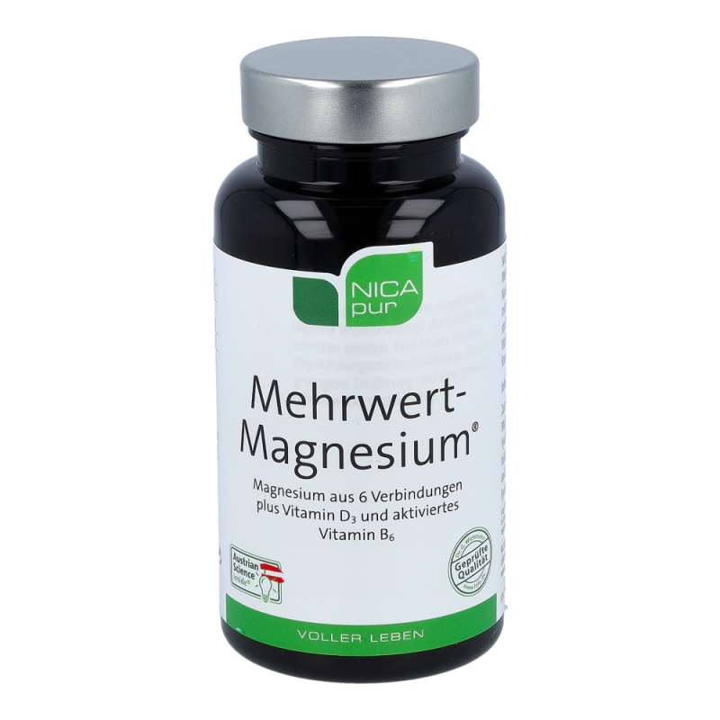 Der Mineralstoff Magnesium liegt im NICApur Mehrwert-Magnesium® in sechs organischen und anorganischen Verbindungen vor. Durch diese besondere, ideal abgestimmte Mischung wird eine gute Magnesiumversorgung erzielt. Für „Mehrwert“ sorgt neben dem Mix aus sechs verschiedenen Magnesiumverbindungen auch die Kombi-Formel mit Vitamin D und B6. Das Nahrungsergänzungsmittel unterstützt den normalen Energiestoffwechsel sowie die normale Funktion des Nervensystems, der Muskeln und der Psyche. Zudem verringert es Müdigkeit und Erschöpfungszustände und fördert das Elektrolytgleichgewicht im Körper