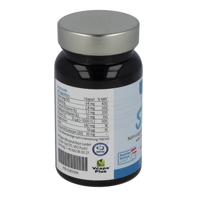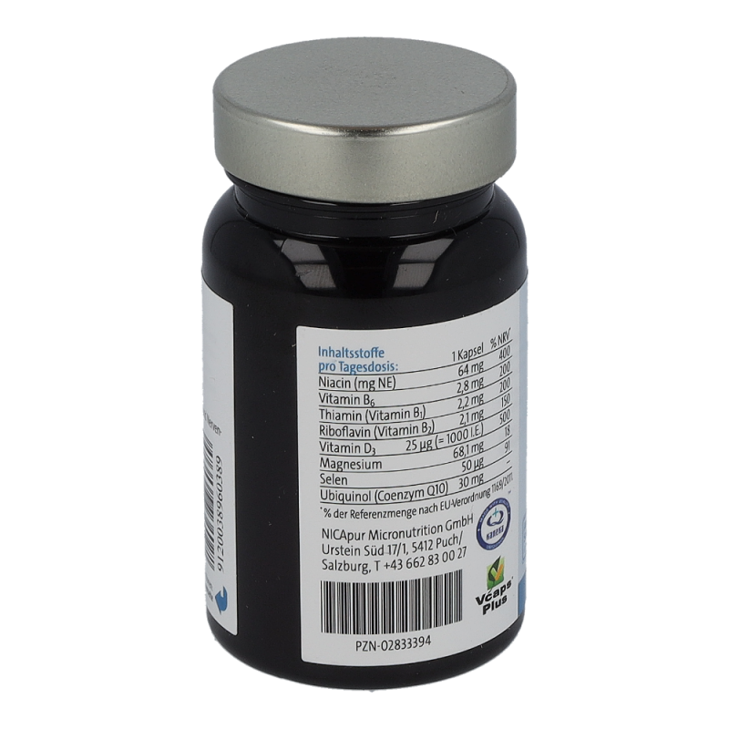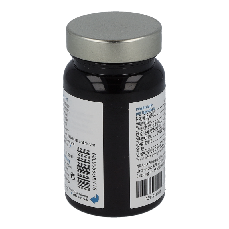 Magnesiumcitrat, Ubiquinol (Coenzym Q10), Hydroxypropylmethylcellulose (Kapselhülle), Inositolhexanicotinat, Natriumselenit, Cholecalciferol, Pyridoxinhydrochlorid, Thiaminmononitrat, Riboflavin.