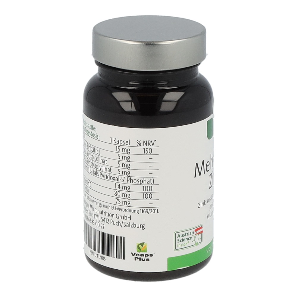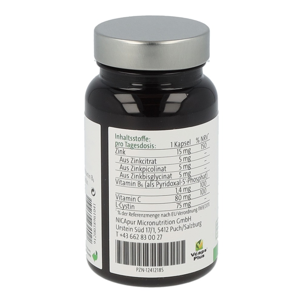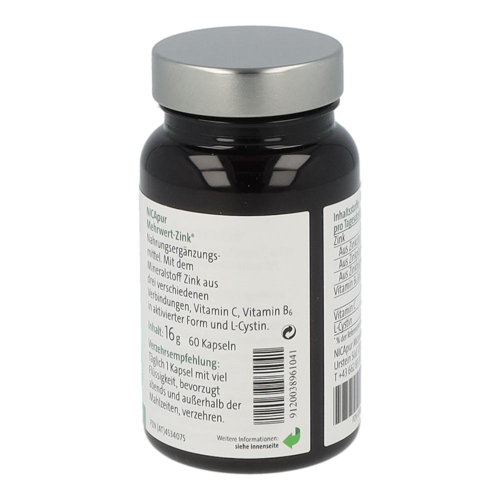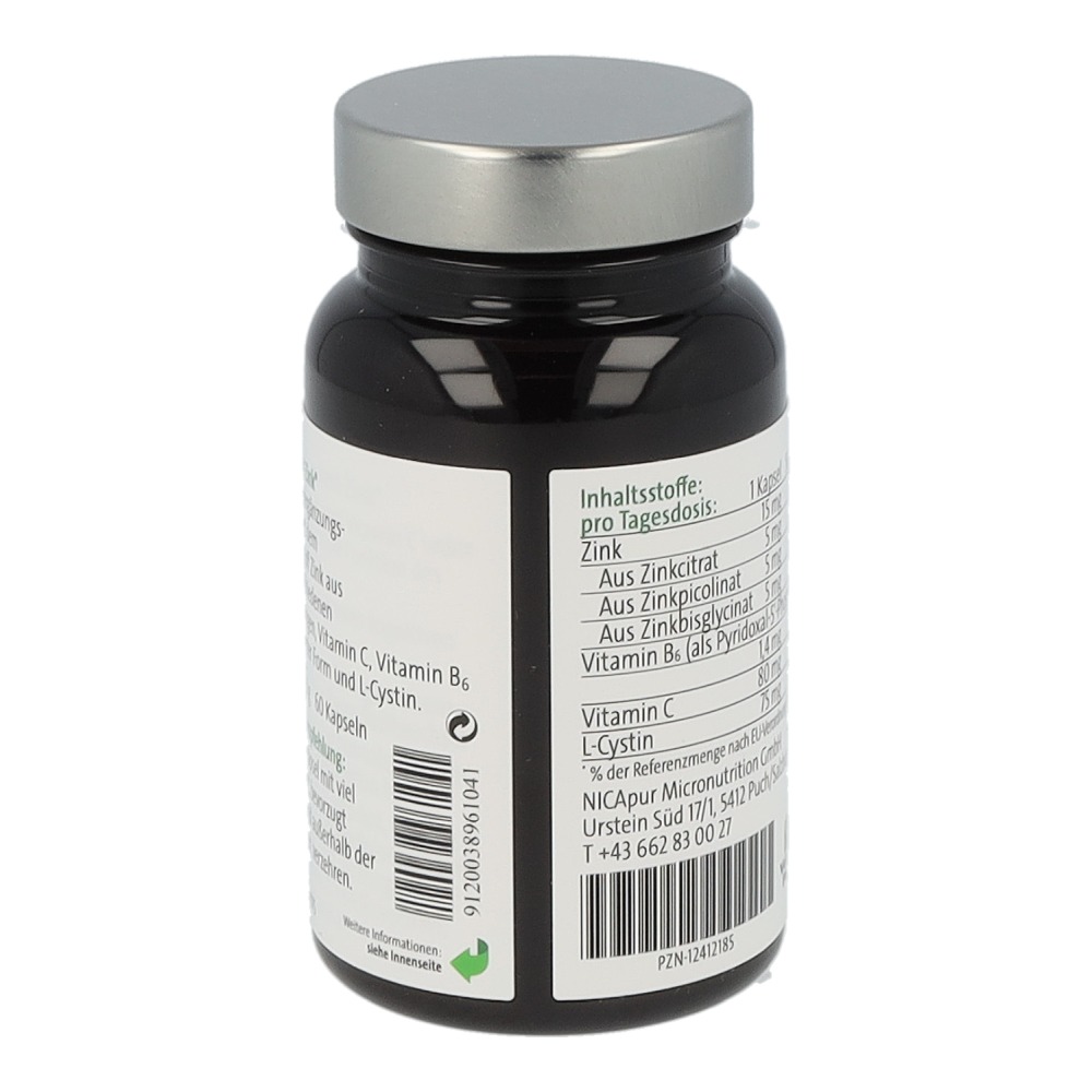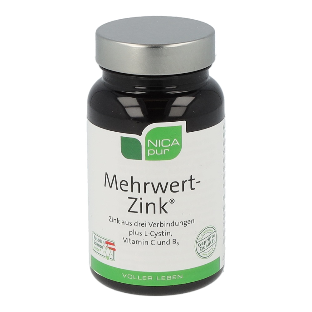Nicapur Mehrwert-Zink ist ein Nahrungsergänzungsmittel mit dem Mineralstoff Zink aus drei verschiedenen Verbindungen, Vitamin C, Vitamin B6 in aktivierter Form und L-Cystin