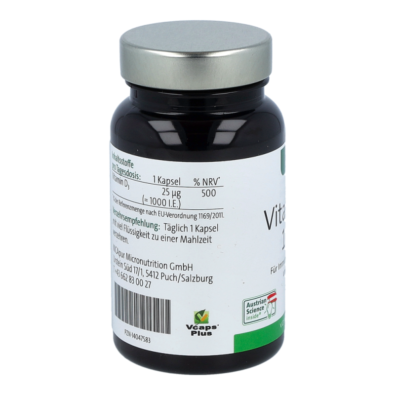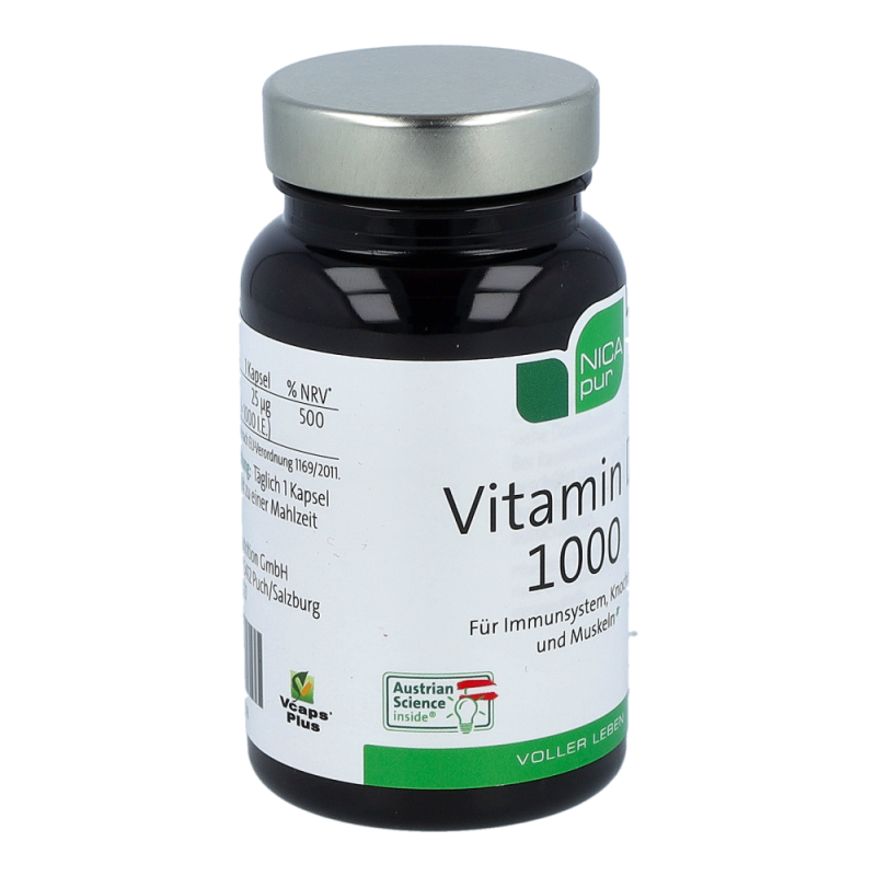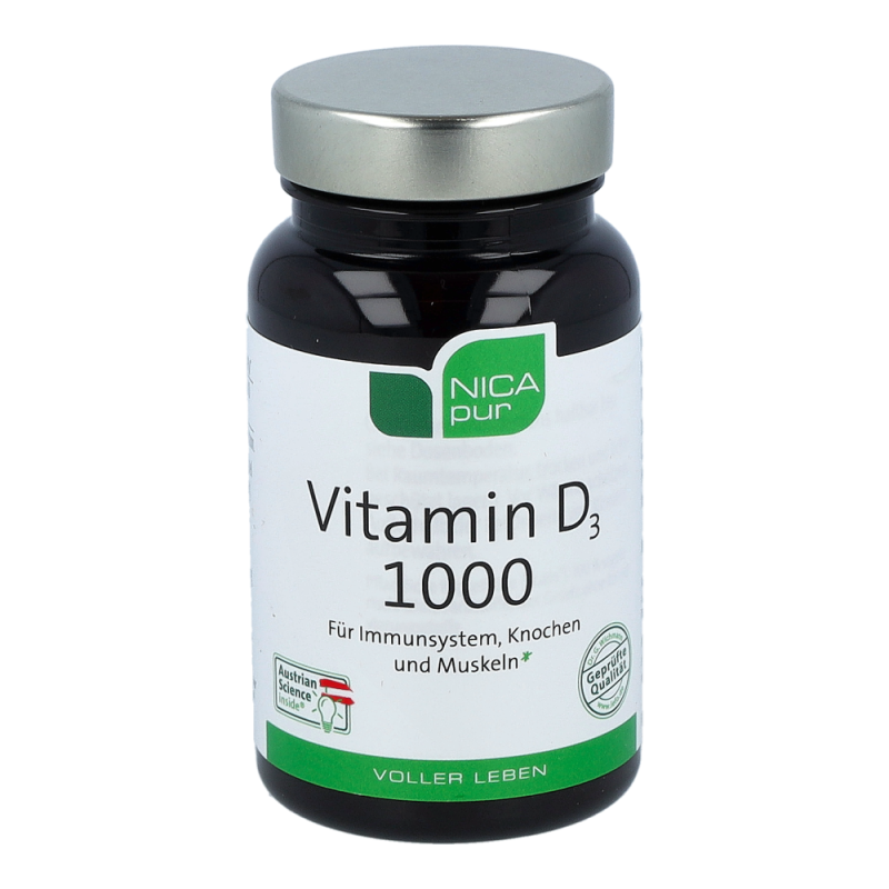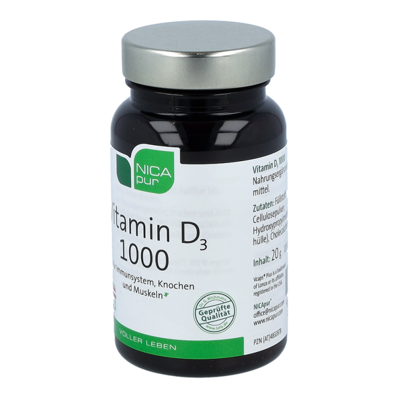 Nicapur Vitamin D 1000 ist ein Nahrungsergänzungsmittel mit einem besonders hohem Gehalt an Vitamin D. Vitamin D unterstützt die normale Funktion des Immunsystems und leistet einen wesentlichen Beitrag für die Funktion der Muskeln, für die Knochen sowie für die Aufrechterhaltung eines normalen Calcium-Spiegels im Blut.
