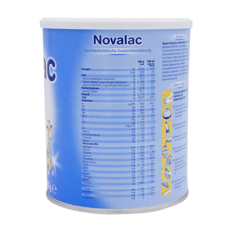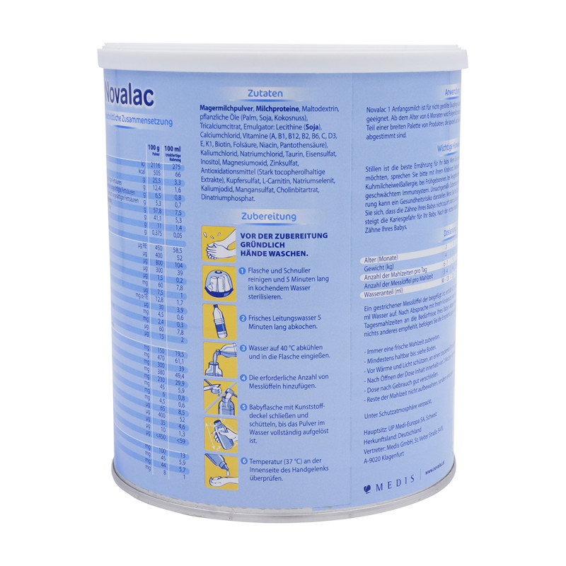 Novalac 1 ist eine Säuglingsanfangsnahrung für Babys von 0-6 Monate. Novalac 1universelle Säuglingsmilchnahrungbefriedigt alle Ernährungsansprüche eines Babys bis zum 6. Lebensmonat. Es hat eine muttermilchnahe Zusammensetzung und enthält alle Eiweiße, Fette, Kohlenhydrate, Aminosäuren, Vitamine und Mineralstoffe, die ein Baby für eine gesunde Entwicklung und ein gesundes Wachstum benötigt. Novalac 1 ist für Babys geeignet, die nicht, oder nur teilweise gestillt werden von Geburt an bis zum 6. Lebensmonat.