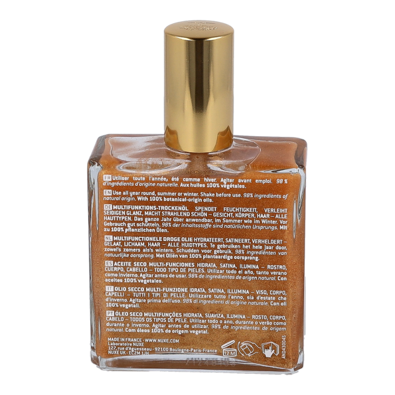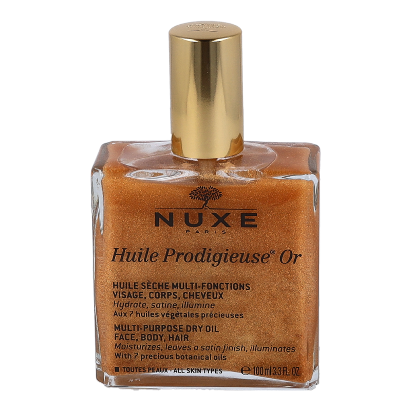 Nuxe Huile Prodigieuse Trockenöl Or ist ein Trockenöl mit Schimmereffekt. Es nährt und macht die Haut geschmeidig und strahlend, dank seiner sehr feinen Perlmuttpartikel mineralischen Ursprungs. Pflegen Sie in einem Durchgang Haut und Haar. Die Trockenöltextur ist einzigartig und der Duft wunderbar wohltuend.