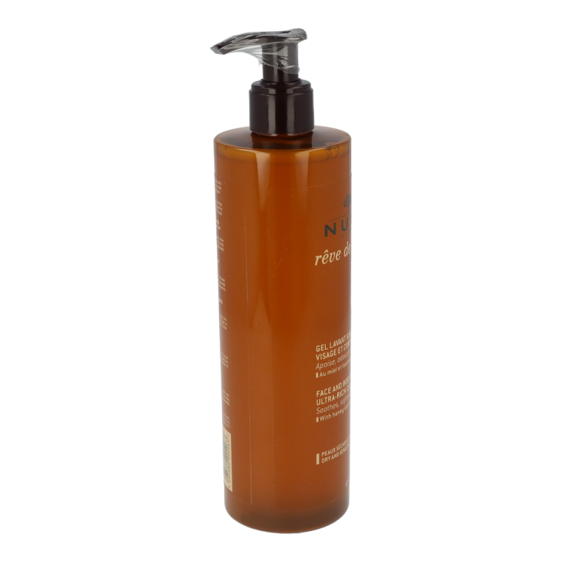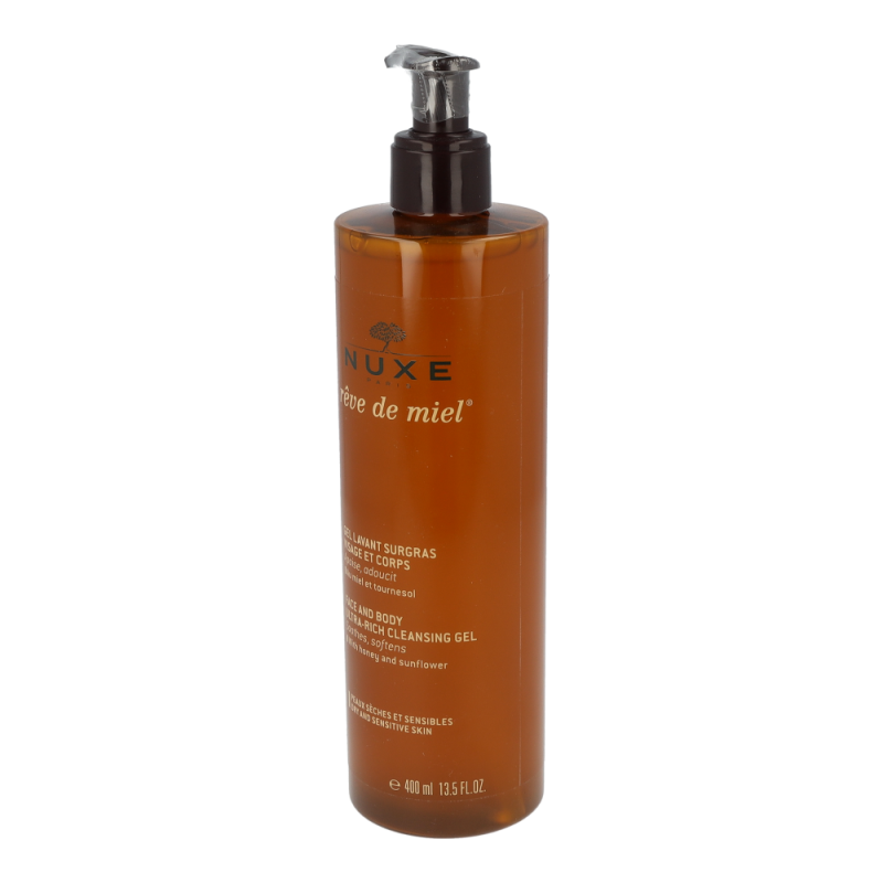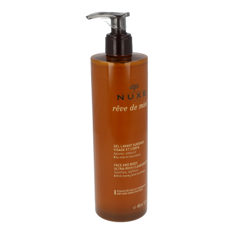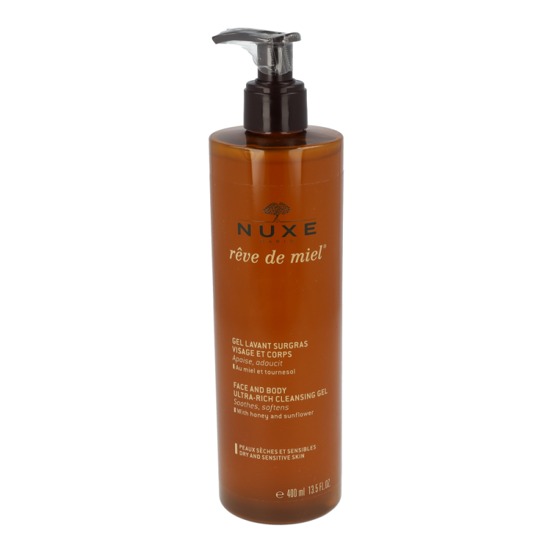 Nuxe Reve de Miel Reinigungsgel pflegt trockene und empfindliche Haut Tag für Tag. Mit seinem atemberaubenden Honig-Aroma schützt die reichhaltige Gesichts- und Körperpflege mit Honig und Sonnenblume den Hydrolipidfilm der Haut. Reinigt Gesicht und Körper, ohne dabei die Haut auszutrocknen. Nehmen Sie sich Zeit, die nur Ihnen gehört und gönnen Sie sich eine verwöhnende Pflegedusche.