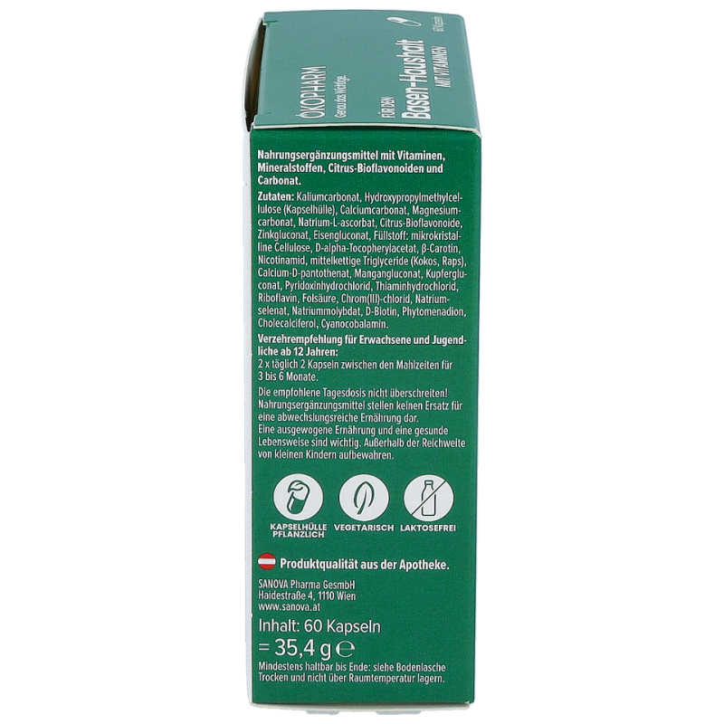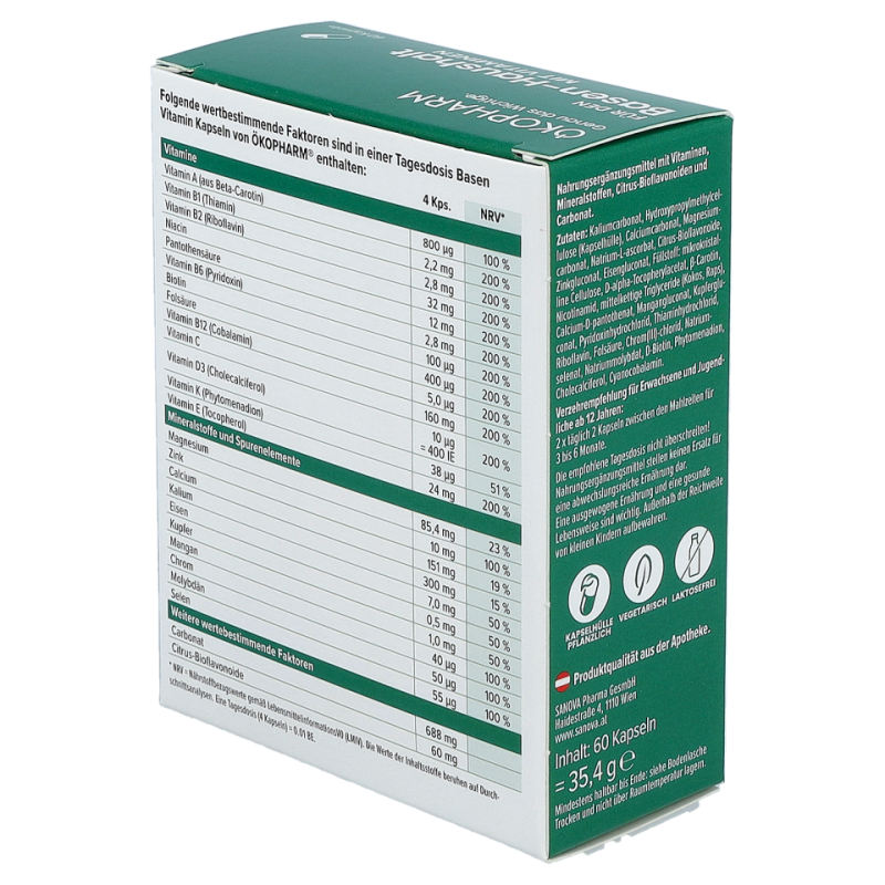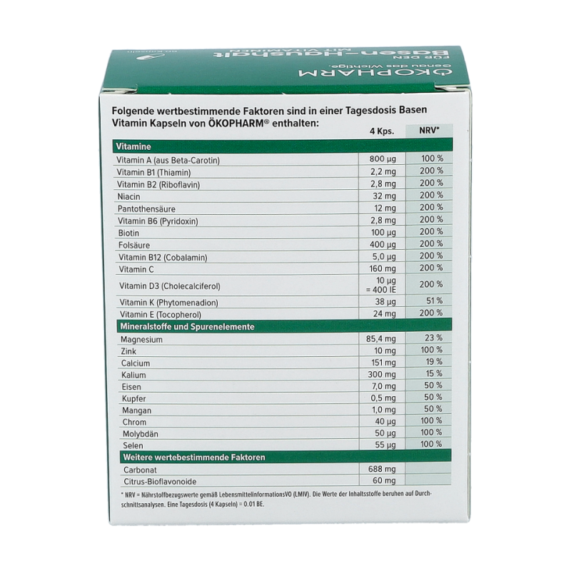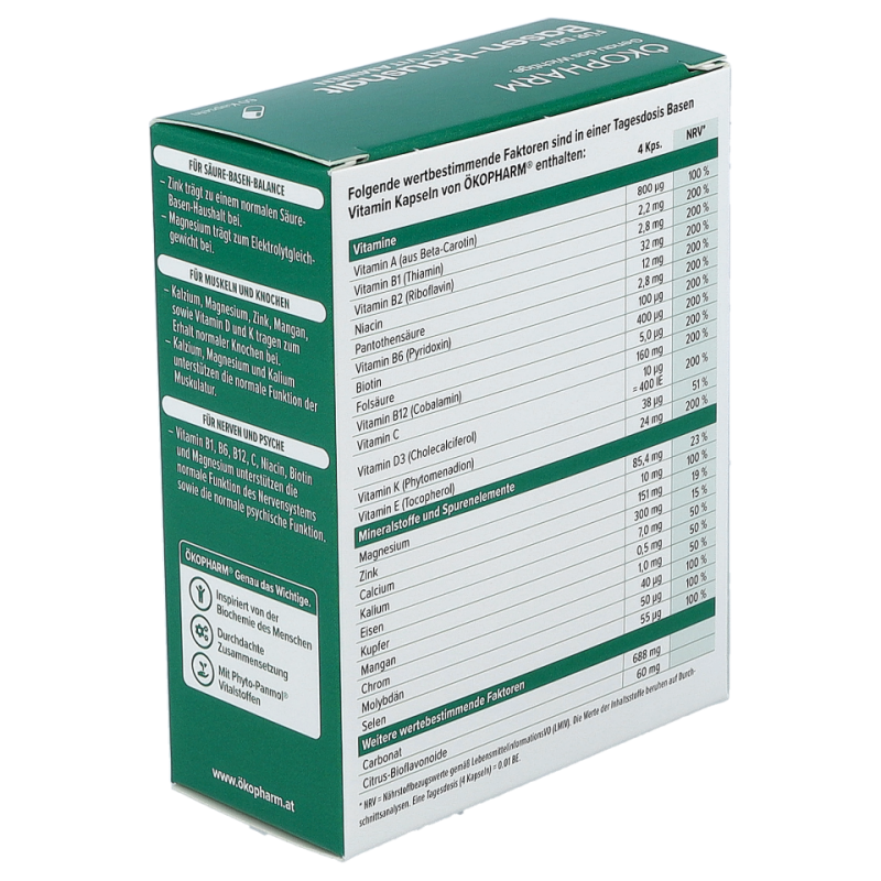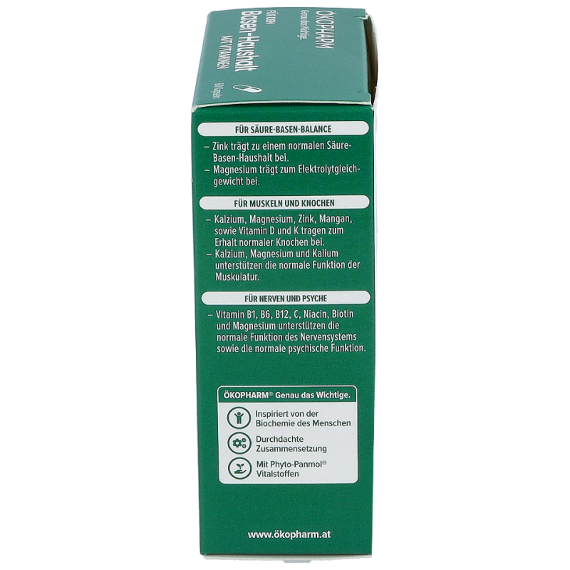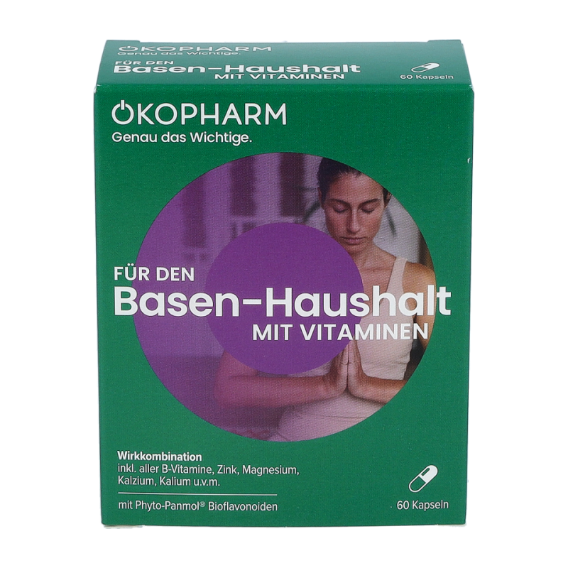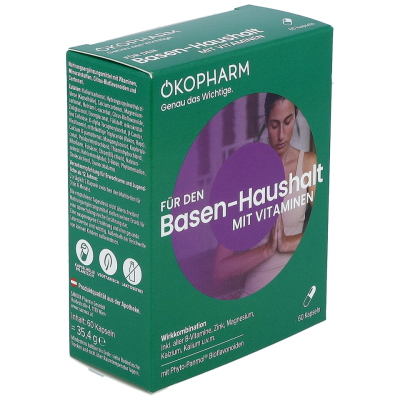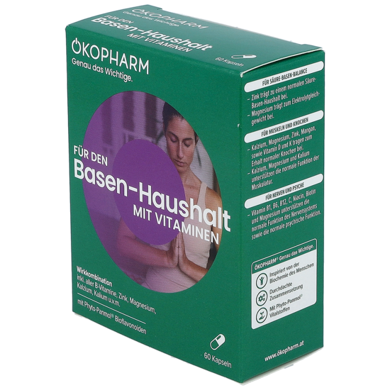 Ökopharm Basen Vitamin Wirkkomplex 60Stk. ist durchdacht zusammengesetzt mit basischen Mineralien Magnesium, Kalium und Calcium, 1Zink zur Unterstützung einer ausgeglichenen Säure-Basen-Balance, allen 28 B-Vitaminen, Phyto-Panmol® Basenelemente aus Kartoffelpresssaft und Dolomitpulver und vielem mehr.