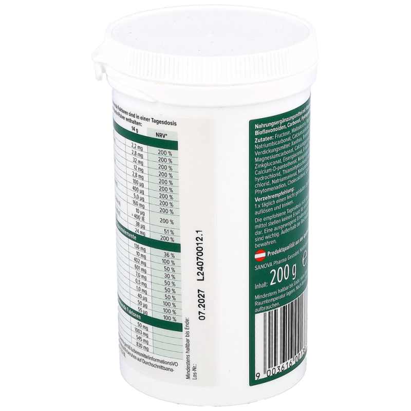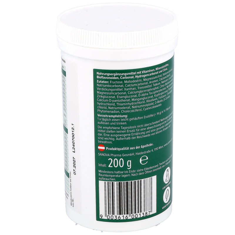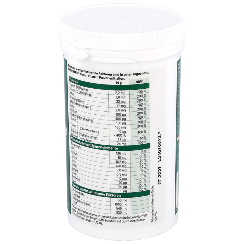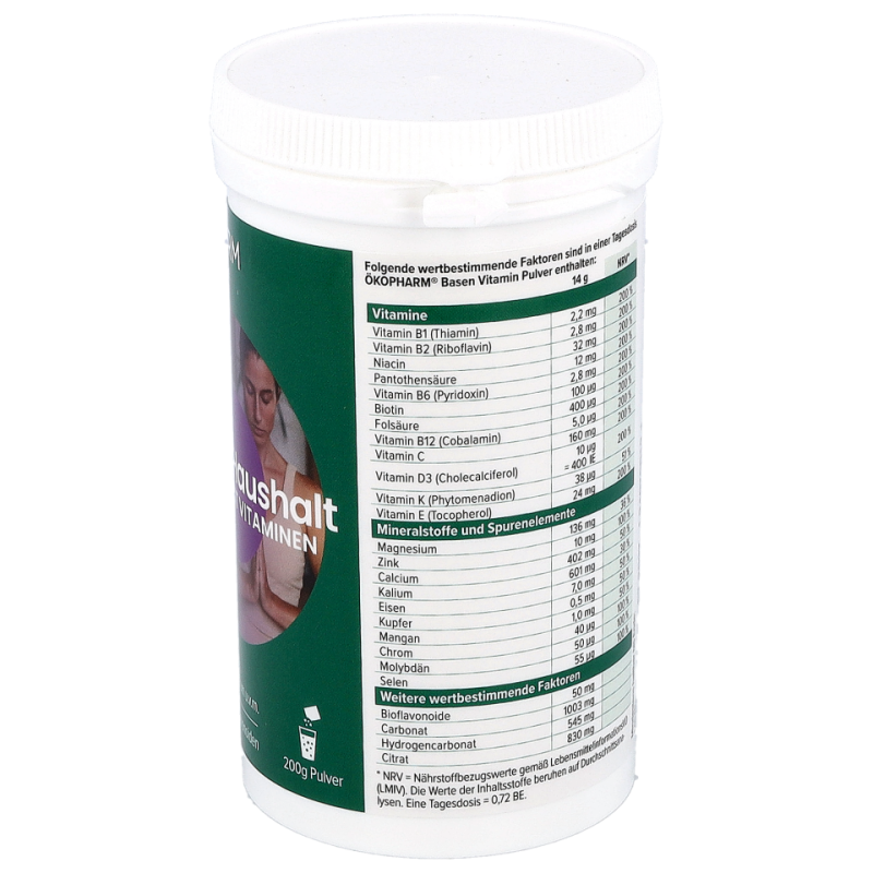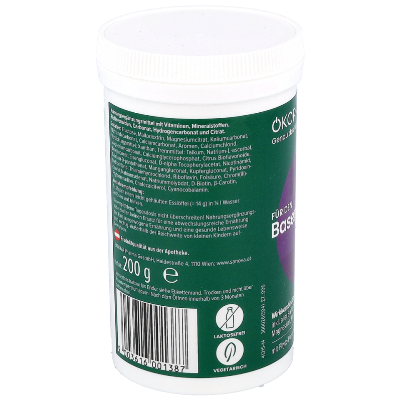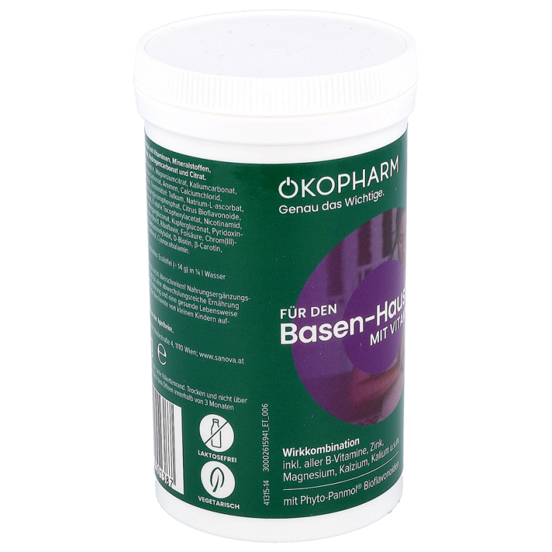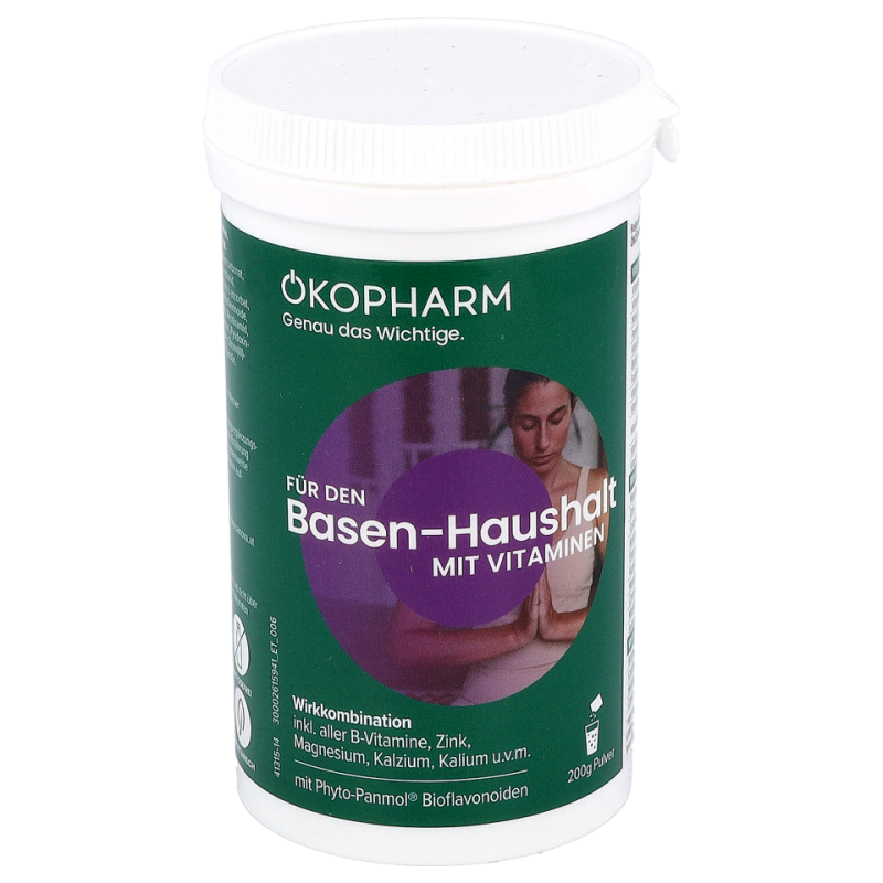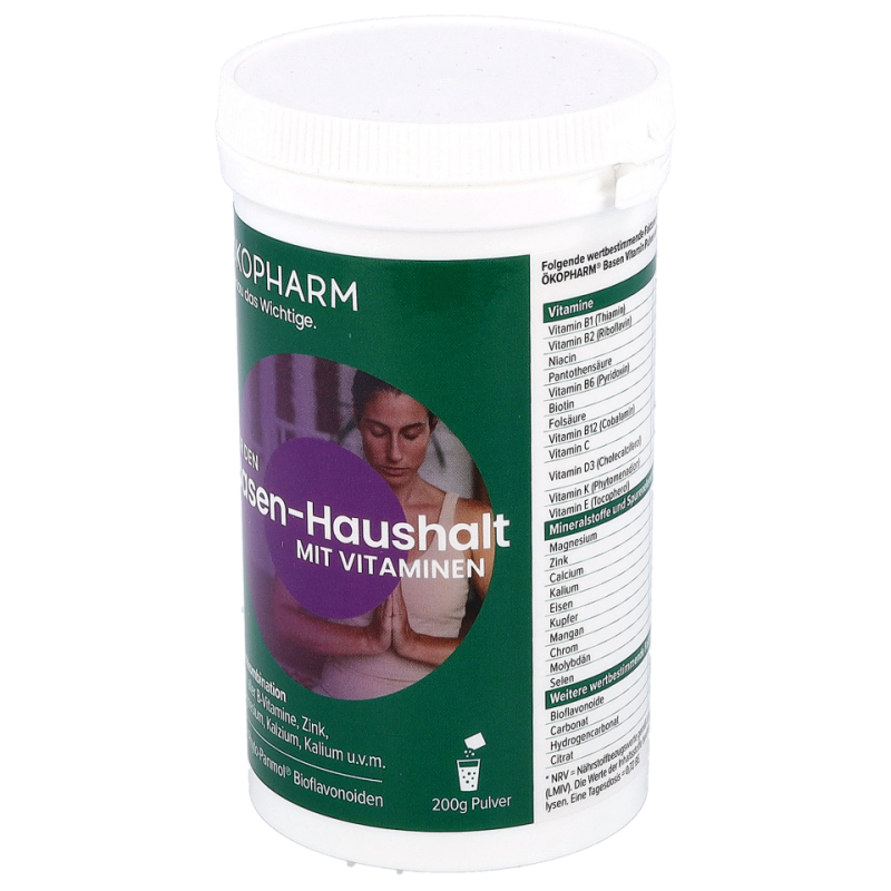 Ökopharm Basen Vitamin Wirkkomplex Basenpulver 200 g – ehemals Baso Vital Forte ist durchdacht zusammengesetzt mit basischen Mineralien Magnesium, Kalium und Calcium, 1Zink zur Unterstützung einer ausgeglichenen Säure-Basen-Balance, allen 28 B-Vitaminen und Phyto-Panmol® Bioflavonoide aus dem hochwertigen Extrakt wertvoller Citrusfrüchte