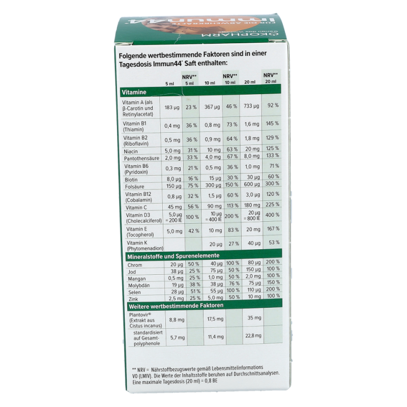 Folgende wertbestimmende Faktoren sind in einer Tagesdosis Immun44* Saft enthalten: