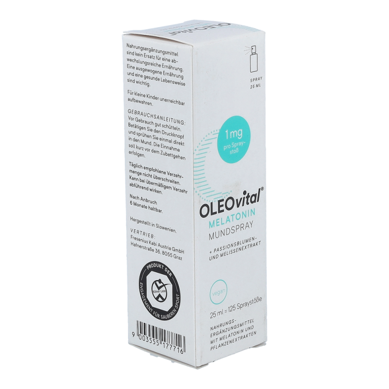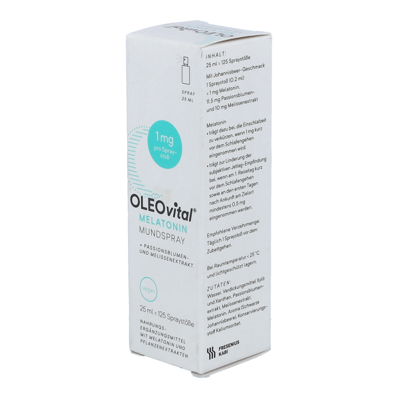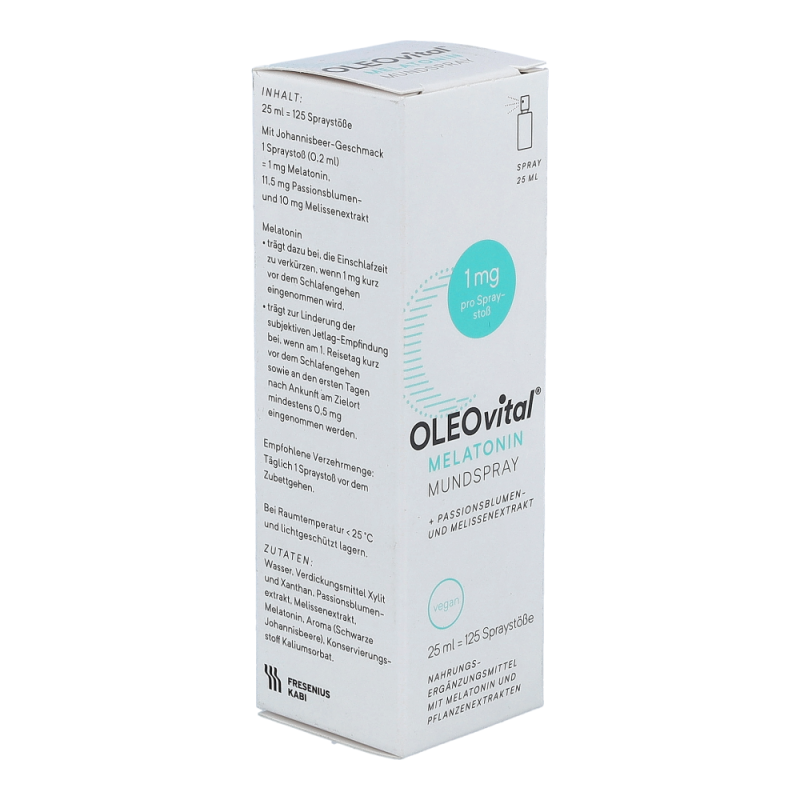 OLEOvital® Melatonin Mundspray sorgt mit einer innovativen, praktischen Darreichungsform für erholsamen Schlaf. Für die Einnahme ist kein Wasser erforderlich! 125 Spraystöße mit köstlichem Johannisbeergeschmack