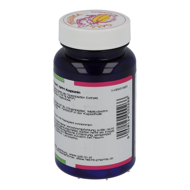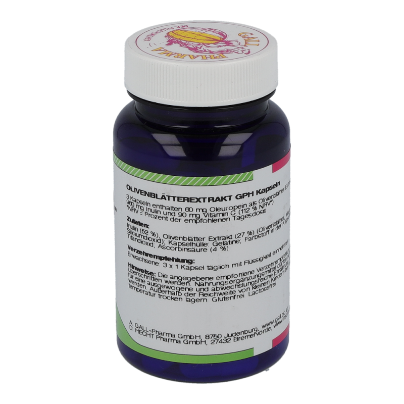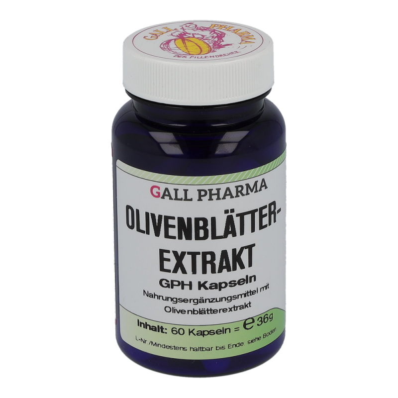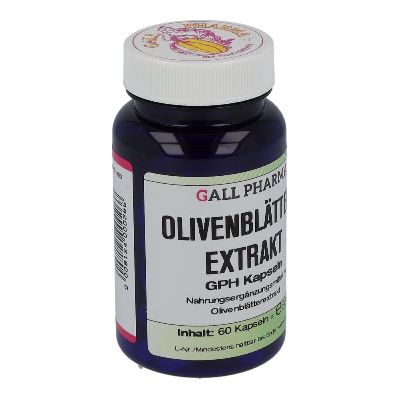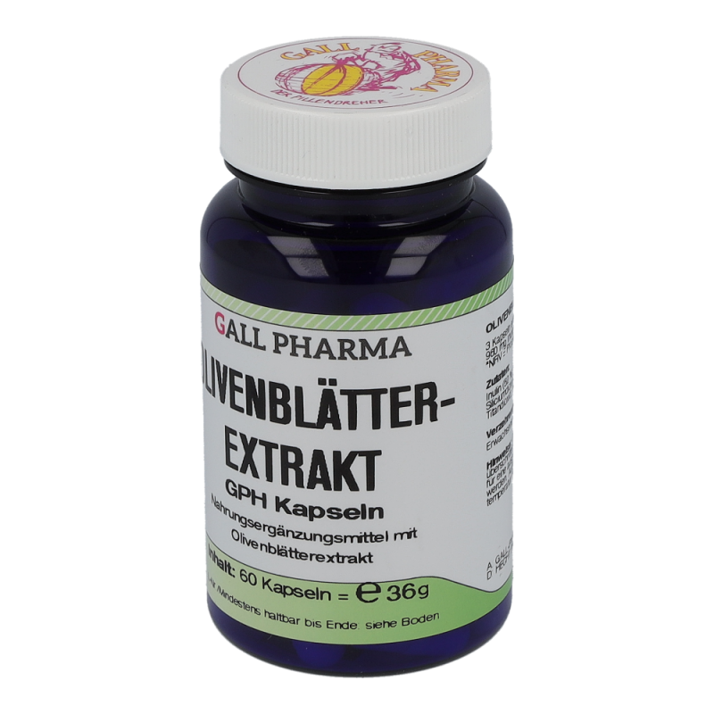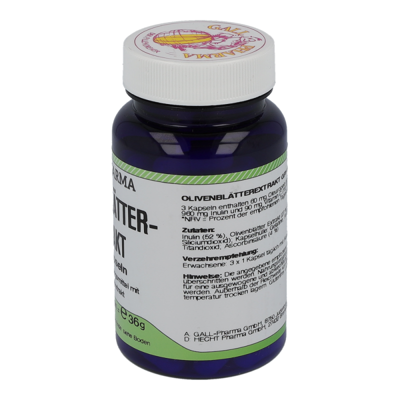 Gall Pharma Olivenblätter Extrakt Kapseln enthalten standardisierten Olivenblätterextrakt entsprechend etwa 830 mg Olivenblättern und 20 mg Oleuropein in einer Hartgelatinekapsel. Oleuropein und andere wertvolle Verbindungen der Blätter haben einen positiven Einfluss auf Herz und Gefäße, den Blutdruck und die Fließeigenschaften des Blutes.