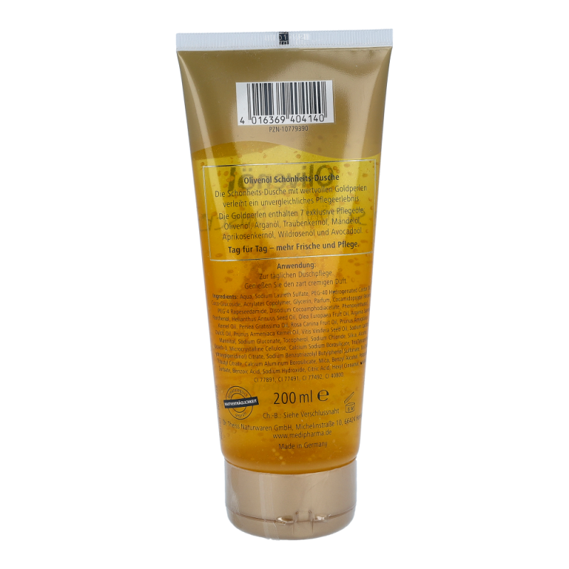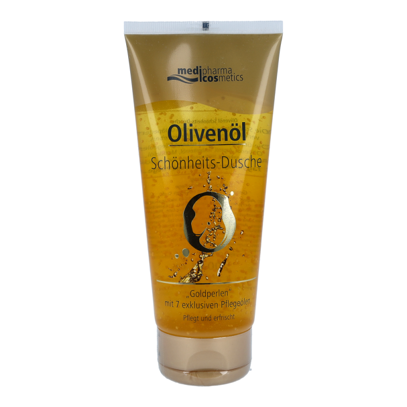 Olivenöl Schönheitsdusche mit wertvollen Goldperlen verleiht ein unvergleichliches Pflegeerlebnis. Die Goldperlen enthalten 7 exklusive Pflegeöle: Olivenöl, Arganöl, Traubenkernöl, Mandelöl, Aprikosenkernöl, Wildrosenöl und Avocadoöl. Das Produkt pflegt und erfrischt Tag für Tag.