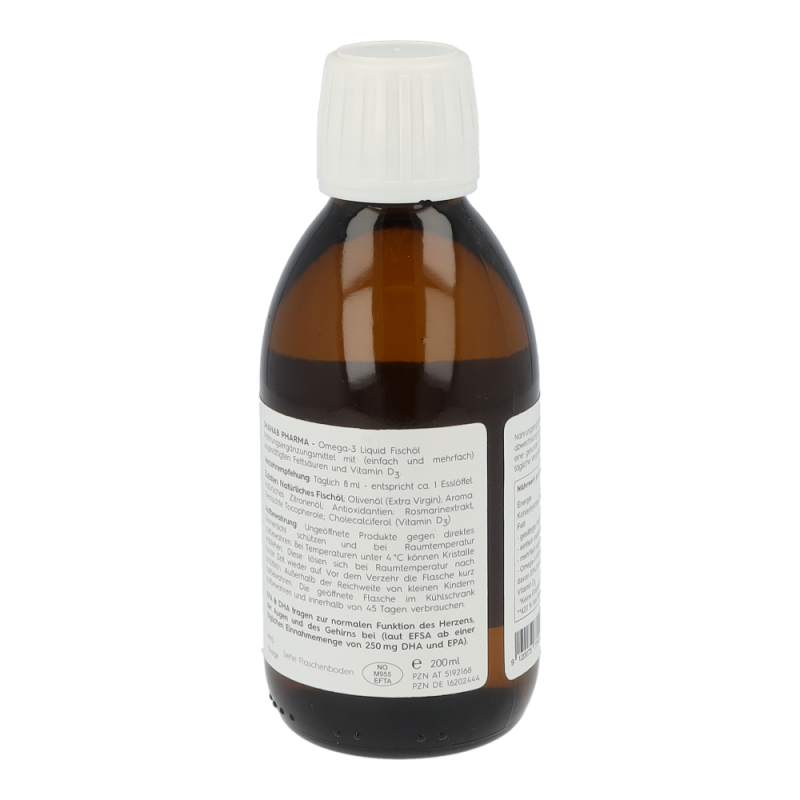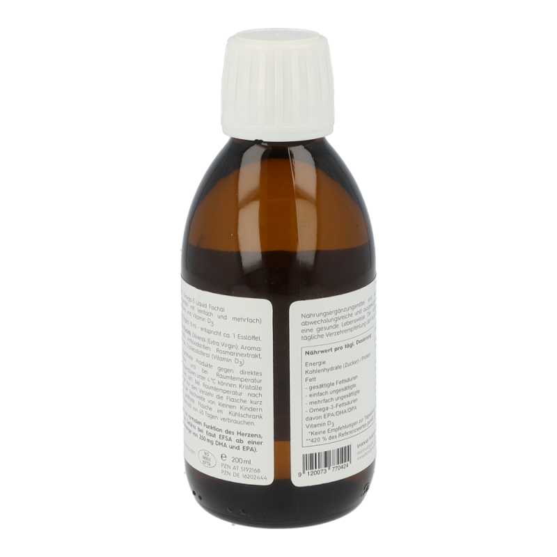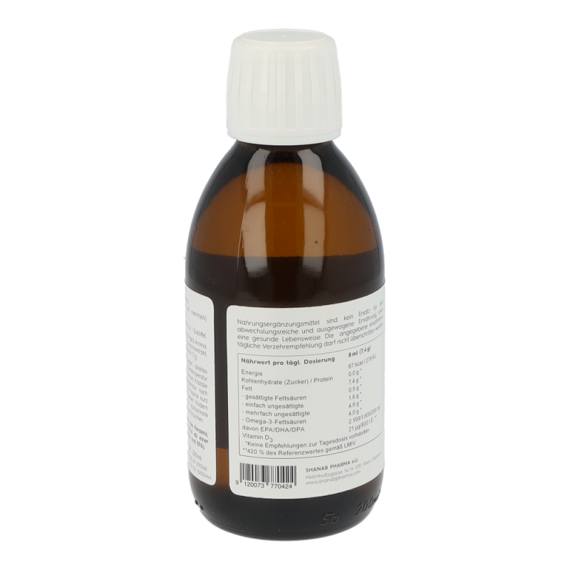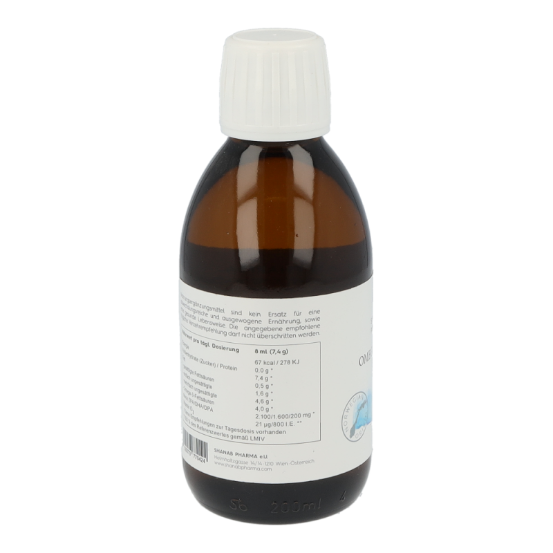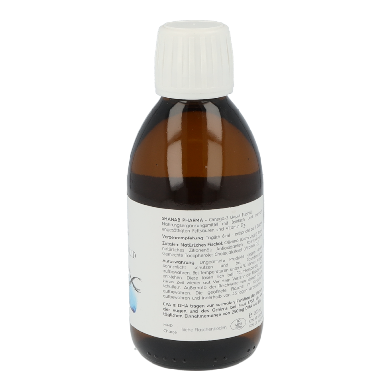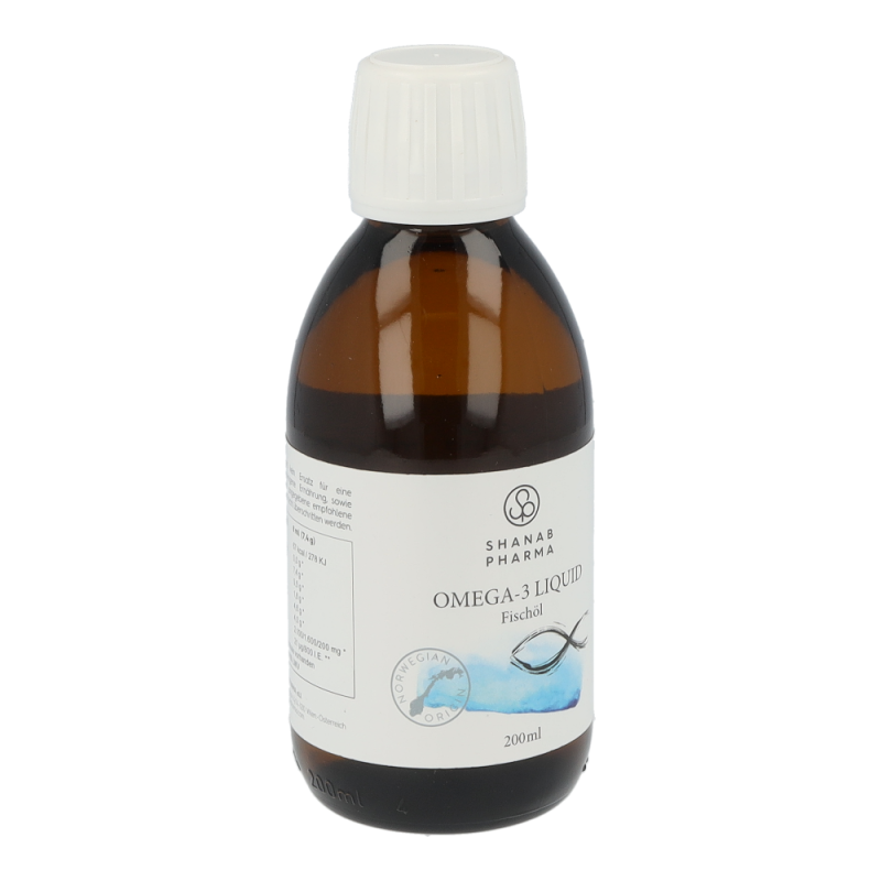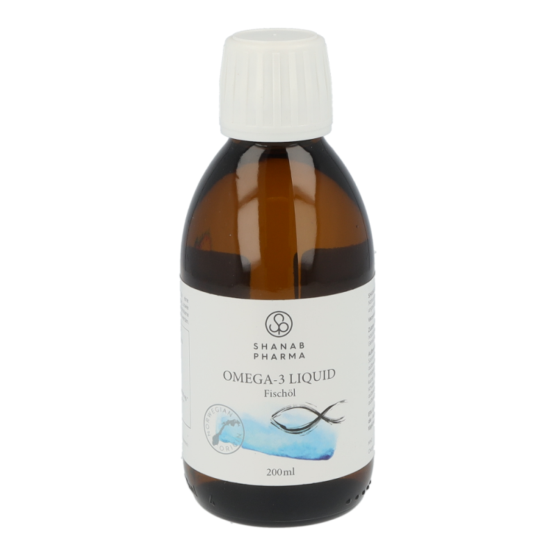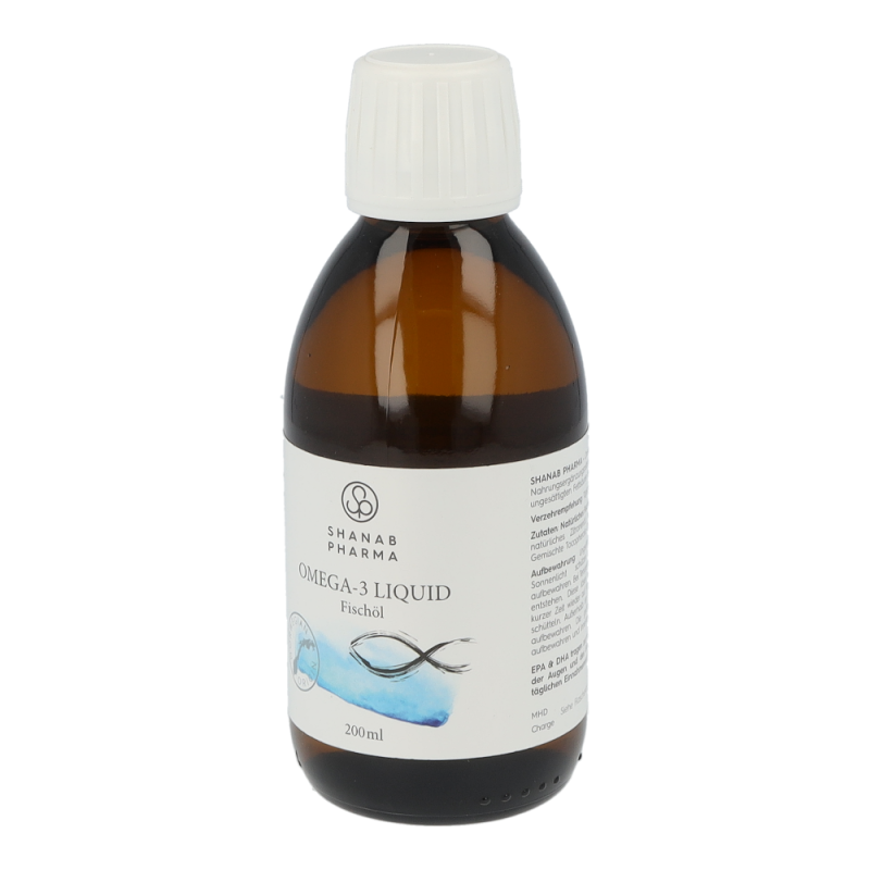 Shanab Pharma Omega-3 liquid Fischöl ist hochdosiert und enthält eine einzigartige Kombination aus einem konzentrierten, gereinigten, hochdosierten Fischöl aus Wildfang und einem kaltgepressten Olivenöl. EPA & DHA tragen zur einer normalen Funktion des Herzens, der Augen und des Gehirns bei (laut EFSA ab einer täglich Einnahmemenge von 250 mg DHA und EPA).